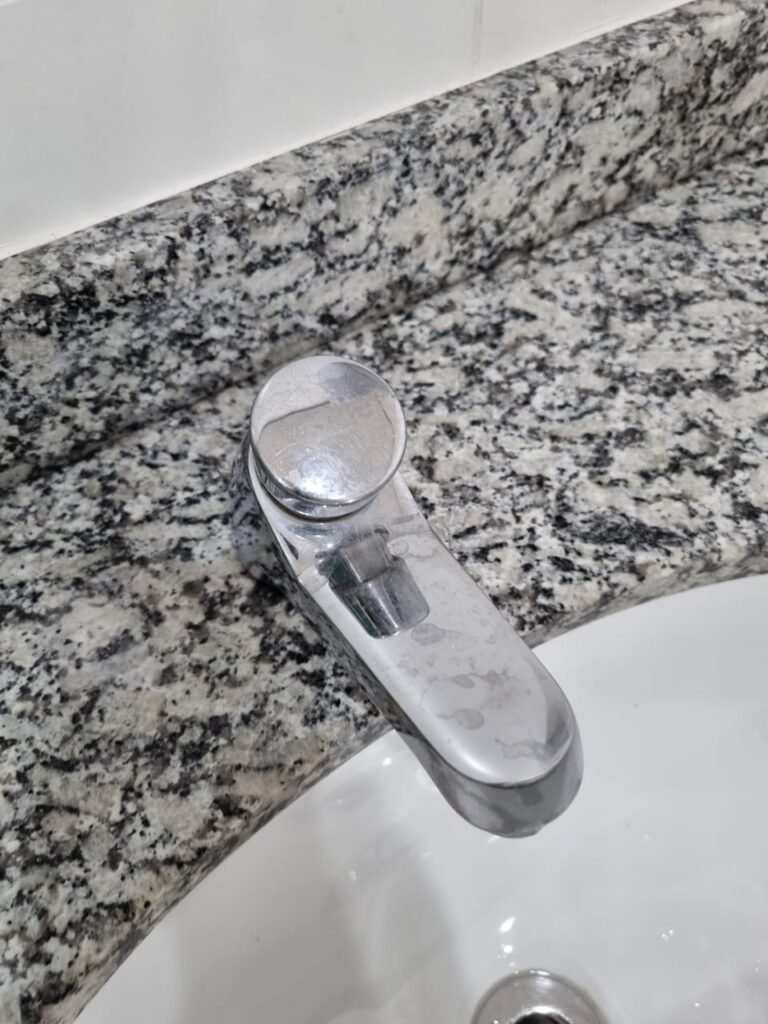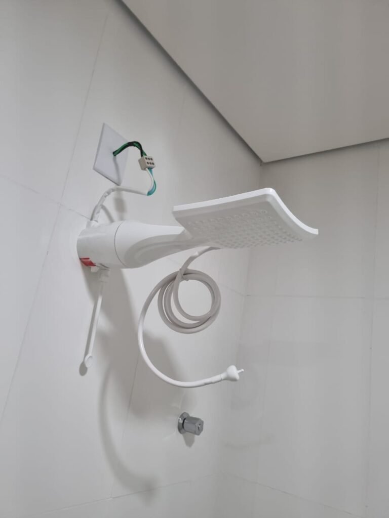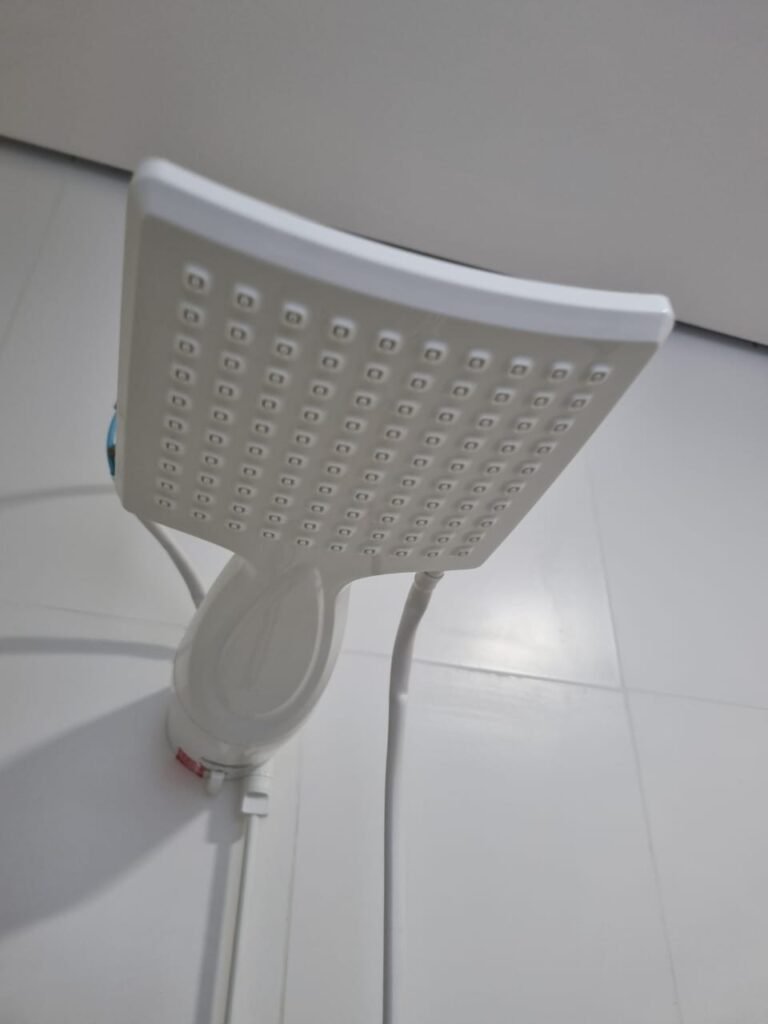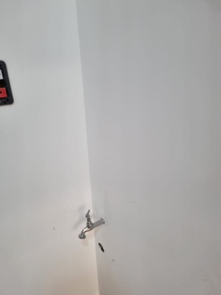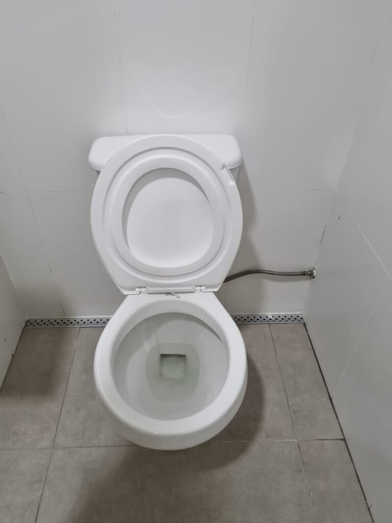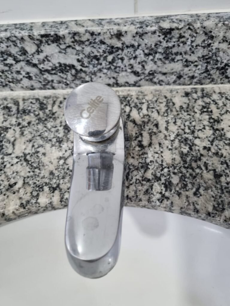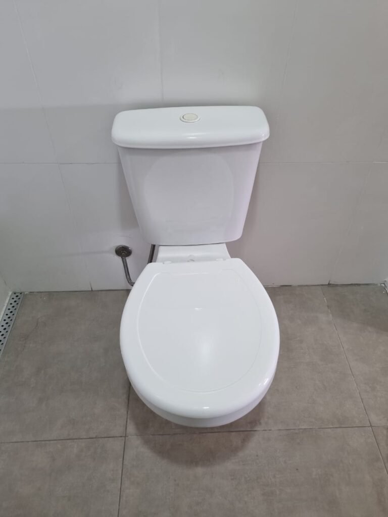W.C MASCULINO:- Porta de madeira envernizada em ordem, maçanetas em ordem, fechadura e chave em ordem, piso porcelanato em ordem, azulejo até o teto, 01 mictório Deca cerâmica branca em ordem, descarga em ordem, pia mármore em ordem, 02 cubas cerâmica em ordem, 02 torneiras Celite, 02 sifão universal sanfonado em ordem, 02 divisórias com portas em ordem, maçanetas em ordem, 01 conjunto vaso sanitário e caixa acoplada descarga em ordem, tampa plástico em ordem, 01 chuveiro Lorenzetti Loren shower em ordem, 01 ralo tipo grelha em ordem.