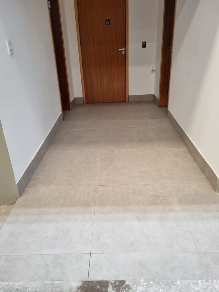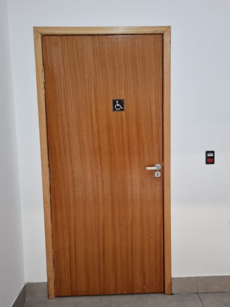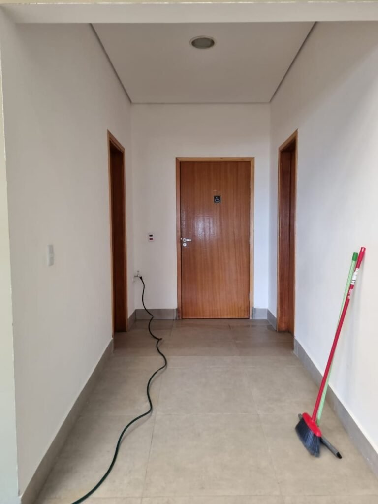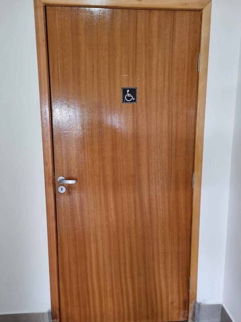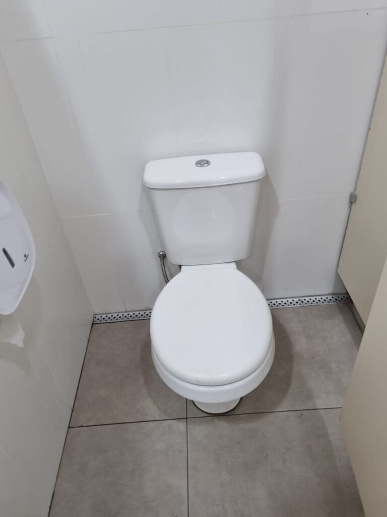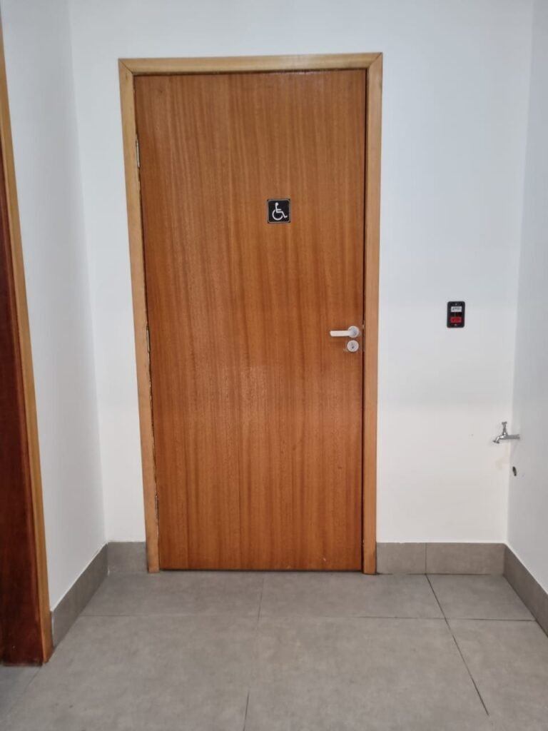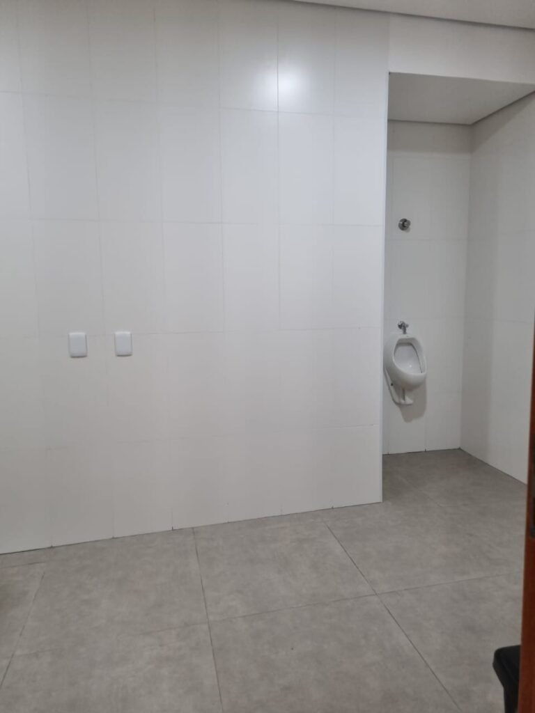 W.C MASCULINO:- Porta de madeira envernizada em ordem, maçanetas em ordem, fechadura e chave em ordem, piso porcelanato em ordem, azulejo até o teto, 01 mictório Deca cerâmica branca em ordem, descarga em ordem, pia mármore em ordem, 02 cubas cerâmica em ordem, 02 torneiras Celite, 02 sifão universal sanfonado em ordem, 03 divisórias com 03 portas em ordem, maçanetas em ordem, 02 conjuntos vaso sanitário e caixa acoplada descarga em ordem, tampa plástico em ordem, 01 chuveiro Lorenzetti Loren shower em ordem, 01 ralo tipo grelha em ordem, 04 lustres embutidos com lâmpadas de LED em ordem, 02 bidês com 02 divisórias de madeira em ordem, 02 vitrôs basculante com vidros em ordem.