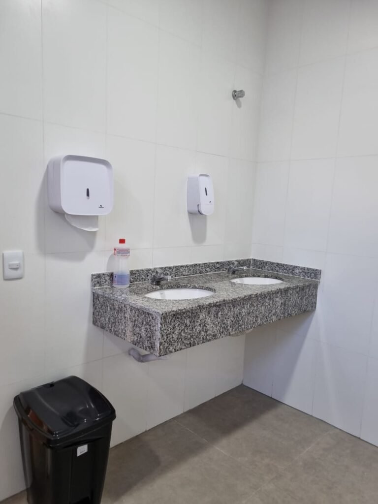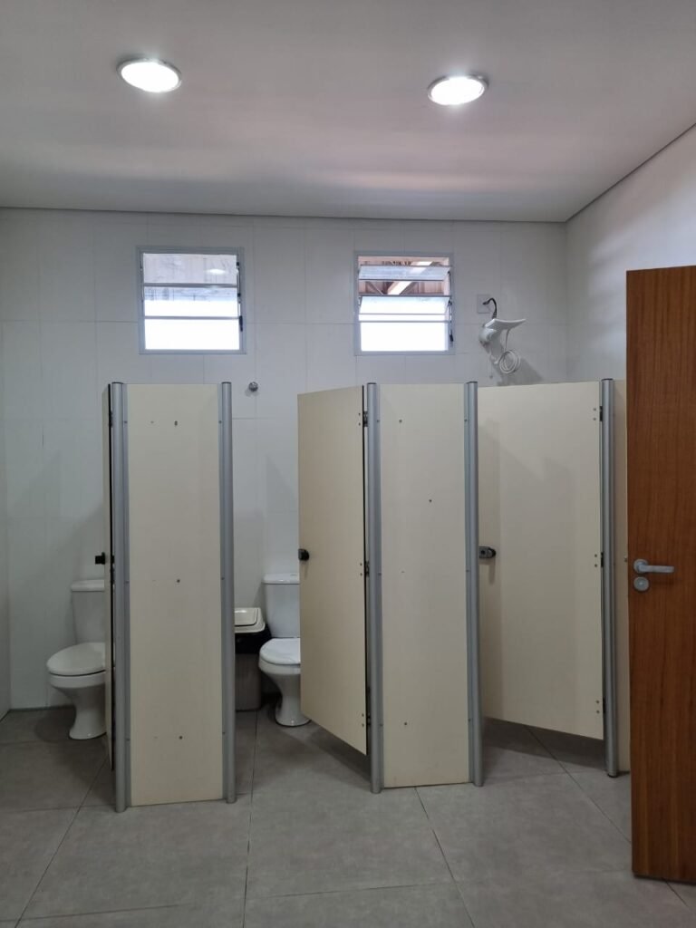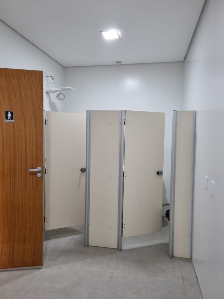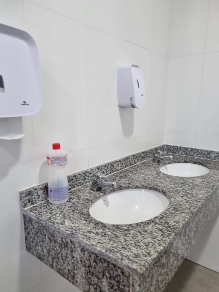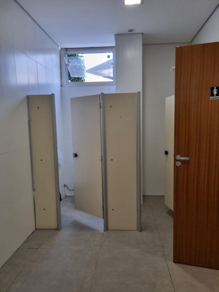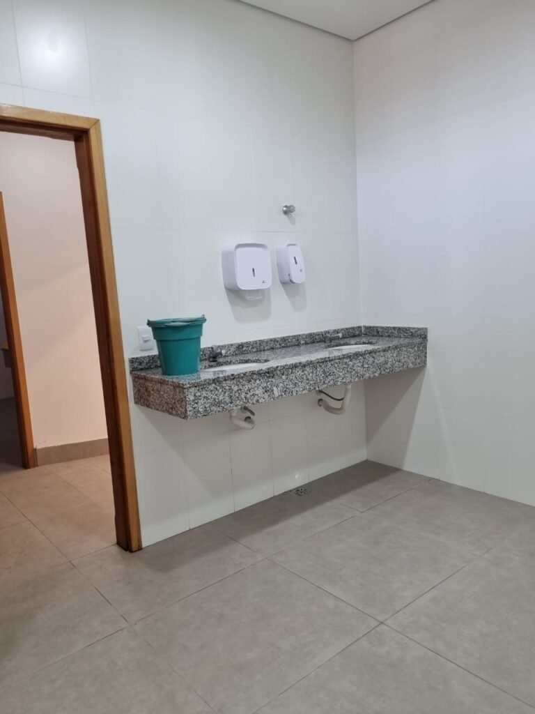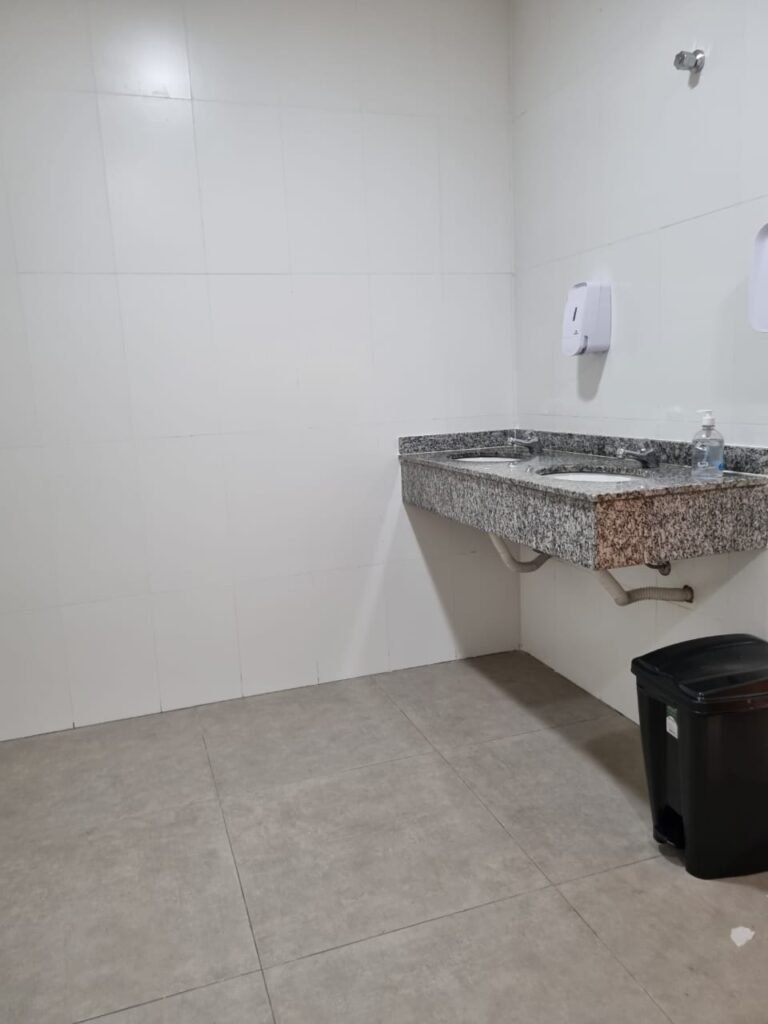 W.C FEMININO:- Porta de madeira envernizada e nova em ordem, fechadura e chaves em ordem, piso porcelanato em ordem, pia mármore em ordem, 02 cubas cerâmica branca Deca em ordem, 02 torneiras Celite em ordem, 02 sifão sanfonado universal em ordem, azulejo até o teto em ordem, 04 lustres embutidos com lâmpadas de LED em ordem, 02 vitrôs basculante com vidro blindex em ordem, trava em ordem, 03 Box com 03 portas em ordem, travas em ordem, 01 ralo tipo grade em ordem, 02 conjuntos de vaso sanitário e caixa acoplada de descarga em ordem, tampa de plástico em ordem, 02 registros com canopla em ordem, 01 chuveiro Lorenzetti Loren shower ultra em ordem, 01 interruptor em ordem, espelho de luz em ordem, 03 divisórias com 03 portas em ordem, maçanetas em ordem.