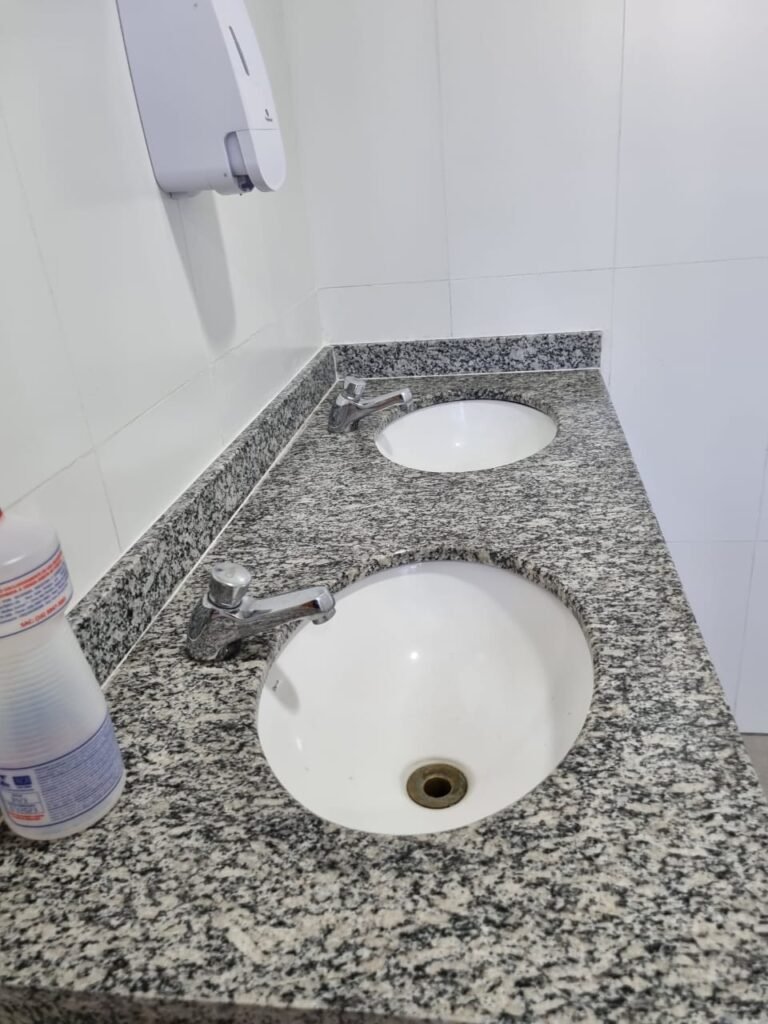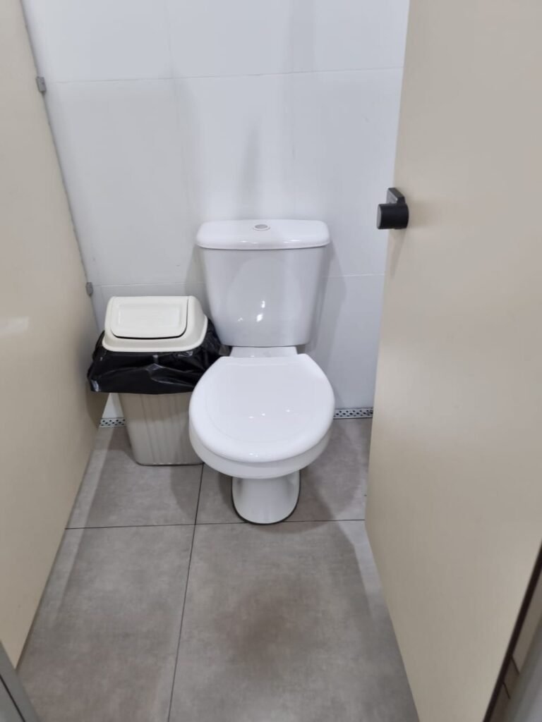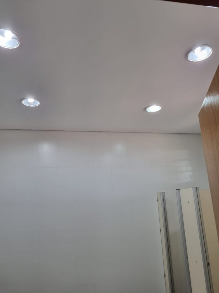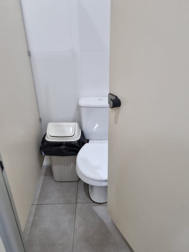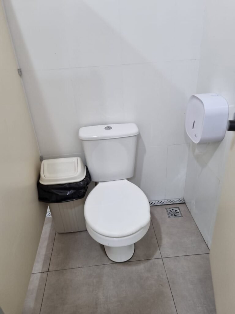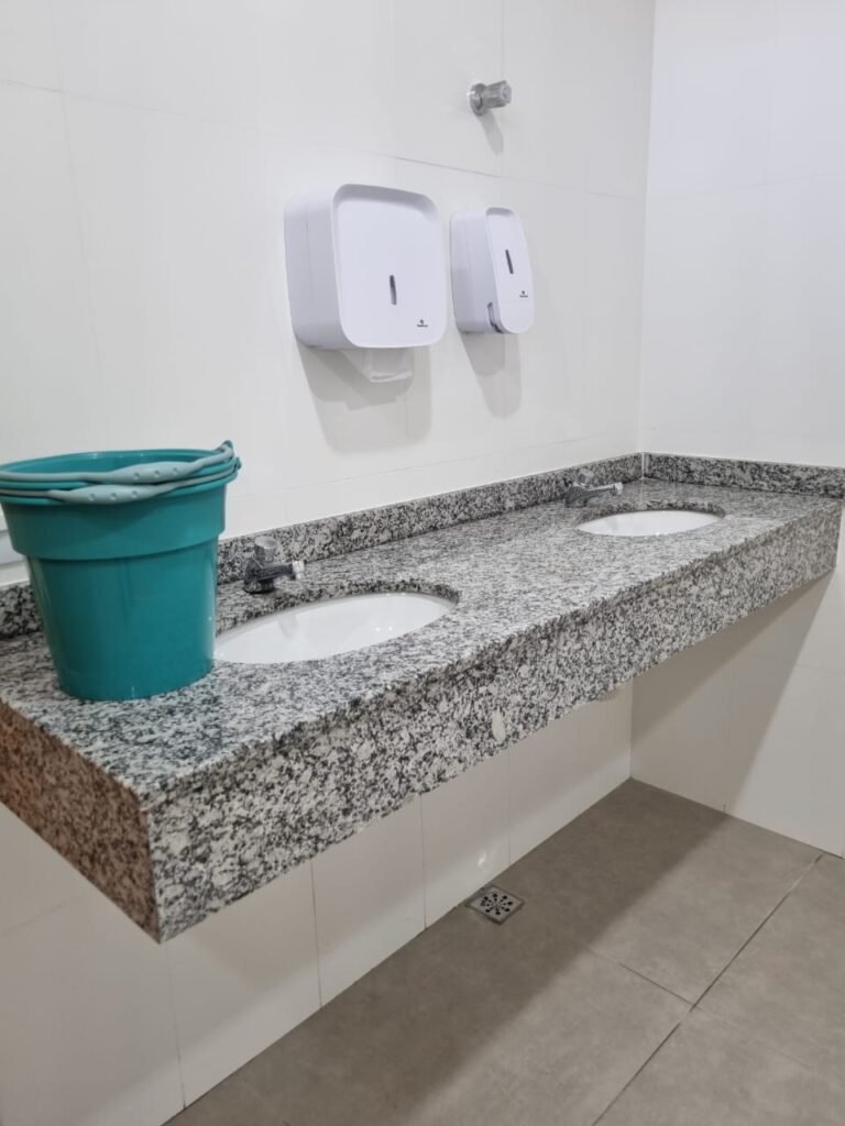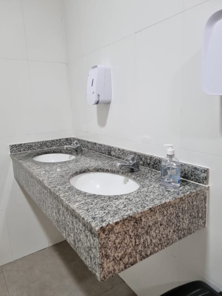 W.C FEMININO:- Porta de madeira envernizada e nova em ordem, fechadura e chaves em ordem, piso porcelanato em ordem, pia mármore em ordem, 02 cubas cerâmica branca Deca em ordem, 02 torneiras Celite em ordem, 02 sifão sanfonado universal em ordem, azulejo até o teto em ordem, 04 lustres embutidos com lâmpadas de LED em ordem, 02 vitrôs basculante com vidro blindex em ordem, trava em ordem, 03 Box com 03 portas em ordem, travas em ordem, 01 ralo tipo grade em ordem, 02 conjuntos de vaso sanitário e caixa acoplada de descarga em ordem, tampa de plástico em ordem, 02 registros com canopla em ordem, 01 chuveiro Lorenzetti Loren shower ultra em ordem, 01 interruptor em ordem, espelho de luz em ordem, 03 divisórias com 03 portas em ordem, maçanetas em ordem.
