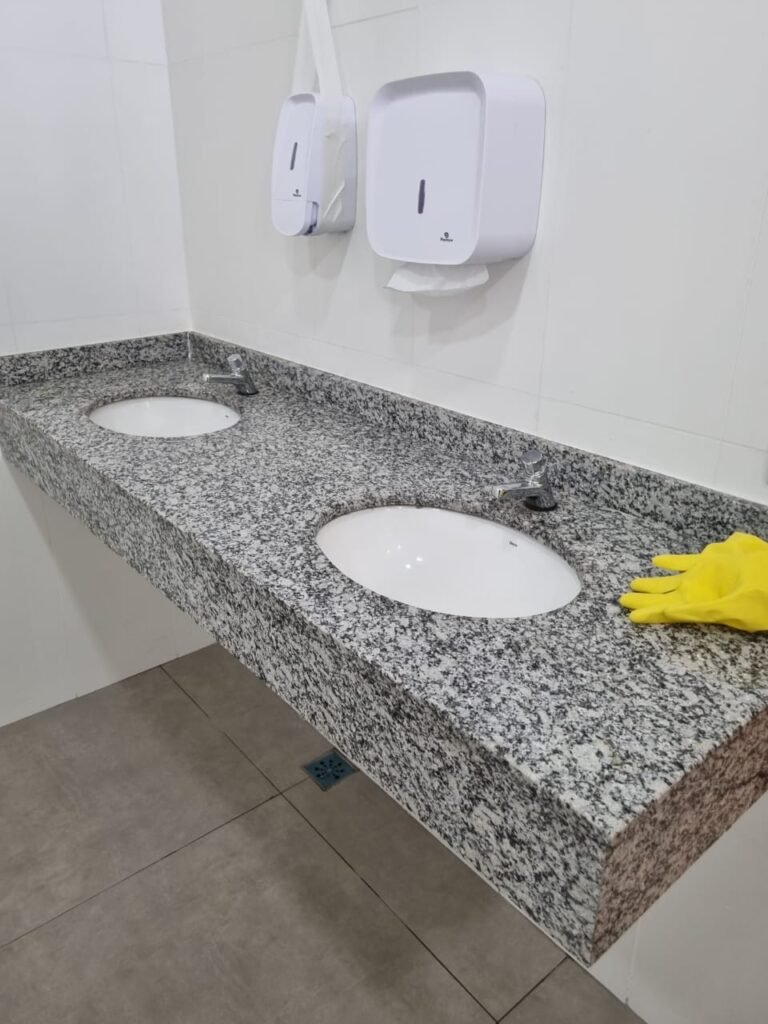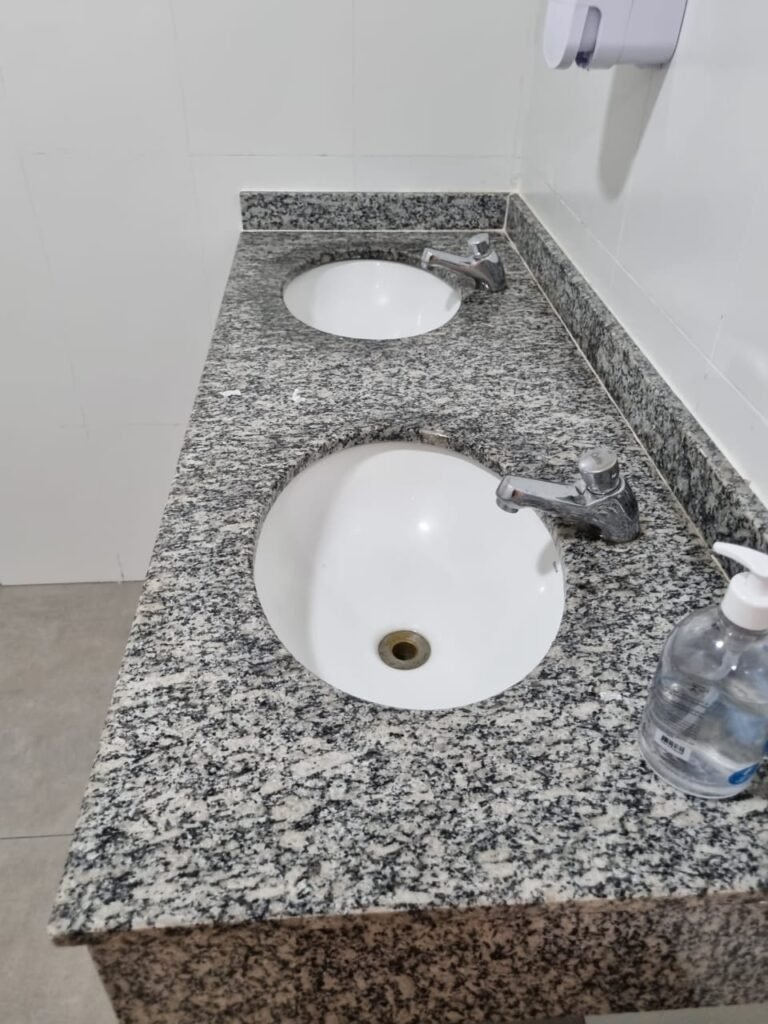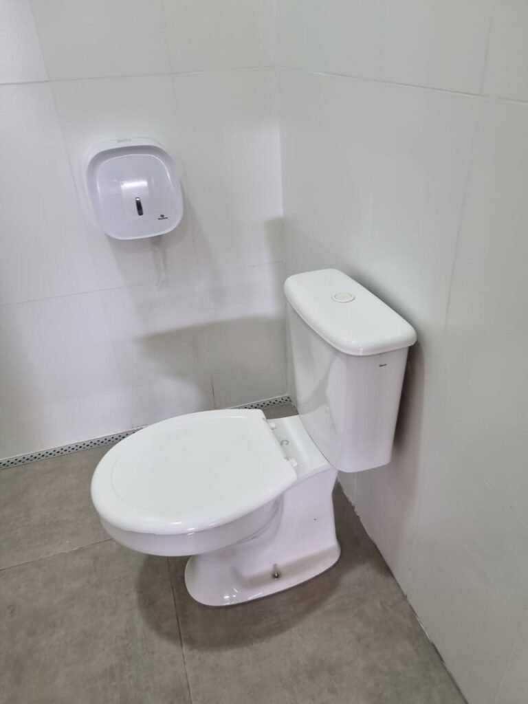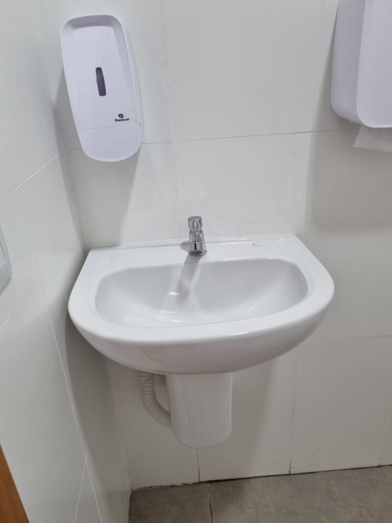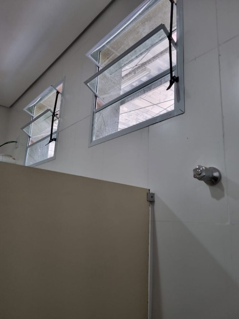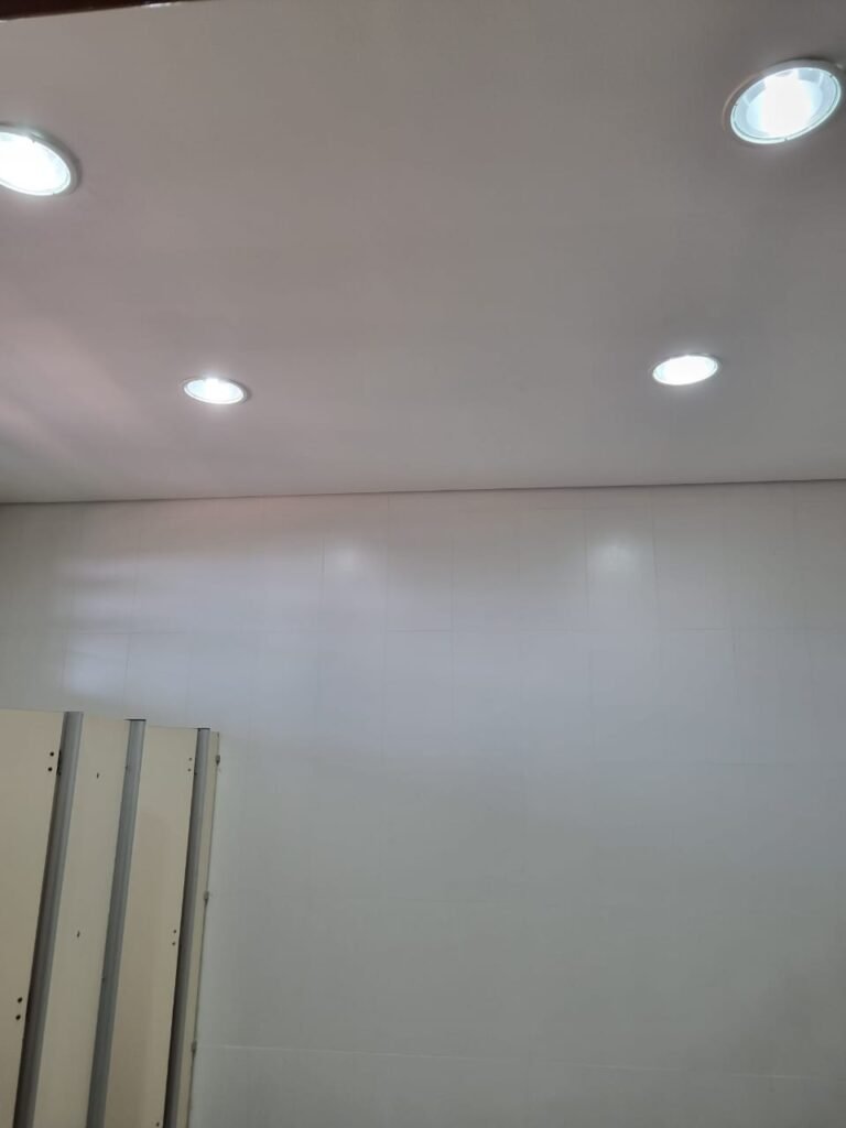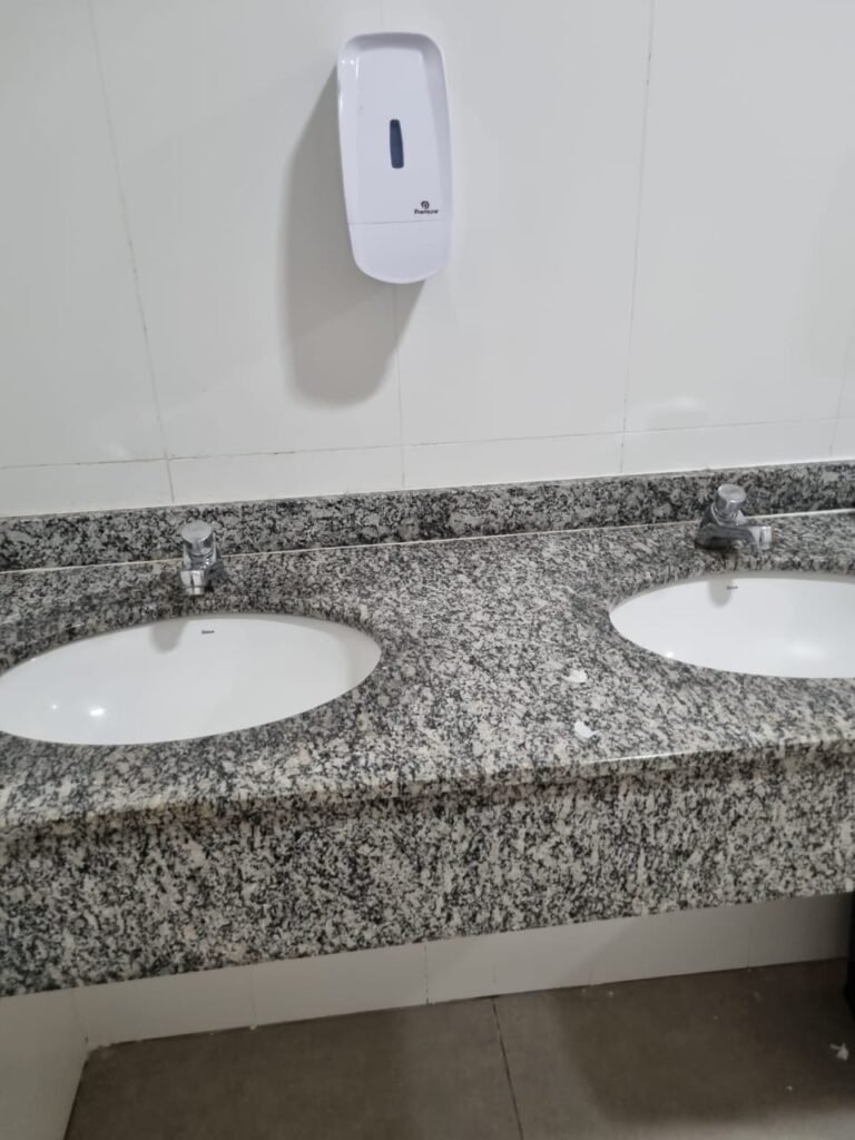 W.C FEMININO:- Porta de madeira envernizada e nova em ordem, fechadura e chaves em ordem, piso porcelanato em ordem, pia mármore em ordem, 02 cubas cerâmica branca Deca em ordem, 02 torneiras Celite em ordem, 02 sifão sanfonado universal em ordem, azulejo até o teto em ordem, 04 lustres embutidos com lâmpadas de LED em ordem, 02 vitrôs basculante com vidro blindex em ordem, trava em ordem, 03 Box com 03 portas em ordem, travas em ordem, 01 ralo tipo grade em ordem, 02 conjuntos de vaso sanitário e caixa acoplada de descarga em ordem, tampa de plástico em ordem, 02 registros com canopla em ordem, 01 chuveiro Lorenzetti Loren shower ultra em ordem, 01 interruptor em ordem, espelho de luz em ordem, 03 divisórias com 03 portas em ordem, maçanetas em ordem.