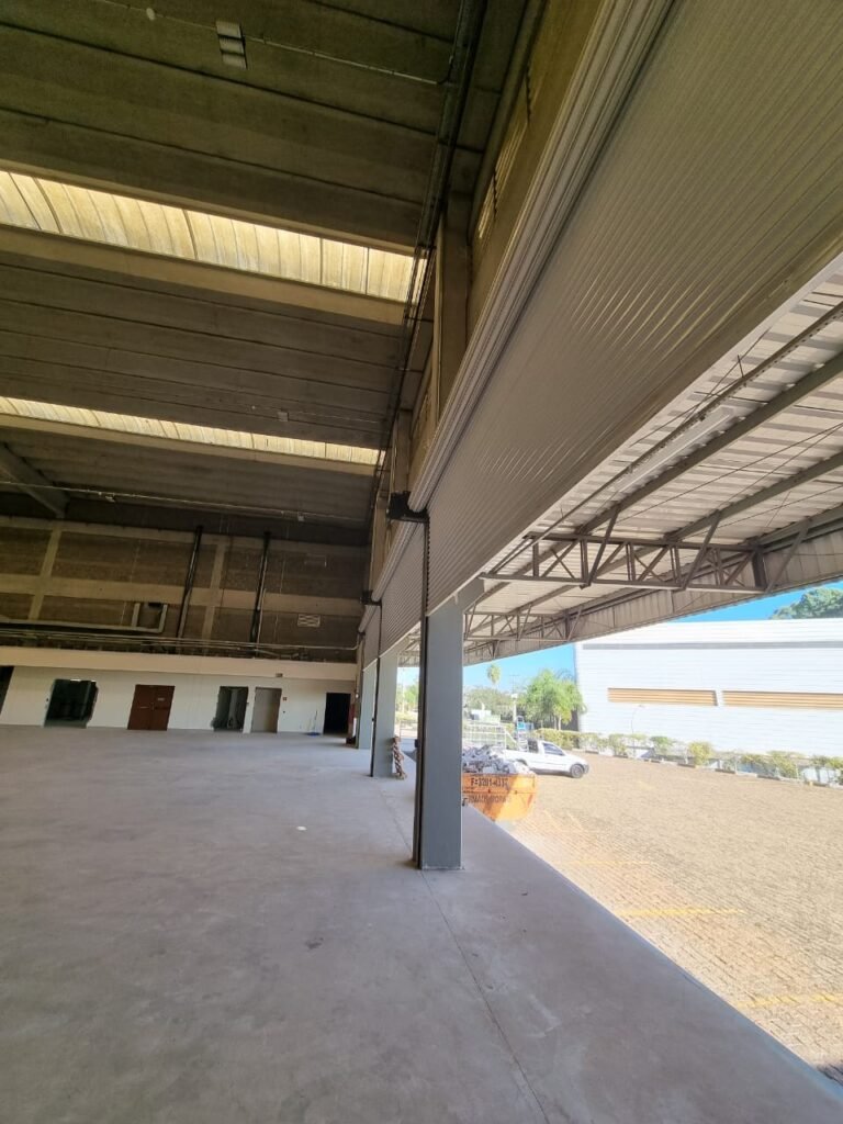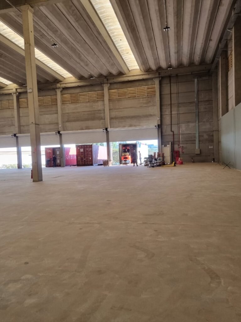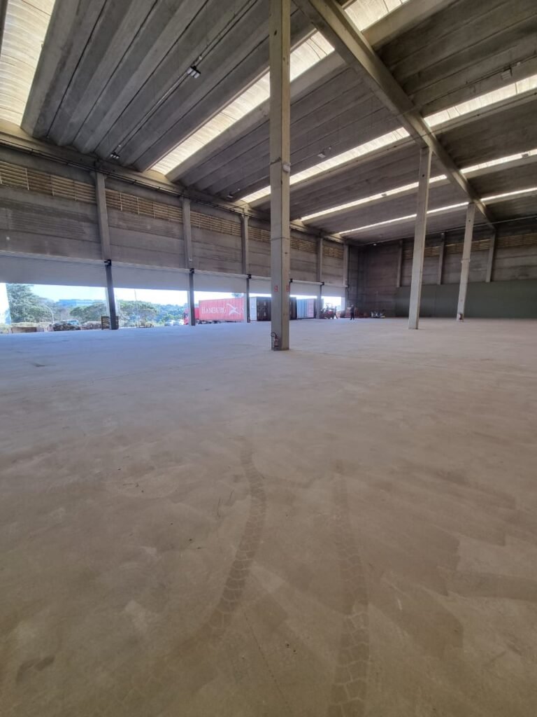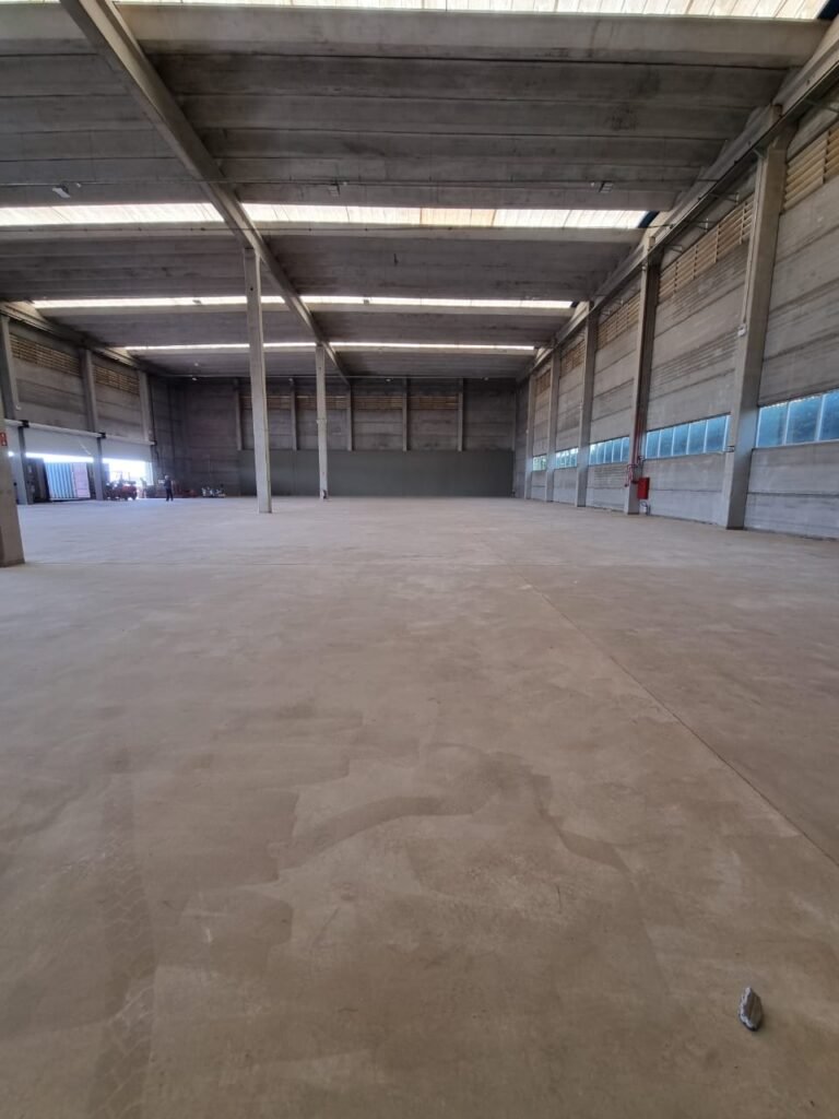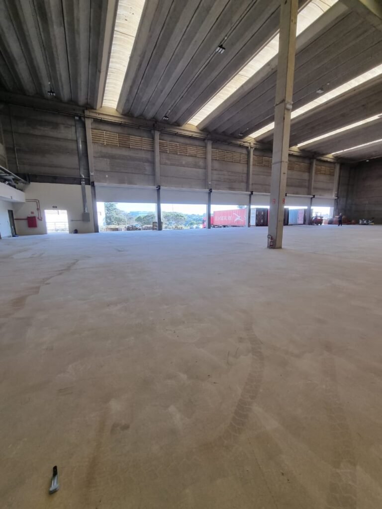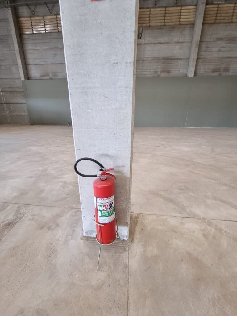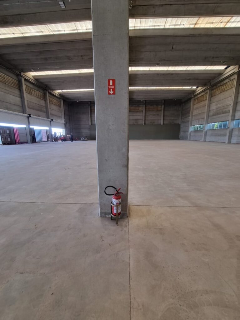 GALPÃO:- Piso concreto usinado e polido em ordem, paredes placas de concreto em ordem, 03 caixas de hidrante com mangueira, chave e bicos em ordem, 06 extintores em ordem sendo 02 água 10 lt 2-A e 04 pó químico 20 B:C, 12 lâmpadas emergência em ordem, 36 vidros lisos transparentes em ordem, 24 luminárias tripla em ordem, 07 portas automatizadas e motor e baterias em ordem, parede divisória com pintura nova na cor concreto, 01 porta de madeira envernizada, maçanetas em ordem, fechadura e chave Yale em ordem.