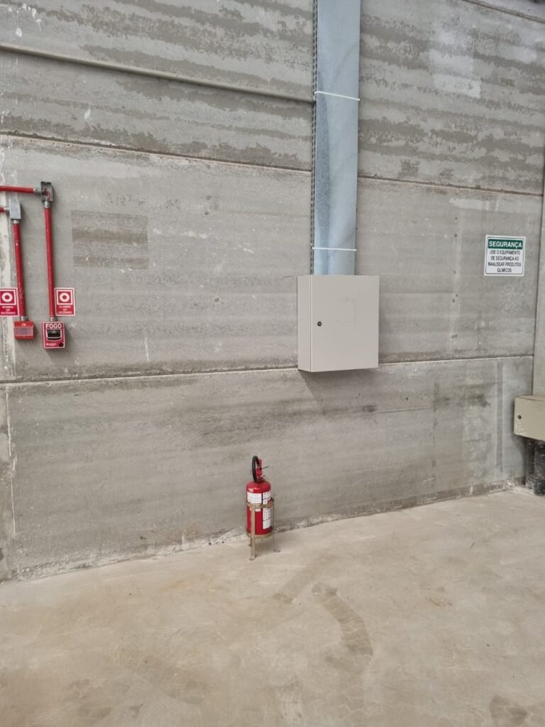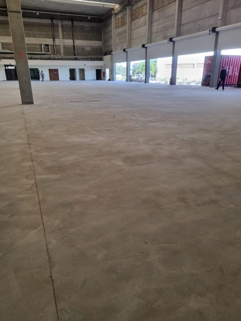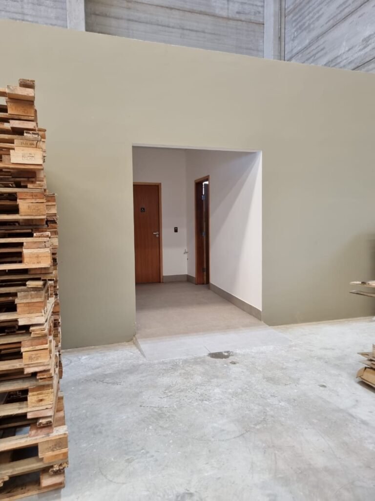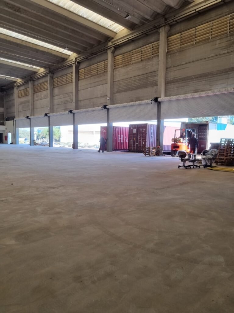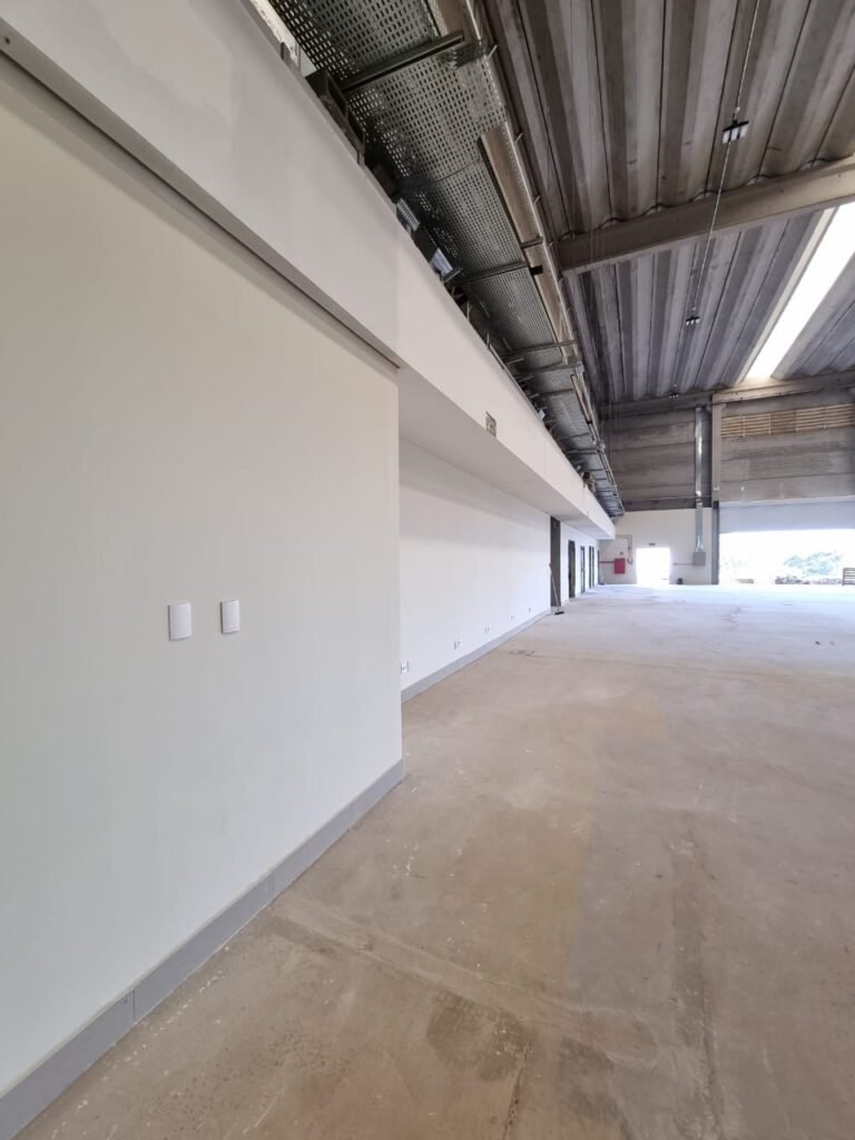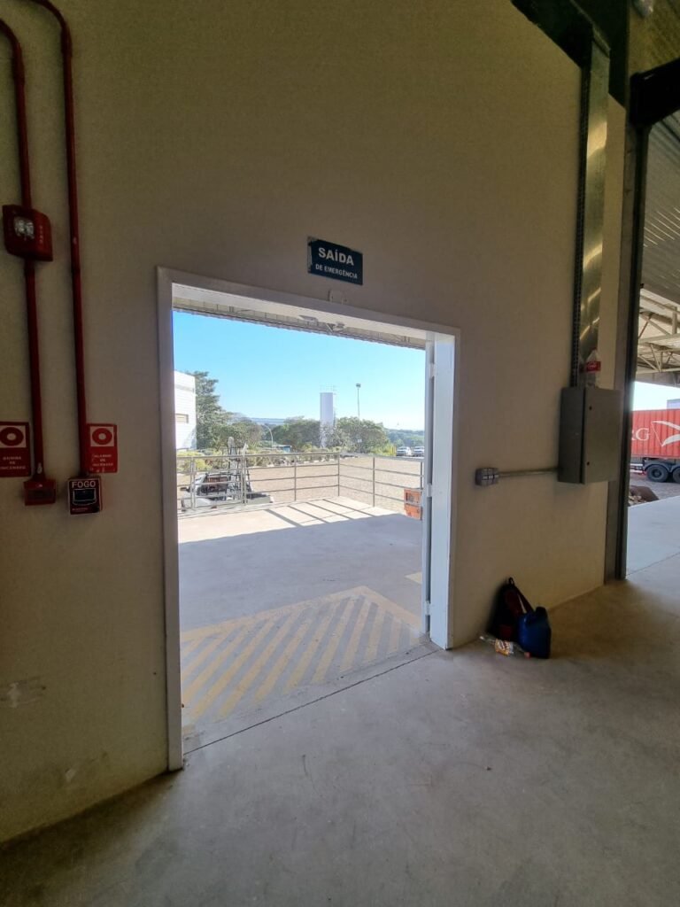 GALPÃO:- Piso concreto usinado e polido em ordem, paredes placas de concreto em ordem, 03 caixas de hidrante com mangueira, chave e bicos em ordem, 06 extintores em ordem sendo 02 água 10 lt 2-A e 04 pó químico 20 B:C, 12 lâmpadas emergência em ordem, 36 vidros lisos transparentes em ordem, 24 luminárias tripla em ordem, 07 portas automatizadas e motor e baterias em ordem, parede divisória com pintura nova na cor concreto, 01 porta de madeira envernizada, maçanetas em ordem, fechadura e chave Yale em ordem.
