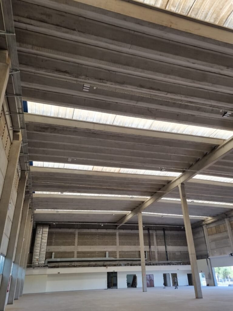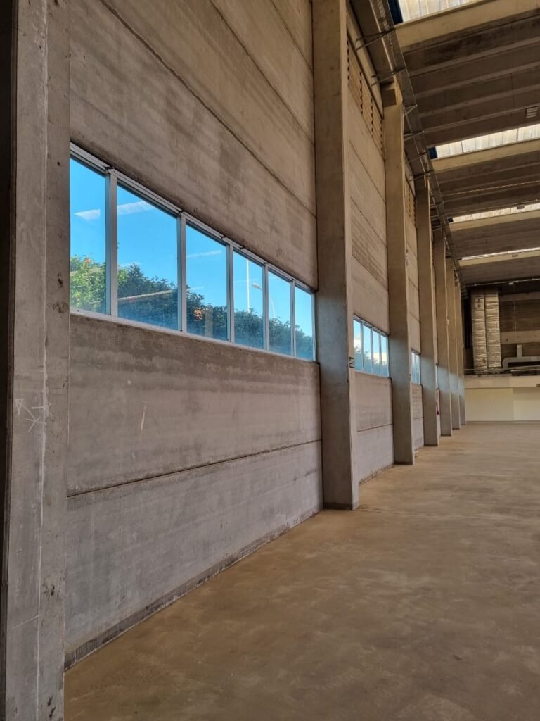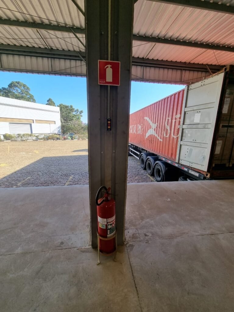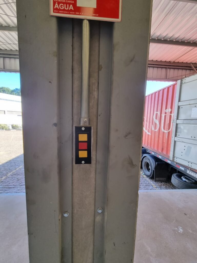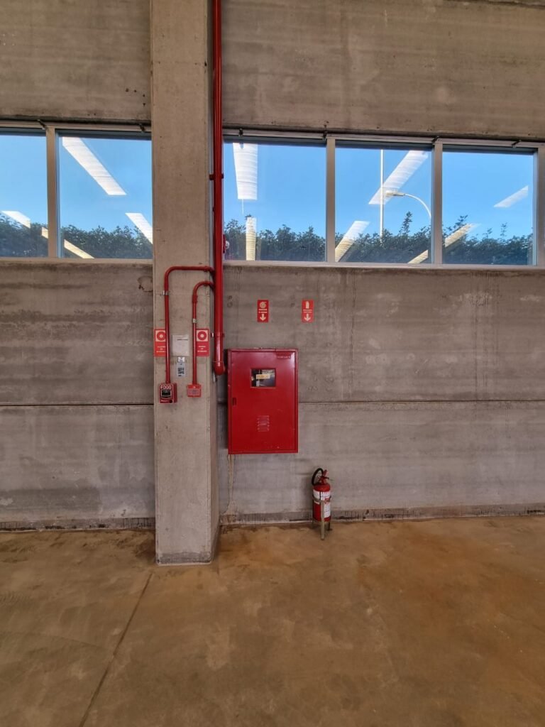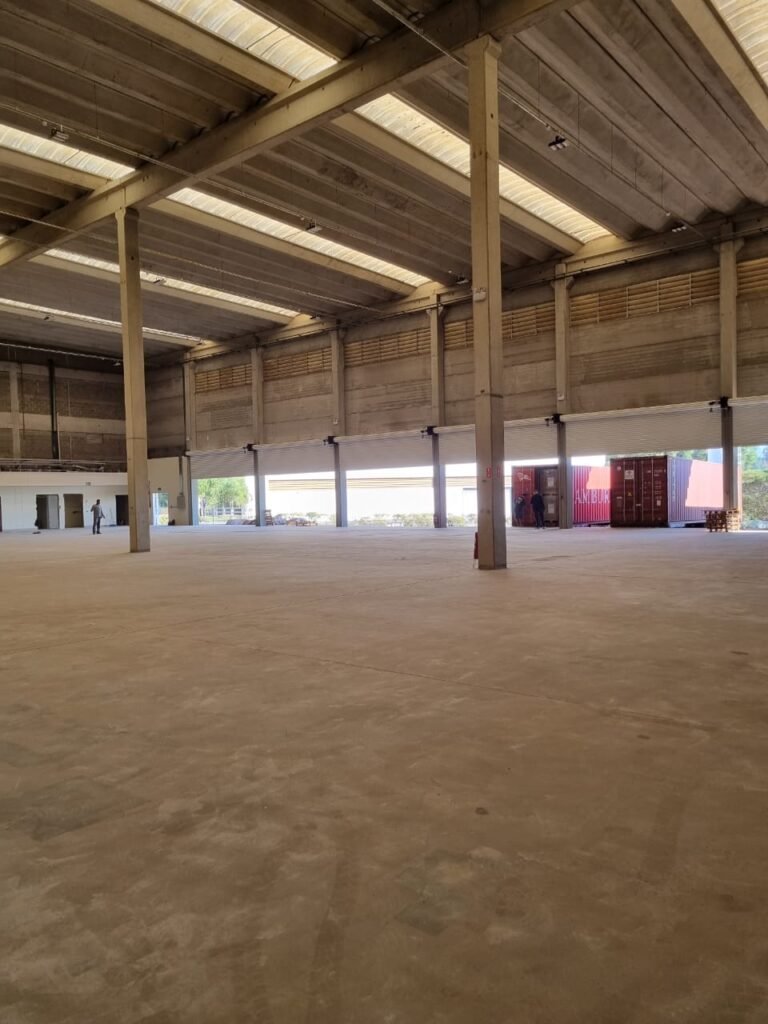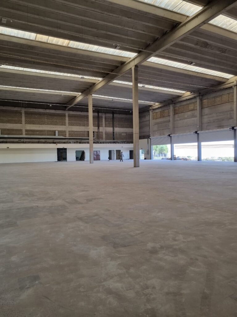 GALPÃO:- Piso concreto usinado e polido em ordem, paredes placas de concreto em ordem, 03 caixas de hidrante com mangueira, chave e bicos em ordem, 06 extintores em ordem sendo 02 água 10 lt 2-A e 04 pó químico 20 B:C, 12 lâmpadas emergência em ordem, 36 vidros lisos transparentes em ordem, 24 luminárias tripla em ordem, 07 portas automatizadas e motor e baterias em ordem, parede divisória com pintura nova na cor concreto, 01 porta de madeira envernizada, maçanetas em ordem, fechadura e chave Yale em ordem.
