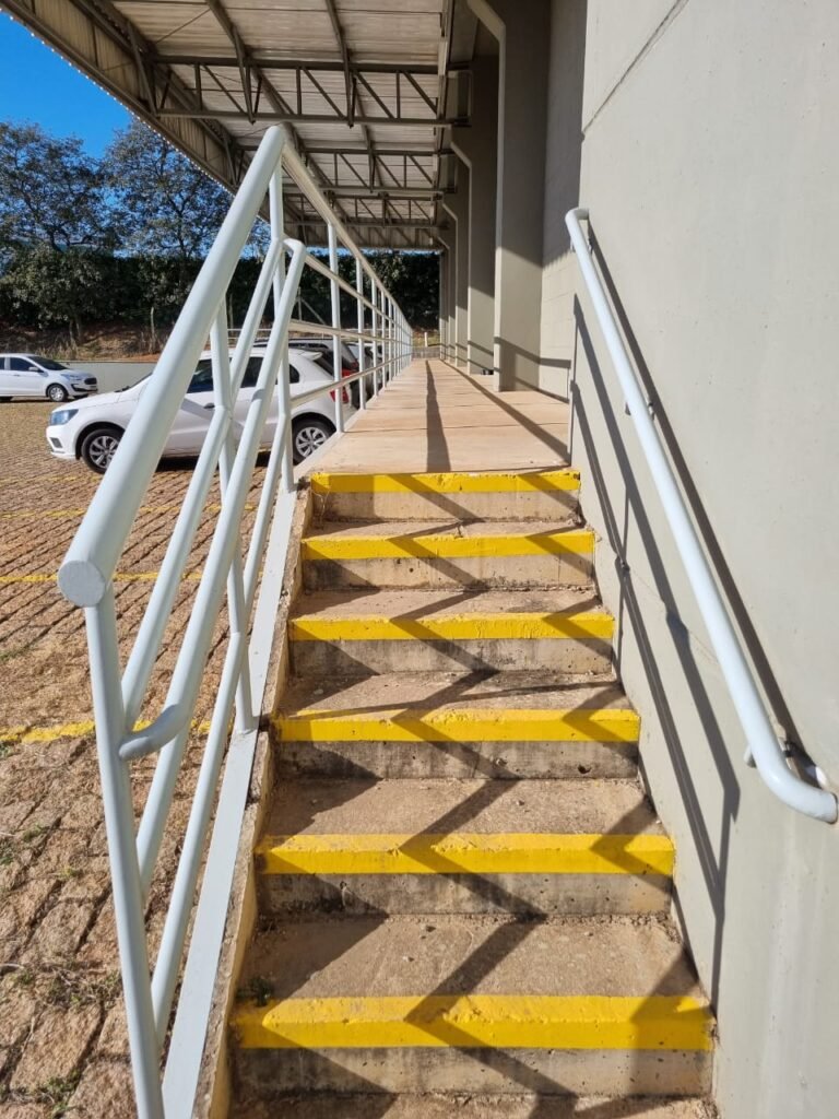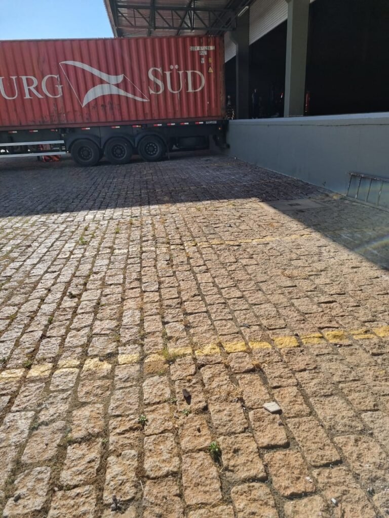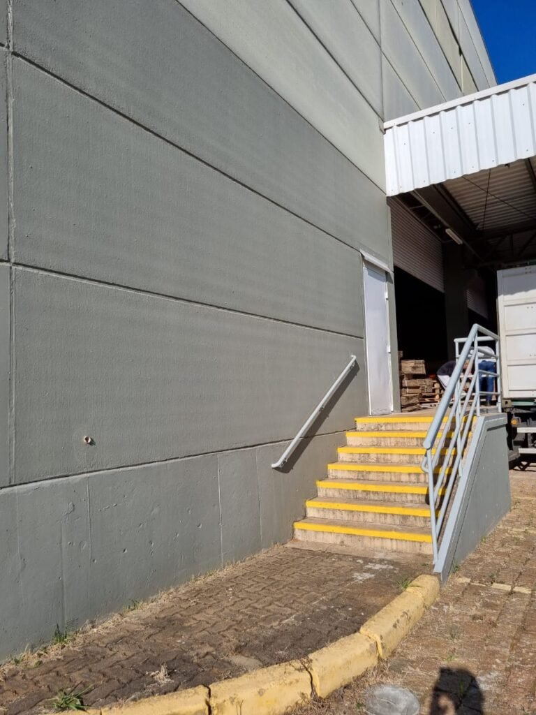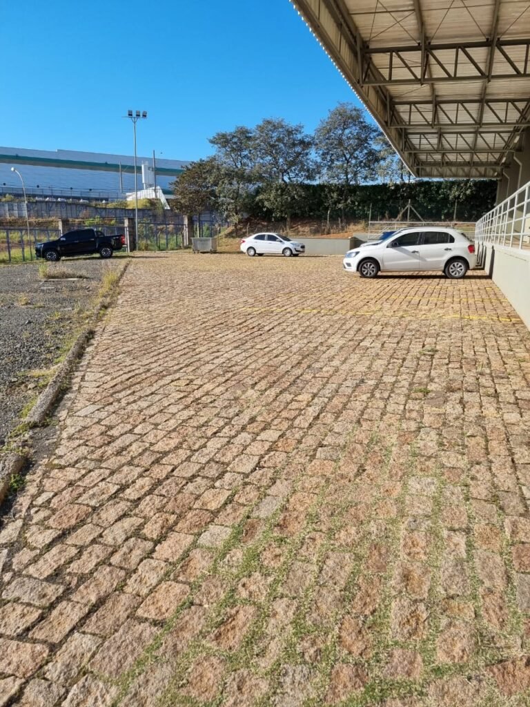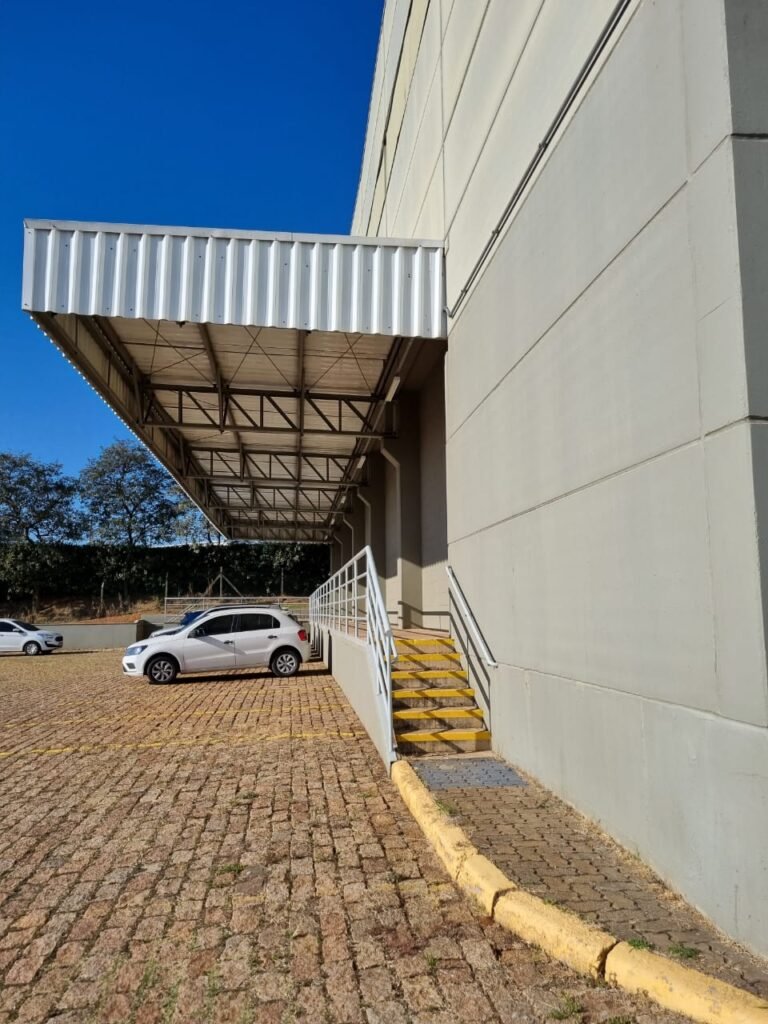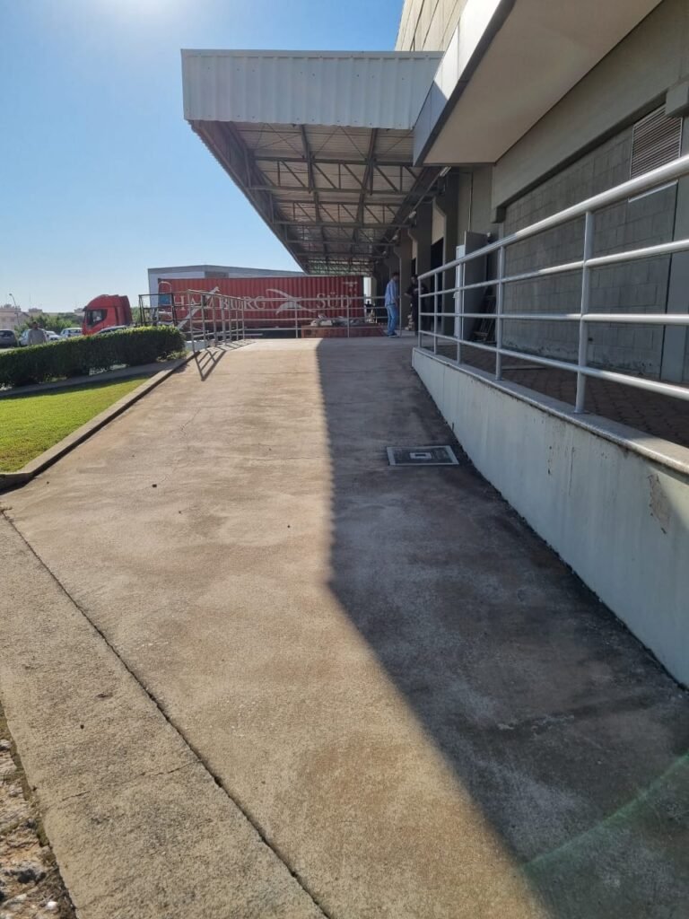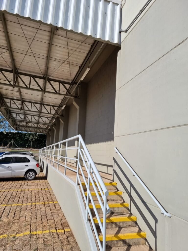 PATIO:- Piso paralelepípedo com demarcações de vagas em amarelo, rampa de acesso e guarda corpo em ordem, paredes das docas com pintura na cor cinza nova em ordem, 07 luminárias LED em ordem, marquise estrutura metálica com pintura na cor cinza nova em ordem, telhas galvanizadas com pintura na cor branco em ordem, 02 portas corta fogo com pintura nova na cor branco em ordem, 07 portas de aço com pintura nova na cor branco neve em ordem, 01 torneira de jardim, marquise fundos estrutura metálica com pintura na cor cinza nova em ordem, 05 luminárias, guarda corpo e escada alvenaria.