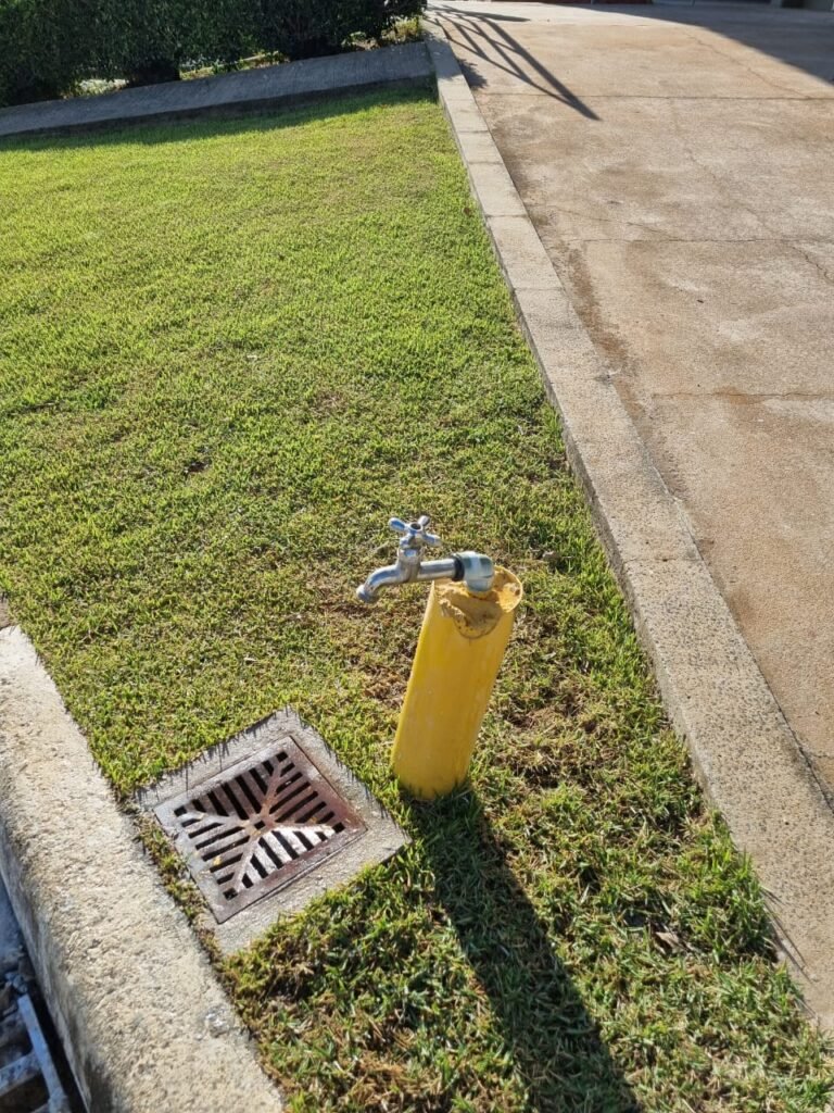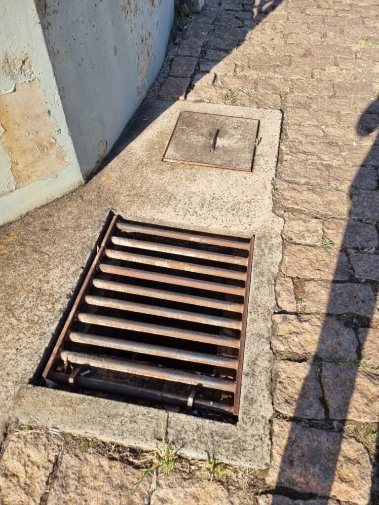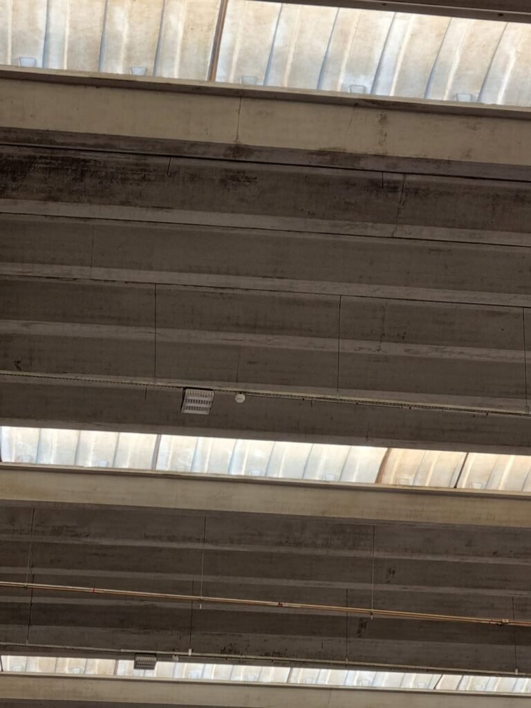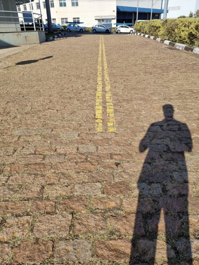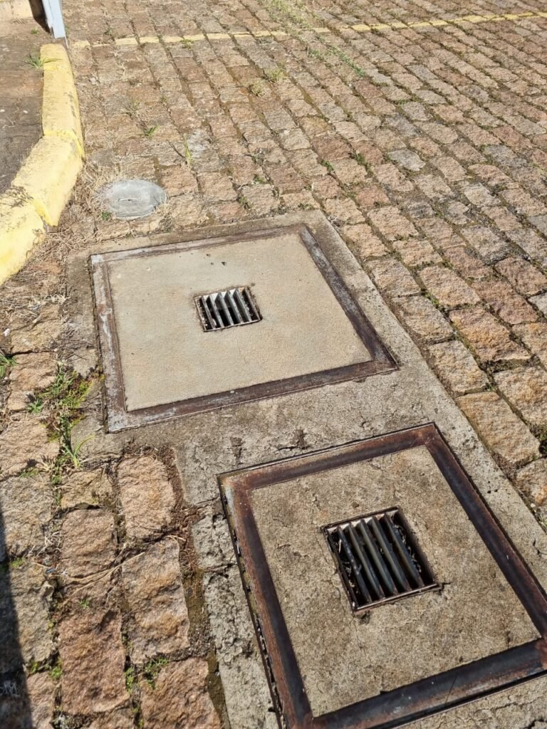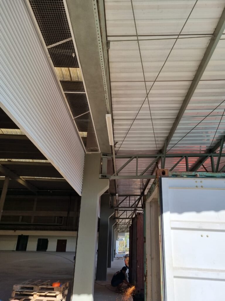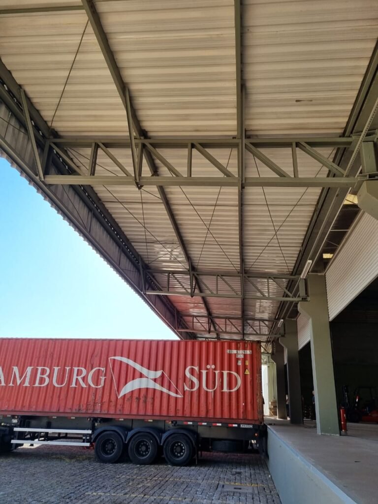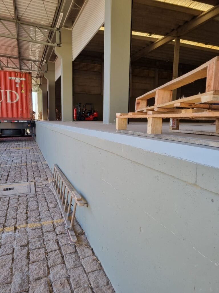 PATIO:- Piso paralelepípedo com demarcações de vagas em amarelo, rampa de acesso e guarda corpo em ordem, paredes das docas com pintura na cor cinza nova em ordem, 07 luminárias LED em ordem, marquise estrutura metálica com pintura na cor cinza nova em ordem, telhas galvanizadas com pintura na cor branco em ordem, 02 portas corta fogo com pintura nova na cor branco em ordem, 07 portas de aço com pintura nova na cor branco neve em ordem, 01 torneira de jardim, marquise fundos estrutura metálica com pintura na cor cinza nova em ordem, 05 luminárias, guarda corpo e escada alvenaria.