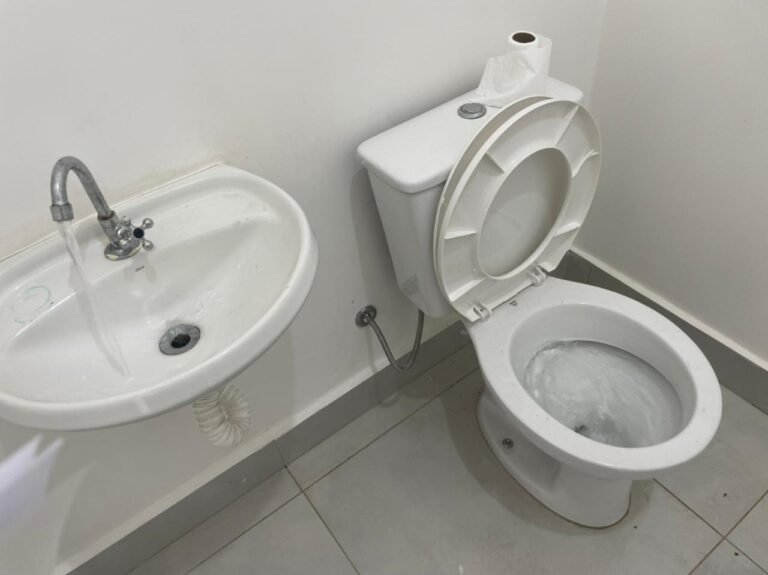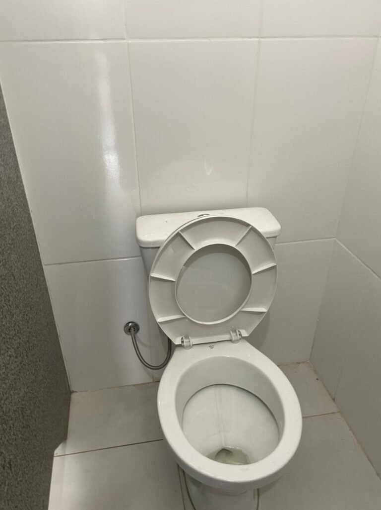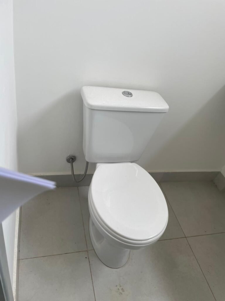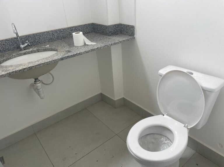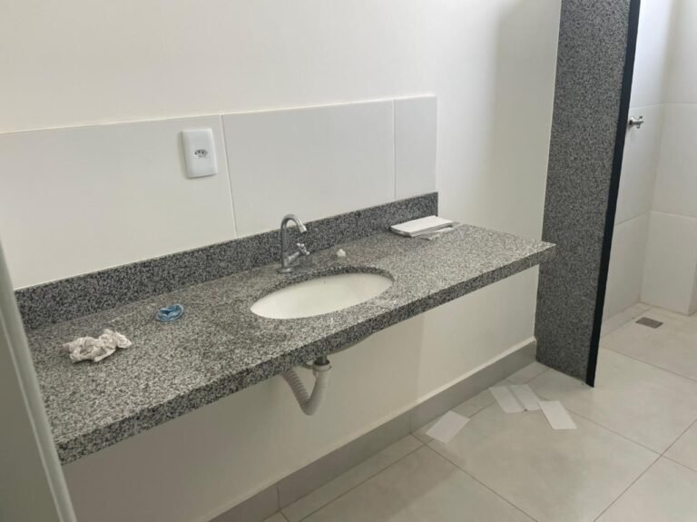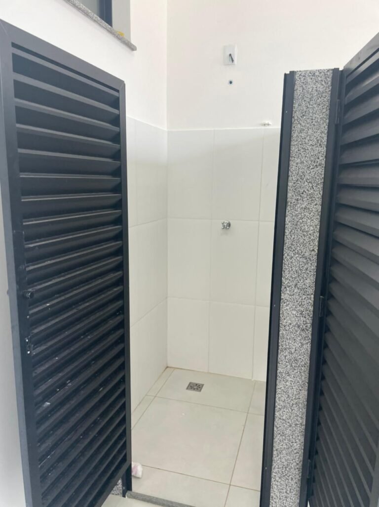 WC FEMININO:- Piso porcelanato em ordem, paredes e teto com pintura na cor branco em ordem, 2 divisórias de mármore e portas de alumínio na cor preto em ordem, pia de mármore com cuba cerâmica e torneira em ordem, sifão sanfonado em ordem, 01 vaso sanitário caixa acoplada da marca icasa em ordem, vitrô esquadria de alumínio com 02 vidros em ordem, porta de acesso de madeira com pintura na cor cinza em ordem, maçaneta e chaves em ordem, 01 registro com canopla, 01 saída para chuveiro elétrico, tomada.