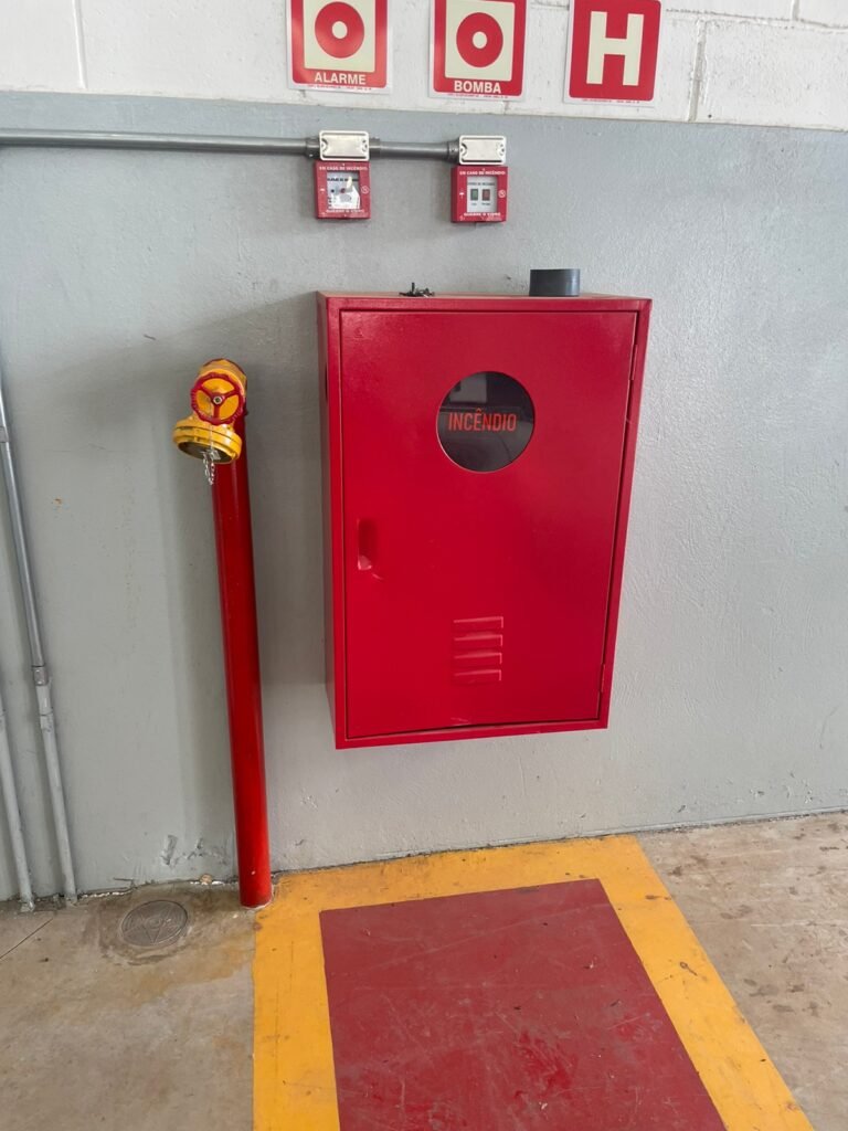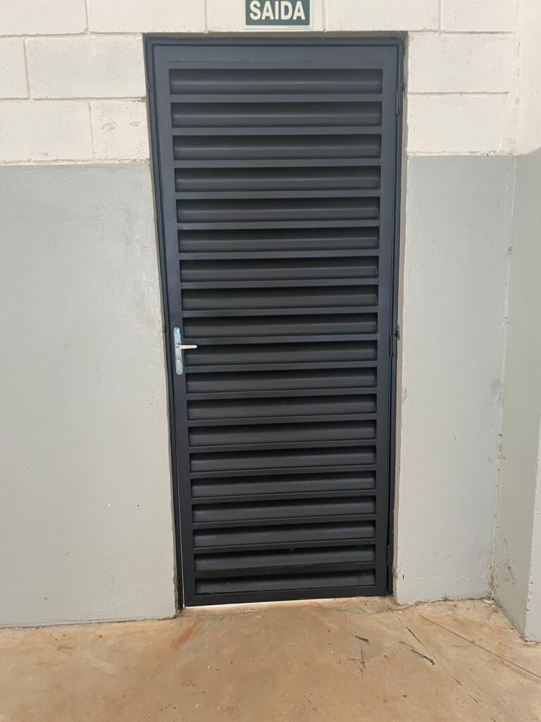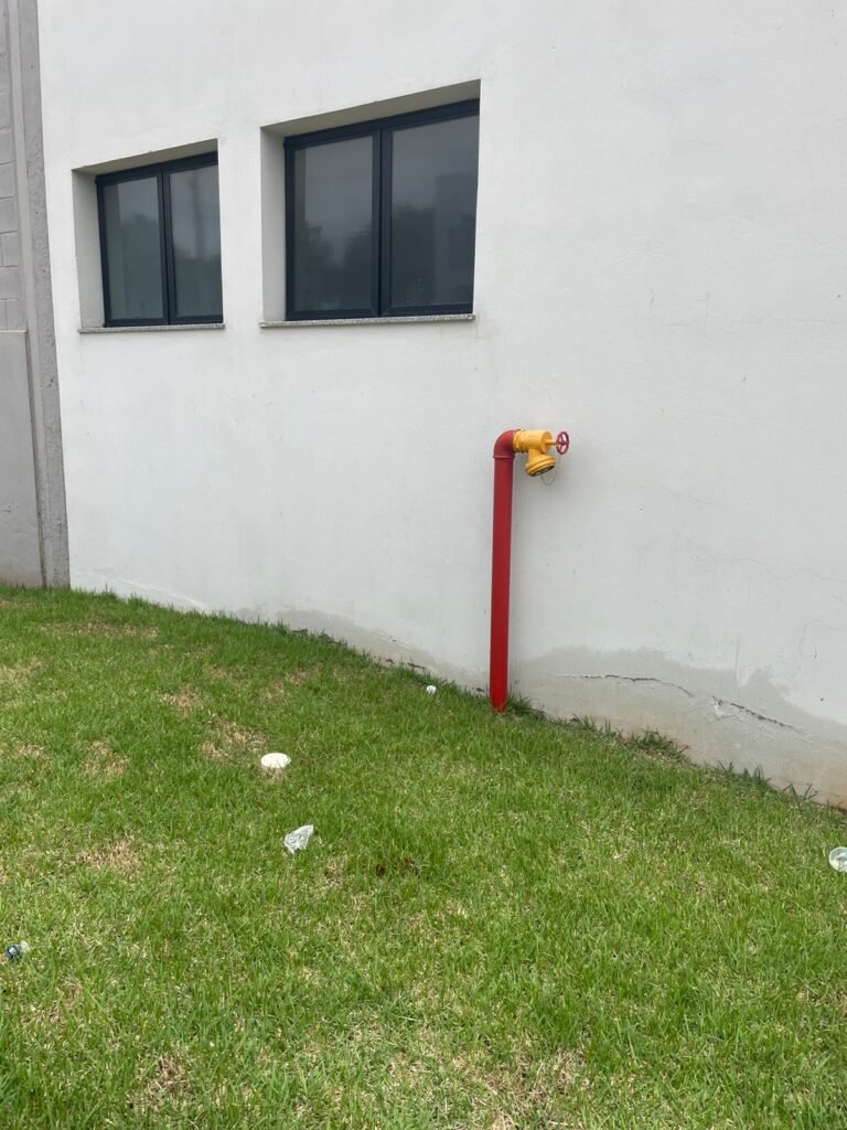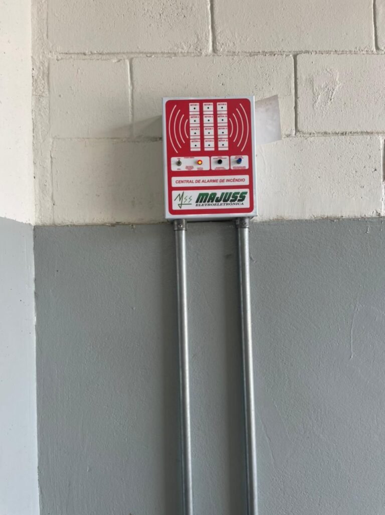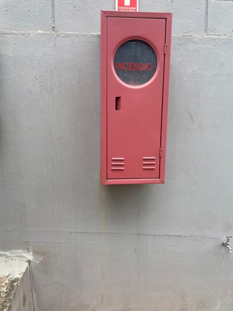 FUNDOS:- Muros com bloco aparente e pintura na cor cinza, reservatório de água corpo de bombeiros em ordem, motor bomba do reservatório em ordem, extintor de 6 kg carga de pó químico em ordem, escada externa para acesso ao telhado em ordem caixa de disjuntores tigre com 05 disjuntores steck em ordem, 04 disjuntores bipolar steck, 01 disjuntor bipolar WEQ, 03 disjuntores tripolar steck em ordem.