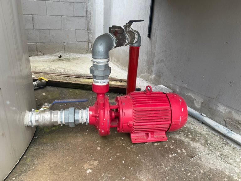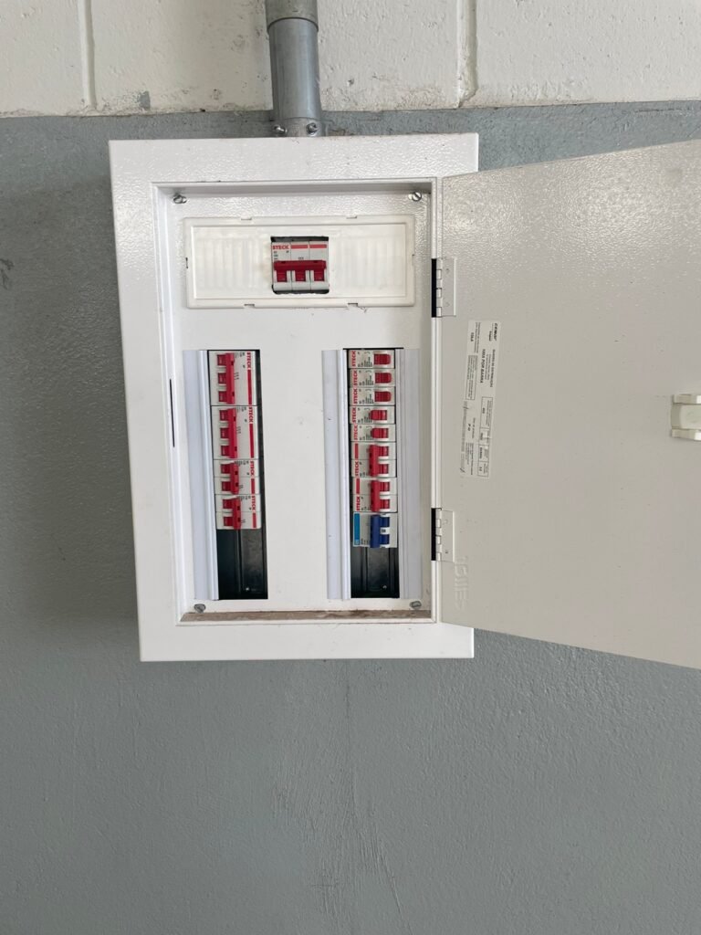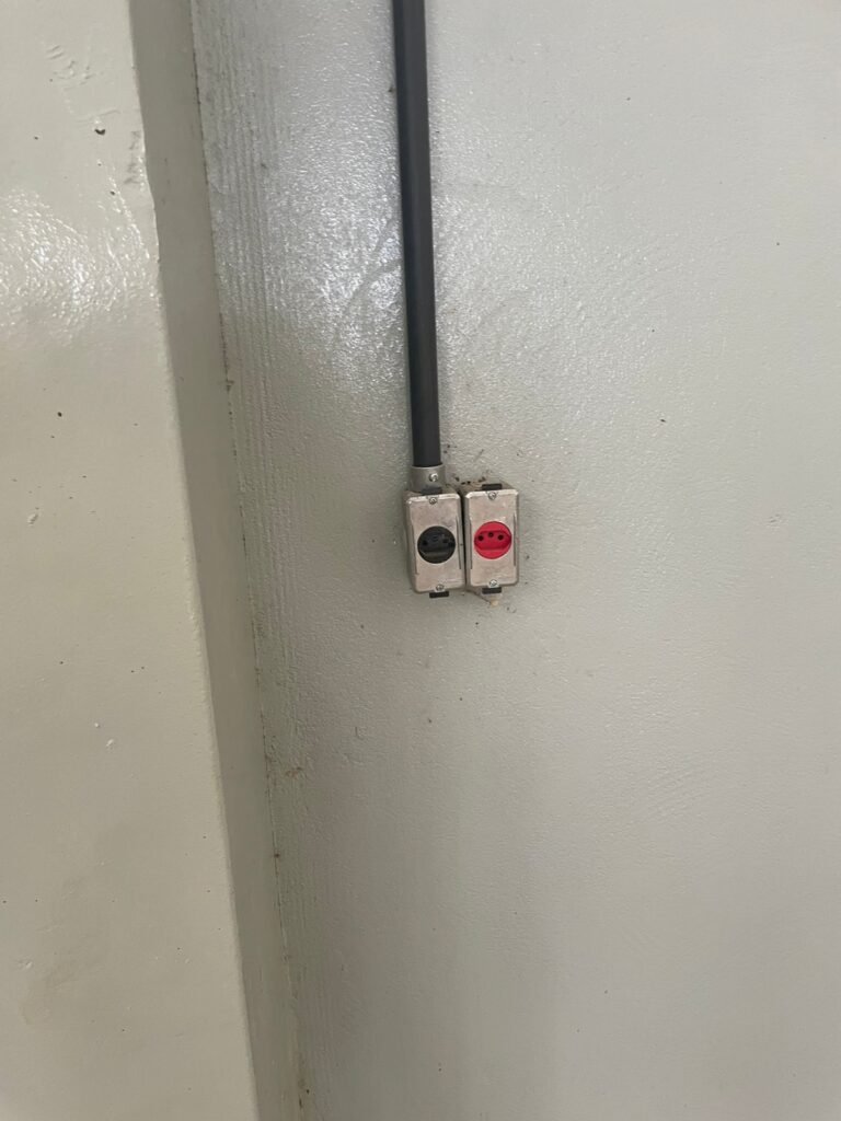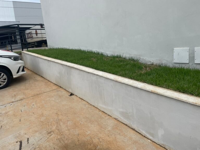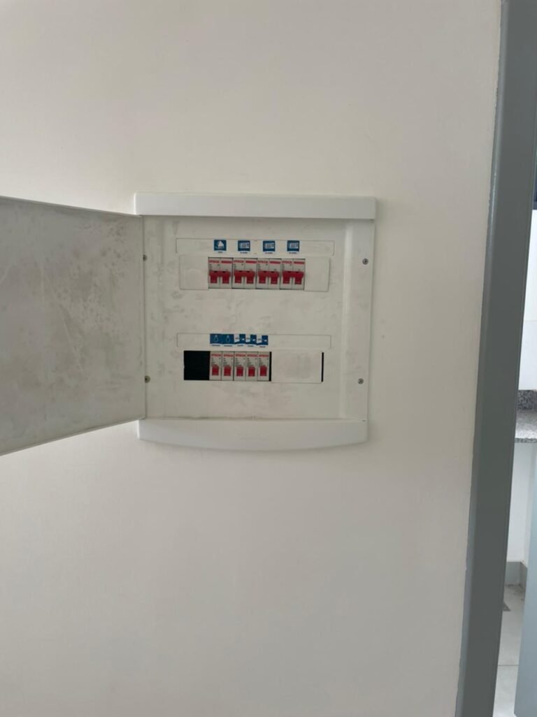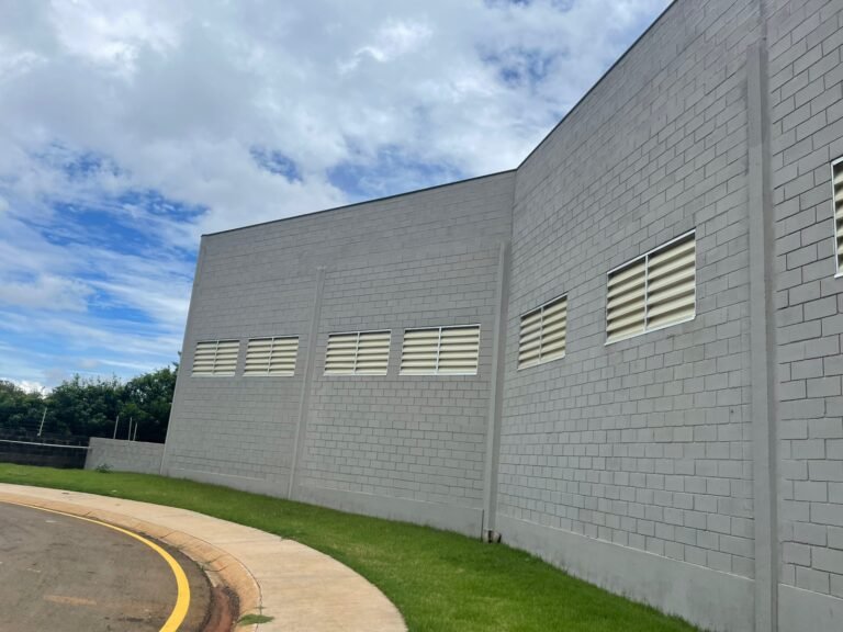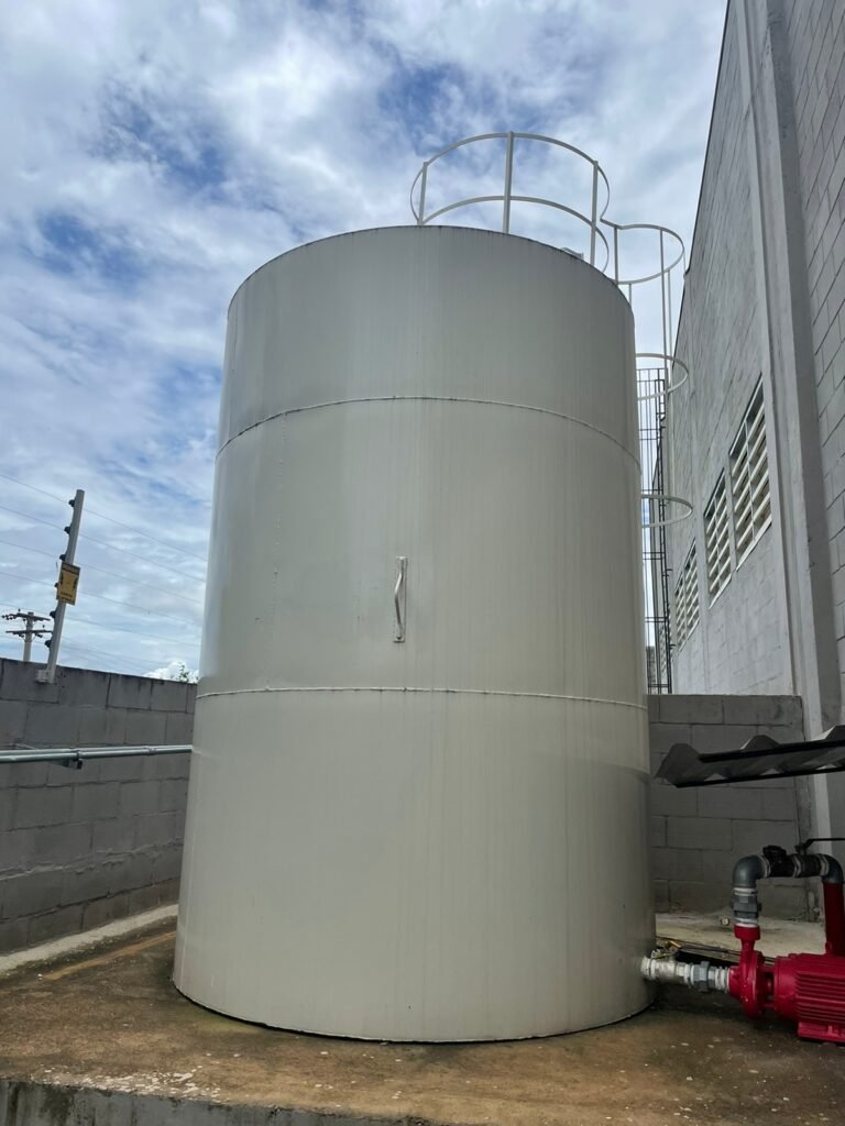 FUNDOS:- Muros com bloco aparente e pintura na cor cinza, reservatório de água corpo de bombeiros em ordem, motor bomba do reservatório em ordem, extintor de 6 kg carga de pó químico em ordem, escada externa para acesso ao telhado em ordem caixa de disjuntores tigre com 05 disjuntores steck em ordem, 04 disjuntores bipolar steck, 01 disjuntor bipolar WEQ, 03 disjuntores tripolar steck em ordem.