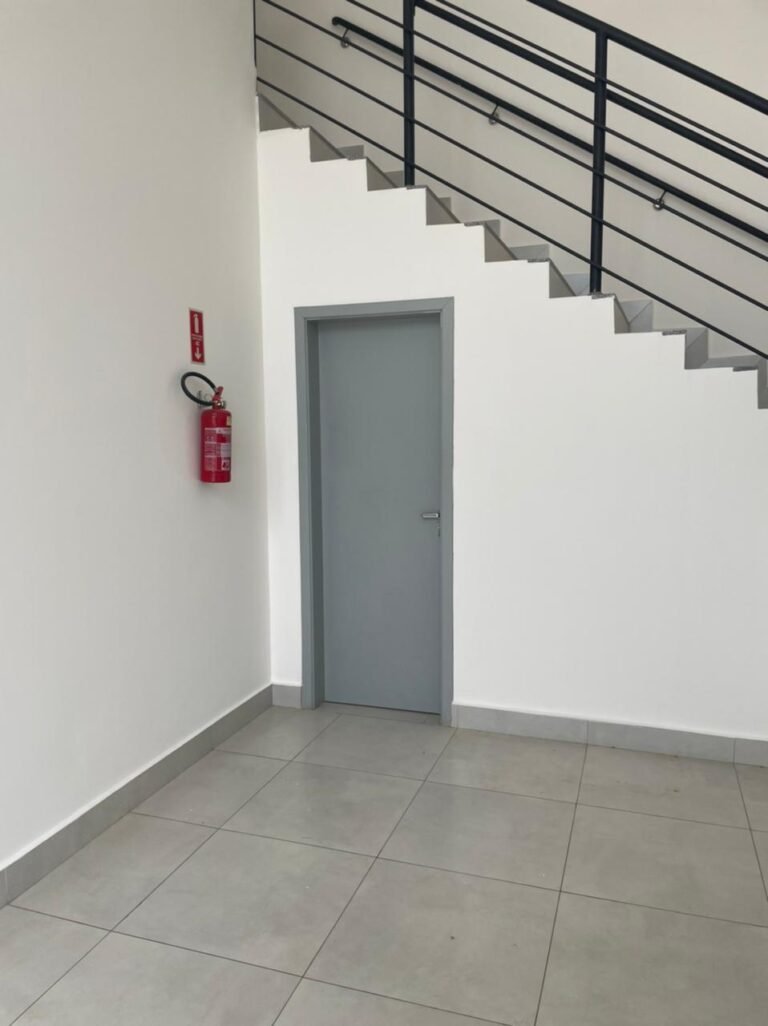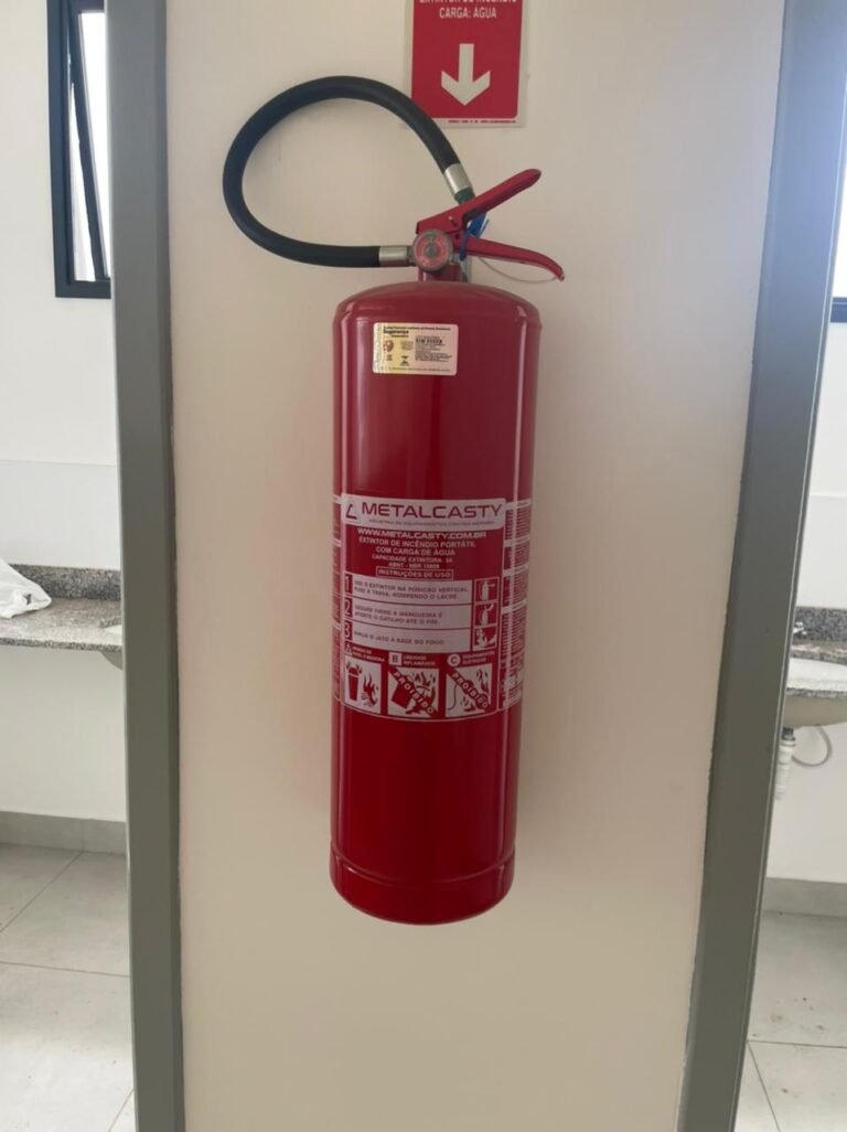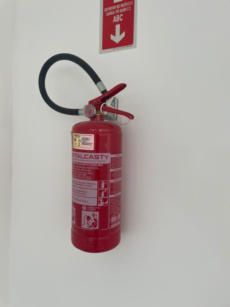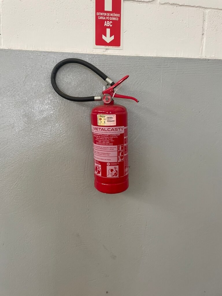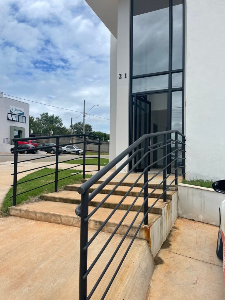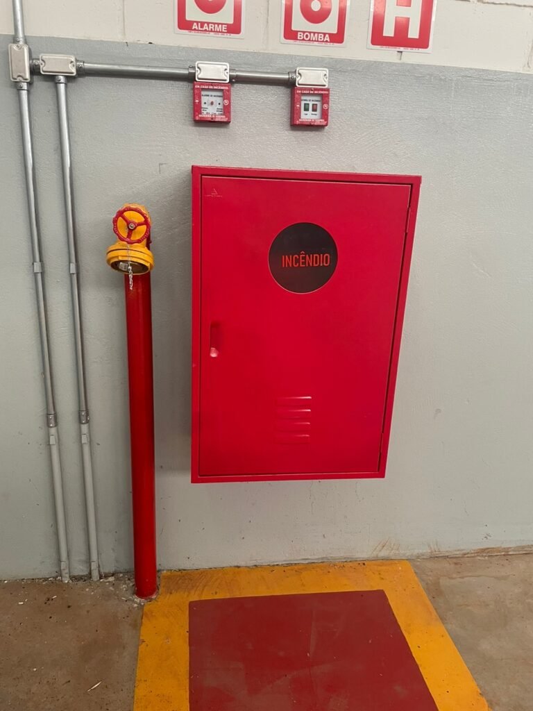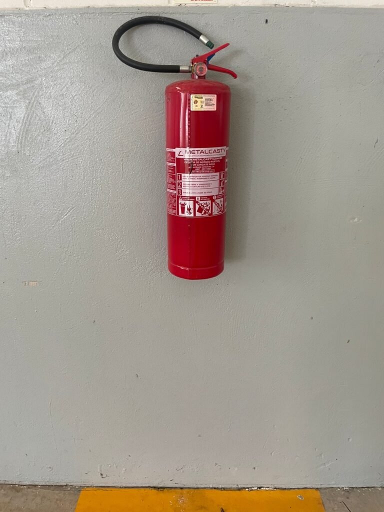 RECEPÇÃO:- Piso porcelanato cinza ordem, paredes com pintura na cor branca ordem, porta de acesso em vidro blindex preto, com puxadores e chave em ordem, 13 vidros blindex fume e esquadrias de Alumínio preto em Ordem, poço de elevador com porta de madeira e chave em ordem, um hidrante com mangueiras e botoeiras novas, Sistema de alarme de incêndio novo, 2 extintores da marca metalcasty de 6 kg carga pó em ordem, 2 lâmpadas led ordem, tomadas em ordem, escada de alvenaria para aceso ao escritório com revestimento em porcelanato e de mármore em ordem, corrimão e guarda corpo com pintura na com preto em ordem.