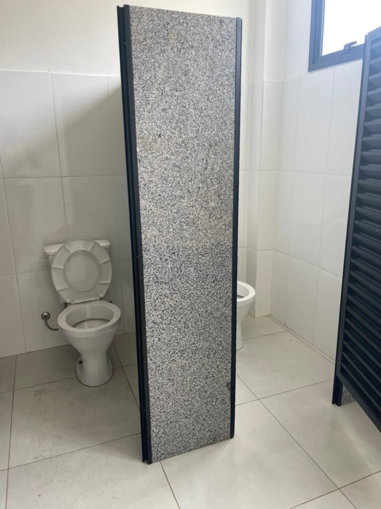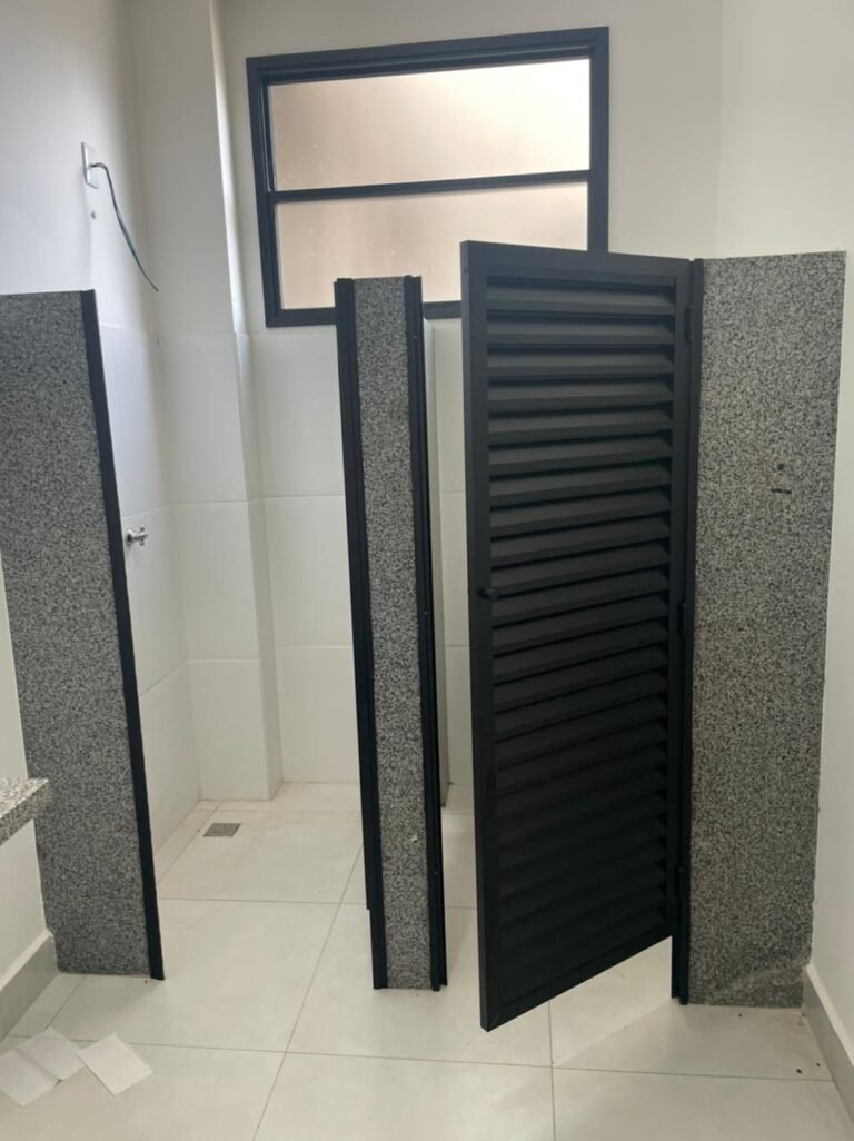 WC MASCULINO:- Piso porcelanato em ordem, paredes e teto com pintura na cor branco em ordem, 4 divisórias de mármore e portas de alumínio na cor preto em ordem, pia de mármore com cuba cerâmica e torneira em ordem, sifão sanfonado em ordem, 02 vaso sanitário caixa acoplada da marca icasa em ordem, vitrô esquadria de alumínio com 02 vidros em ordem, porta de acesso de madeira com pintura na cor cinza em ordem, maçaneta e chaves em ordem, 02 registro com canopla, 02 saída para chuveiro elétrico, tomada, 03 l lâmpadas de led em ordem.