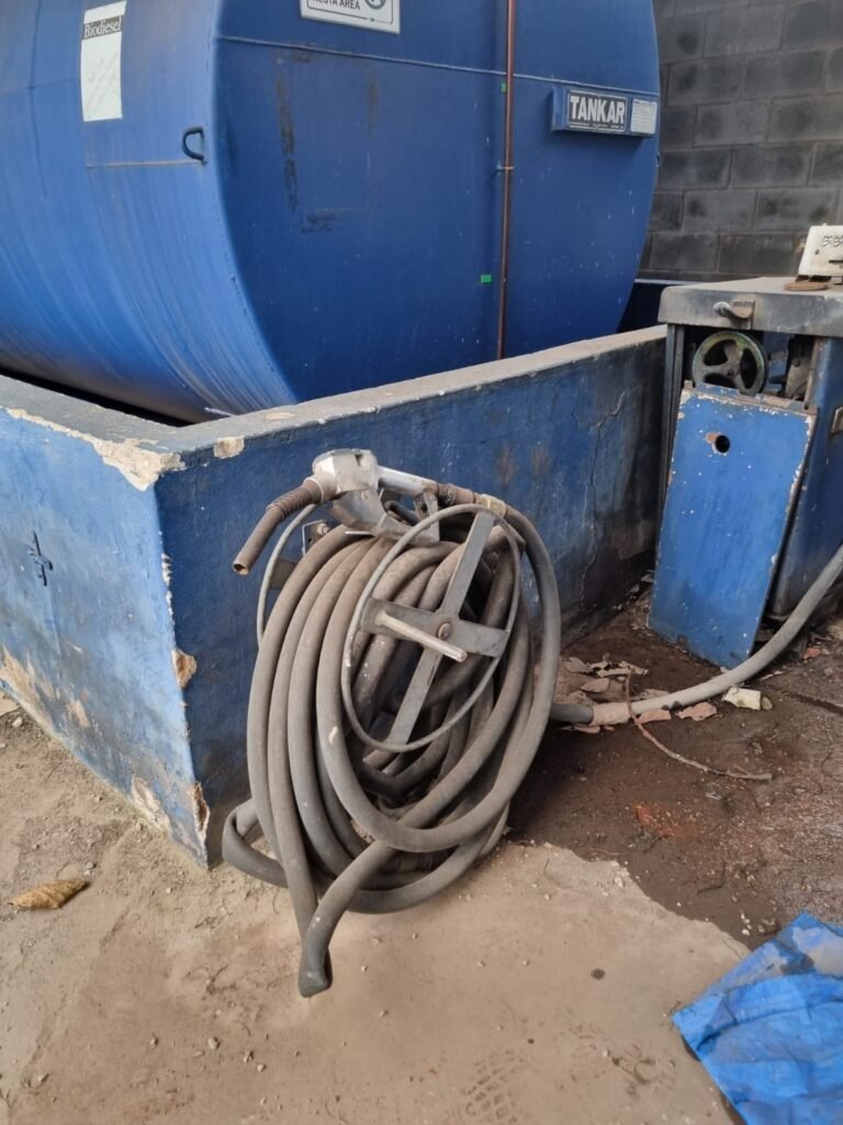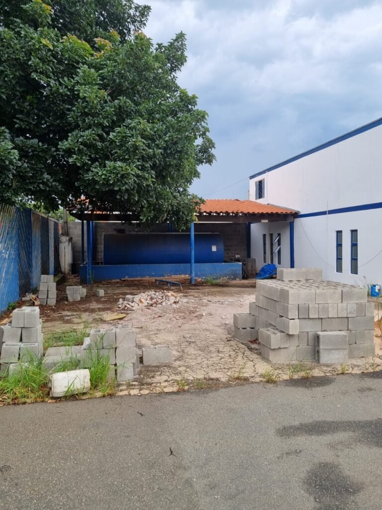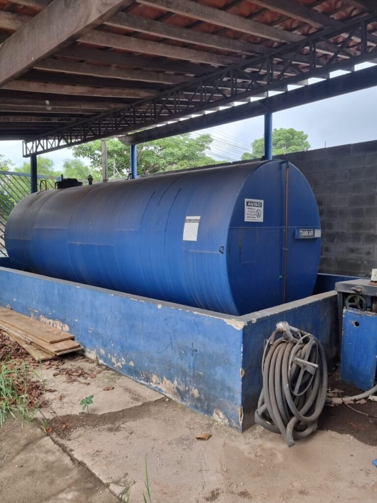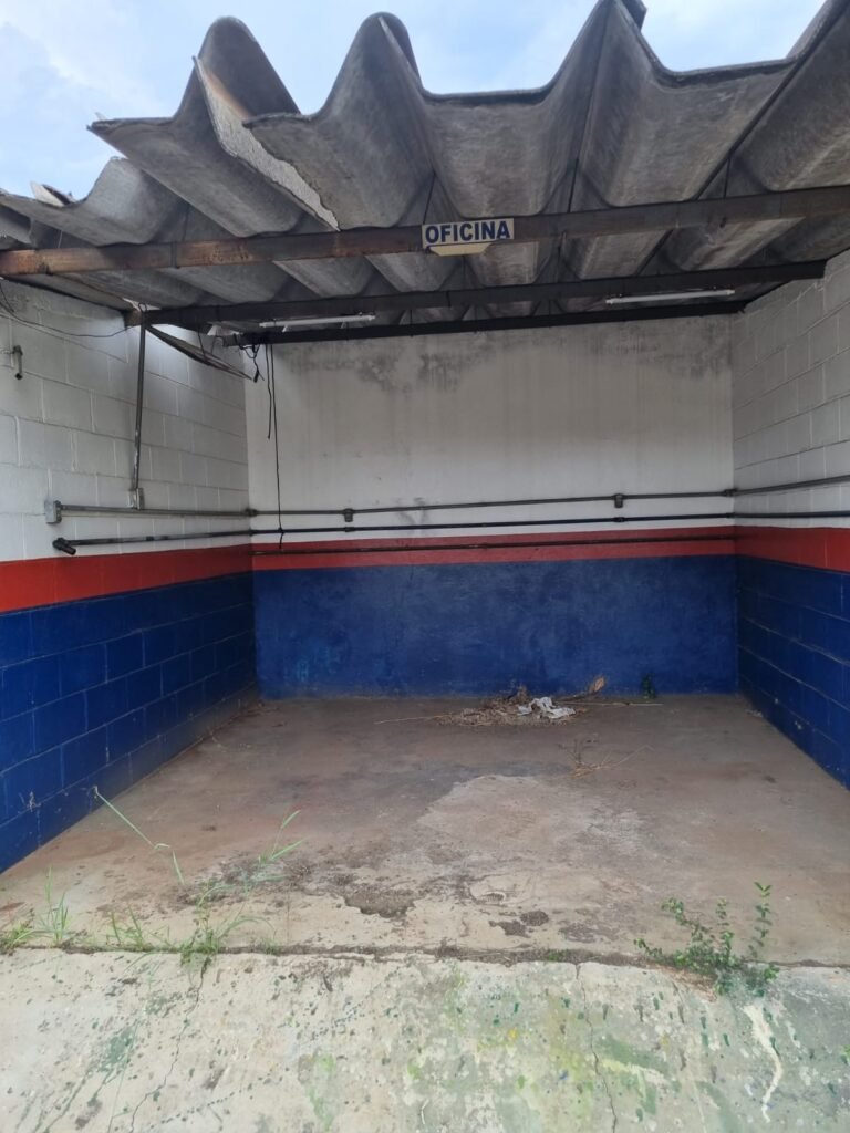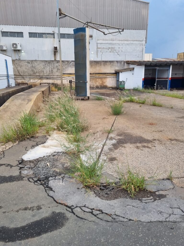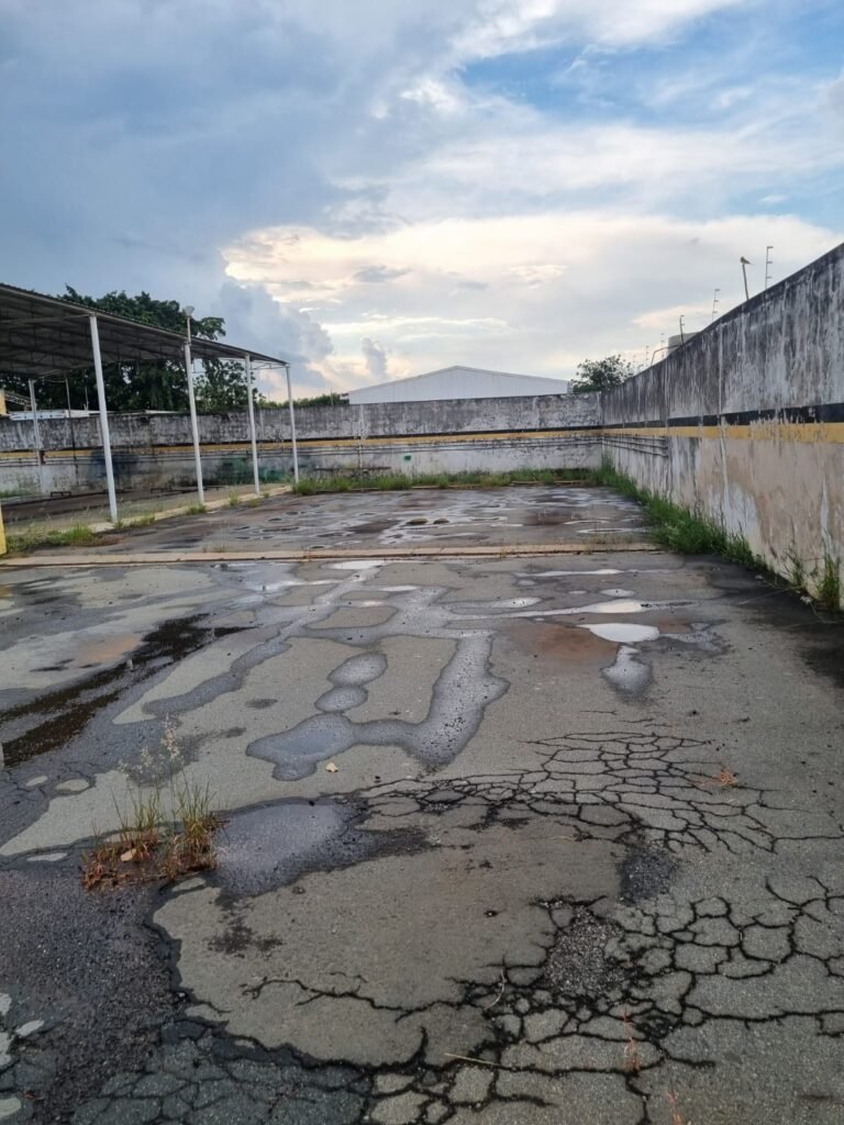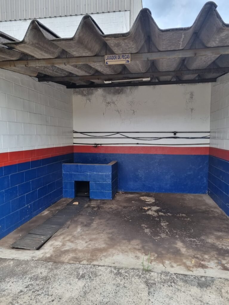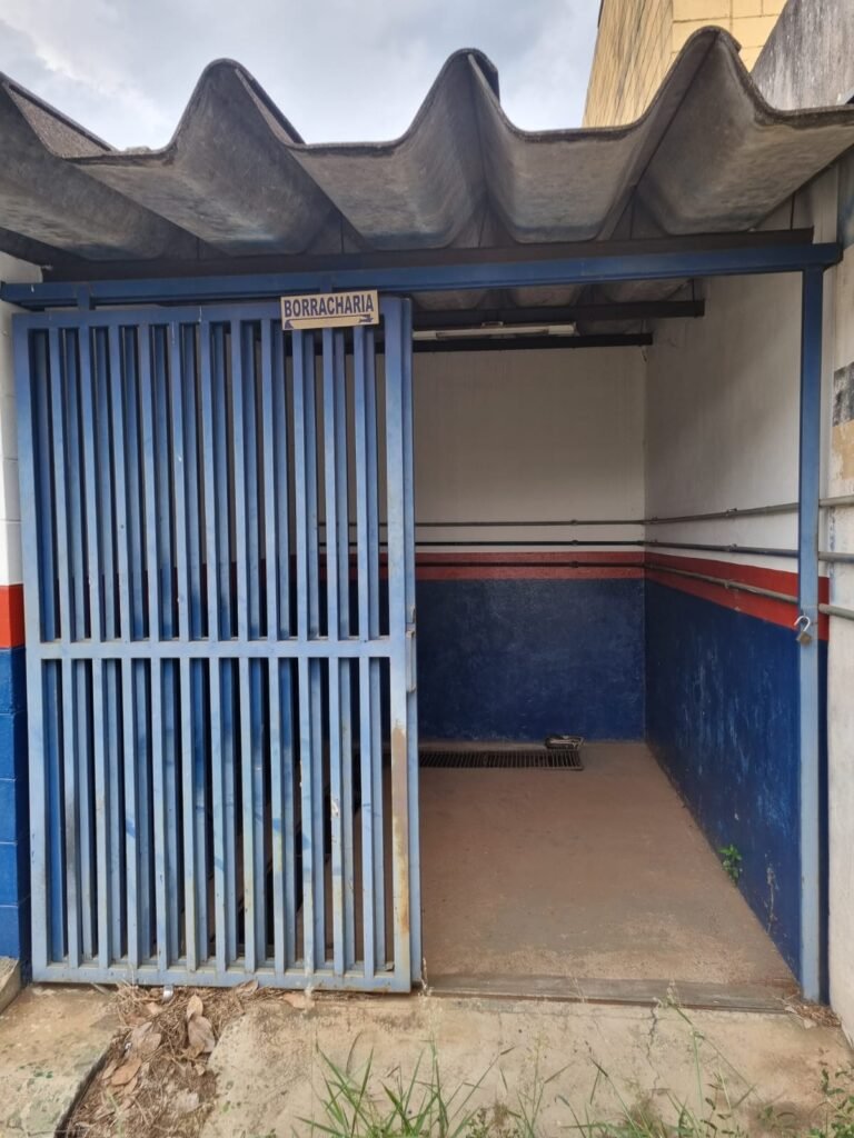 PÁTIO:- Piso parte massa asfáltica e parte em concerto com rachaduras, blocos de concreto estrutural, 01 tanque de combustível 15m3, sendo q a bomba esta desligada, mangueira com bico, 06 refletores sendo que 03 estão com lâmpadas queimadas, 01 rampa lavador, cobertura com telhado estrutura metálica e telhas galvanizadas em ordem com 02 valetas de manutenção, encanamento ar comprimido, 02 extintores pó químico 04 kg 20-B:C, 01 tanque de cimento com torneira em ordem, 01 torneiras de jardim, muros com reboco e pintura descascando, instalação fiação por eletrotubos com 02 tomadas e espelho de luz, ralo com grelha enferrujada, cobertura com telhas galvanizadas e com “placas” escrito : oficina, compressor, borracharia, lavador de peças, deposito; sendo que algumas estão quebradas, paredes com pintura barrado na cor azul, faixa na cor vermelha e restante na cor branca, 03 portões de correr com pintura na cor azul sendo que alguns estão quebrados e com pintura descascando, 01 portão de abrir com pintura na cor azul descascando, 01 tanque de blocos com torneira de jardim, 05 luminárias tubulares, 01 lâmpada bulbo Led, 01 ralo com grelha quebrada, 01 portão com pintura na cor branco com trinco, 02 cubas cerâmica preta, 02 sifões sanfonado, 03 torneiras de jardim, instalação elétrica por eletrotubos , 02 estante, 01 tambor 200lt, 01 rampa com valeta para manutenção, 01 escova para lavar baú com motor WEG em ordem.