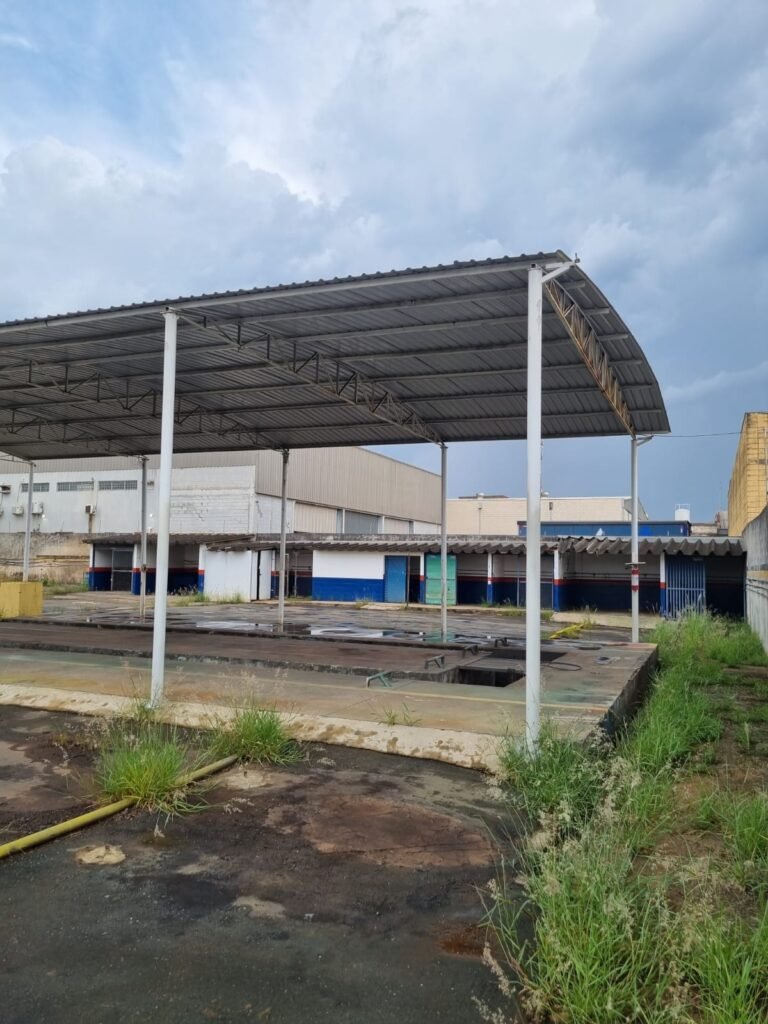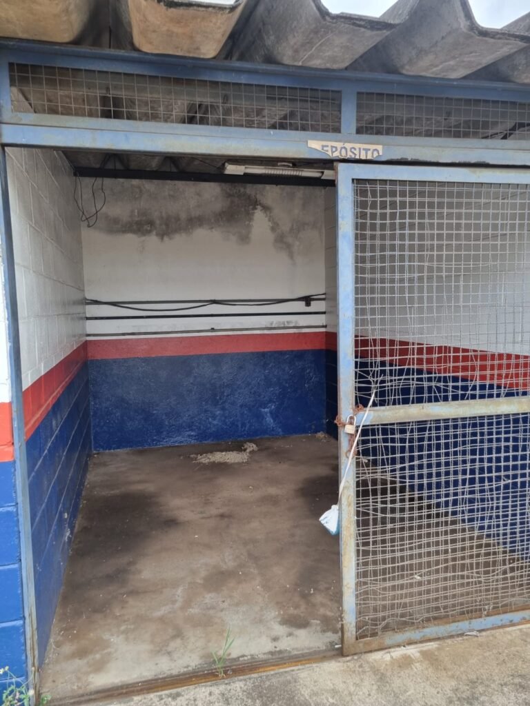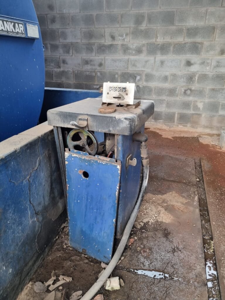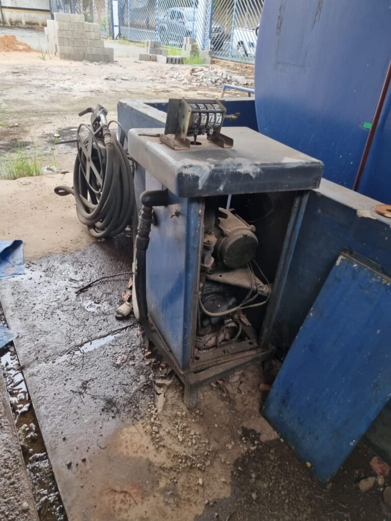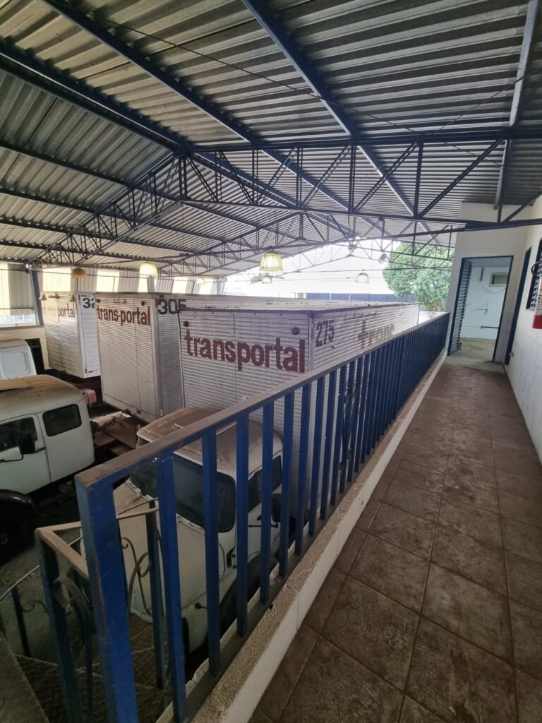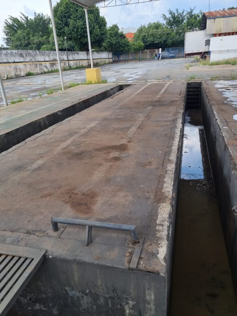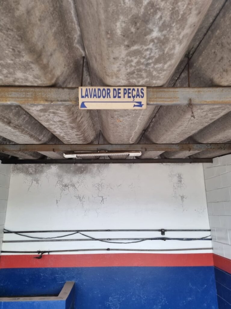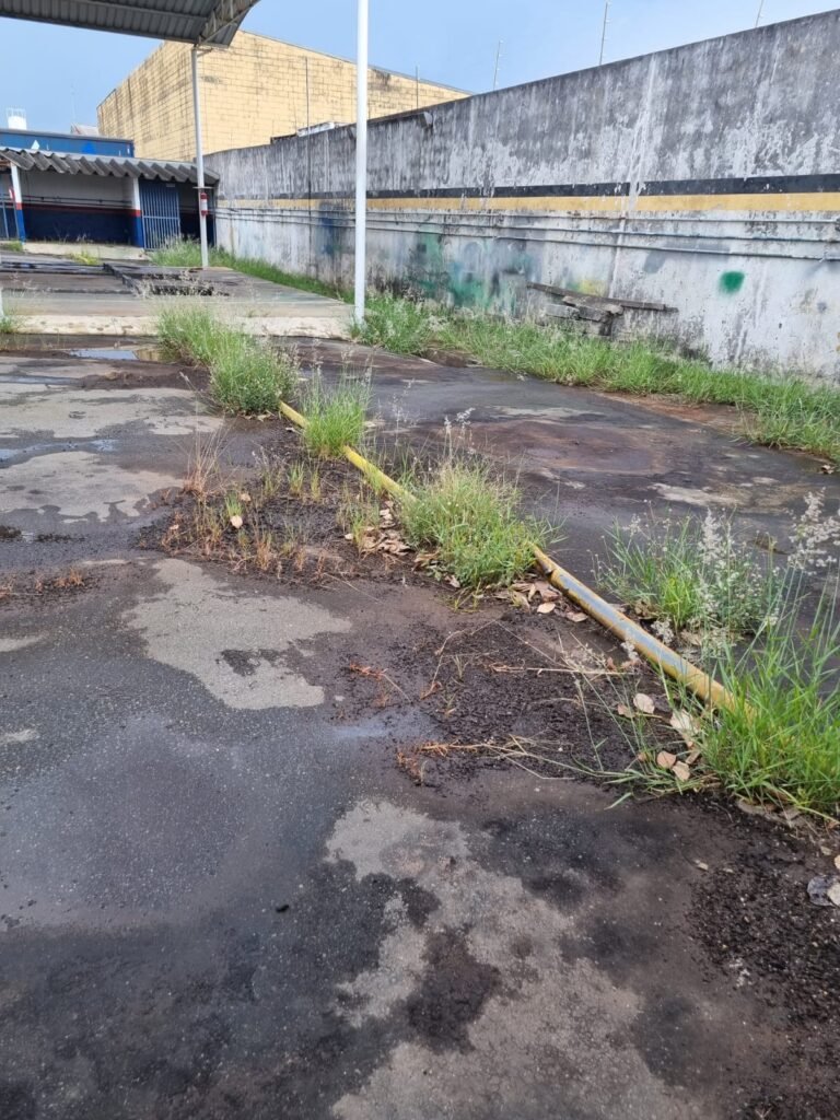 PÁTIO:- Piso parte massa asfáltica e parte em concerto com rachaduras, blocos de concreto estrutural, 01 tanque de combustível 15m3, sendo q a bomba esta desligada, mangueira com bico, 06 refletores sendo que 03 estão com lâmpadas queimadas, 01 rampa lavador, cobertura com telhado estrutura metálica e telhas galvanizadas em ordem com 02 valetas de manutenção, encanamento ar comprimido, 02 extintores pó químico 04 kg 20-B:C, 01 tanque de cimento com torneira em ordem, 01 torneiras de jardim, muros com reboco e pintura descascando, instalação fiação por eletrotubos com 02 tomadas e espelho de luz, ralo com grelha enferrujada, cobertura com telhas galvanizadas e com “placas” escrito : oficina, compressor, borracharia, lavador de peças, deposito; sendo que algumas estão quebradas, paredes com pintura barrado na cor azul, faixa na cor vermelha e restante na cor branca, 03 portões de correr com pintura na cor azul sendo que alguns estão quebrados e com pintura descascando, 01 portão de abrir com pintura na cor azul descascando, 01 tanque de blocos com torneira de jardim, 05 luminárias tubulares, 01 lâmpada bulbo Led, 01 ralo com grelha quebrada, 01 portão com pintura na cor branco com trinco, 02 cubas cerâmica preta, 02 sifões sanfonado, 03 torneiras de jardim, instalação elétrica por eletrotubos , 02 estante, 01 tambor 200lt, 01 rampa com valeta para manutenção, 01 escova para lavar baú com motor WEG em ordem.