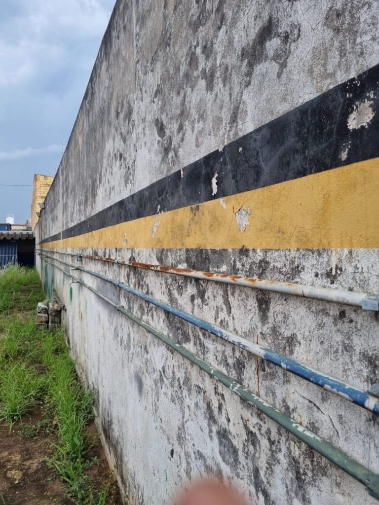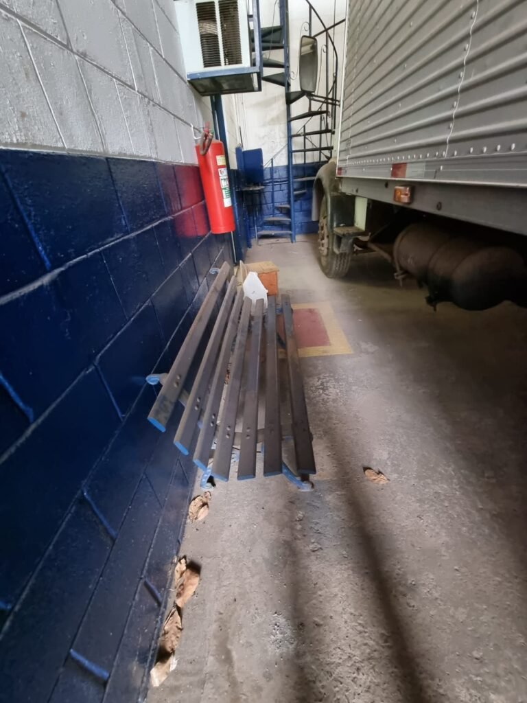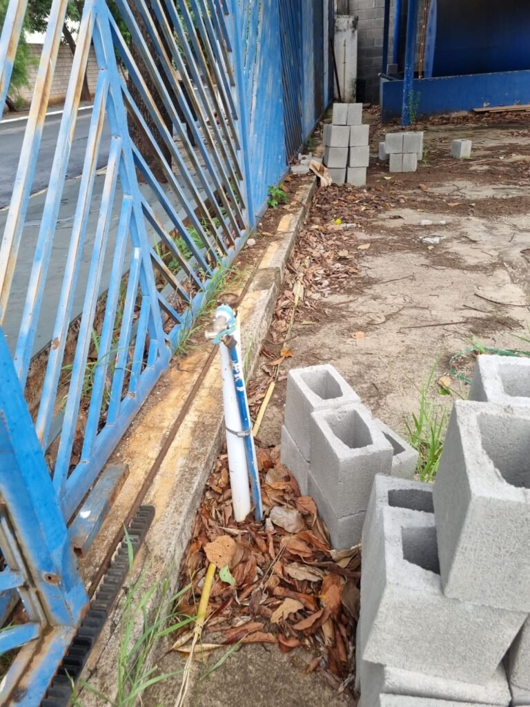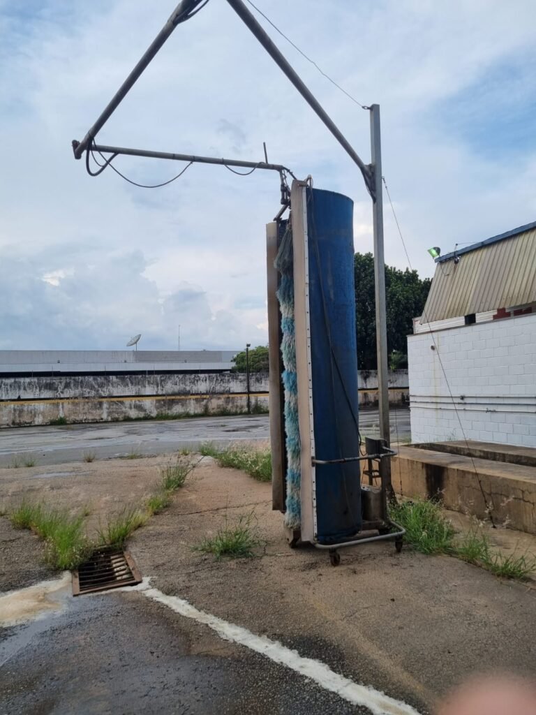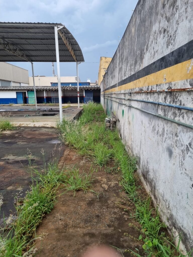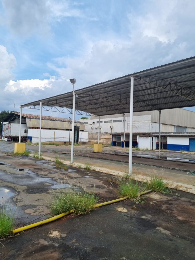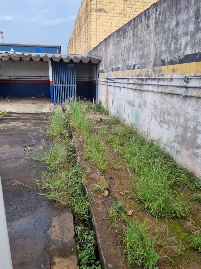PÁTIO:- Piso parte massa asfáltica e parte em concerto com rachaduras, blocos de concreto estrutural, 01 tanque de combustível 15m3, sendo q a bomba esta desligada, mangueira com bico, 06 refletores sendo que 03 estão com lâmpadas queimadas, 01 rampa lavador, cobertura com telhado estrutura metálica e telhas galvanizadas em ordem com 02 valetas de manutenção, encanamento ar comprimido, 02 extintores pó químico 04 kg 20-B:C, 01 tanque de cimento com torneira em ordem, 01 torneiras de jardim, muros com reboco e pintura descascando, instalação fiação por eletrotubos com 02 tomadas e espelho de luz, ralo com grelha enferrujada, cobertura com telhas galvanizadas e com “placas” escrito : oficina, compressor, borracharia, lavador de peças, deposito; sendo que algumas estão quebradas, paredes com pintura barrado na cor azul, faixa na cor vermelha e restante na cor branca, 03 portões de correr com pintura na cor azul sendo que alguns estão quebrados e com pintura descascando, 01 portão de abrir com pintura na cor azul descascando, 01 tanque de blocos com torneira de jardim, 05 luminárias tubulares, 01 lâmpada bulbo Led, 01 ralo com grelha quebrada, 01 portão com pintura na cor branco com trinco, 02 cubas cerâmica preta, 02 sifões sanfonado, 03 torneiras de jardim, instalação elétrica por eletrotubos , 02 estante, 01 tambor 200lt, 01 rampa com valeta para manutenção, 01 escova para lavar baú com motor WEG em ordem.