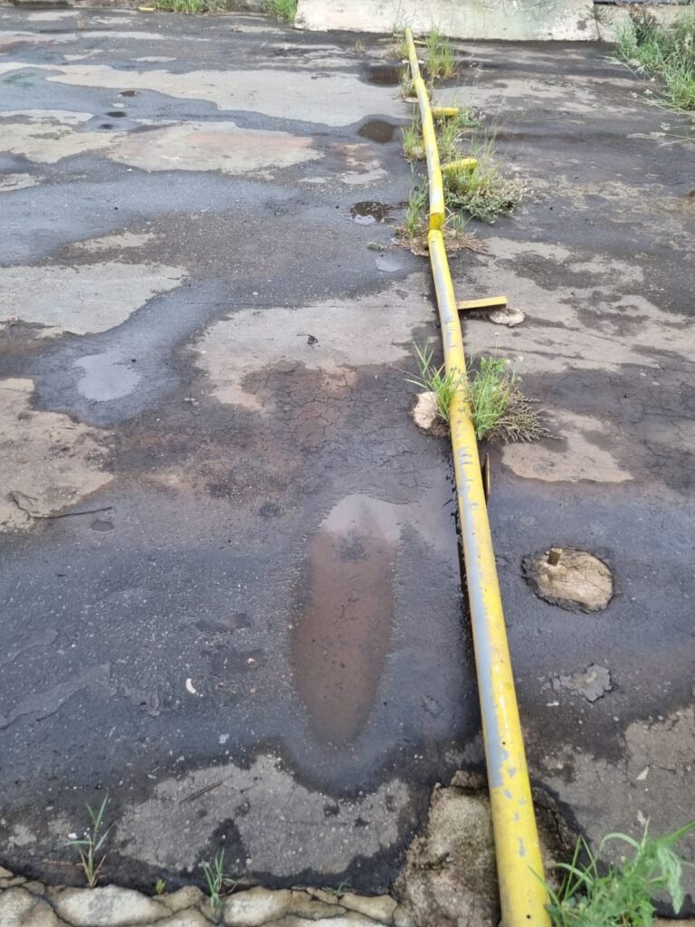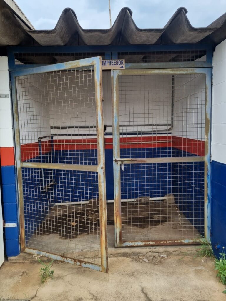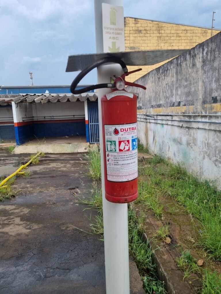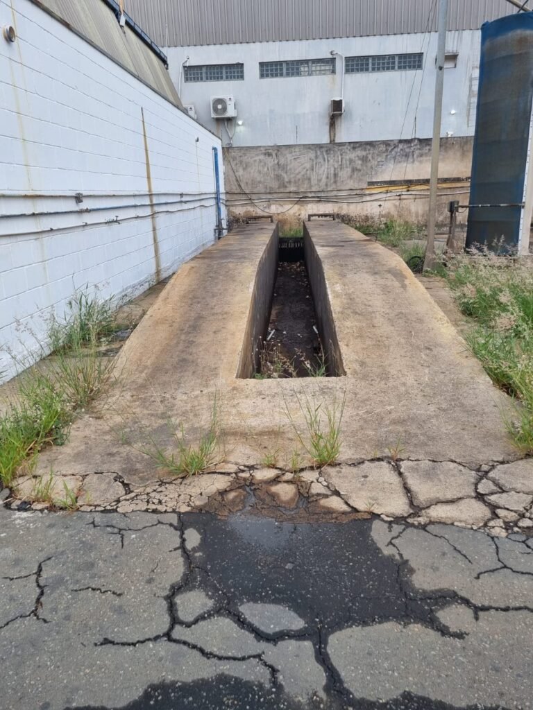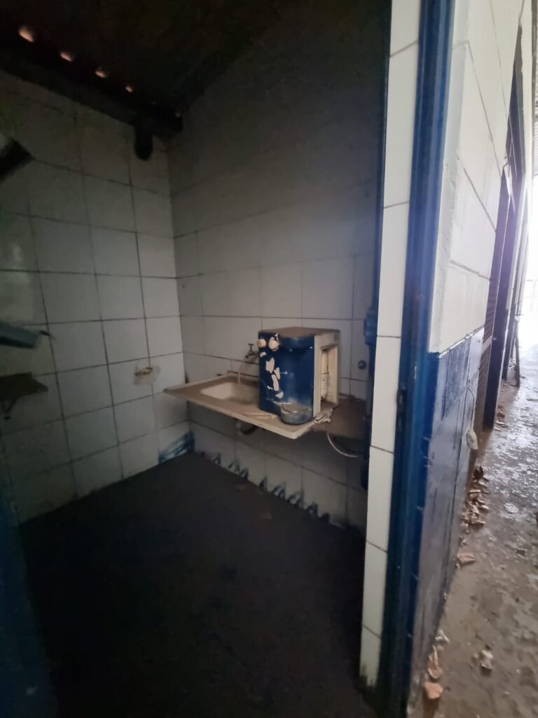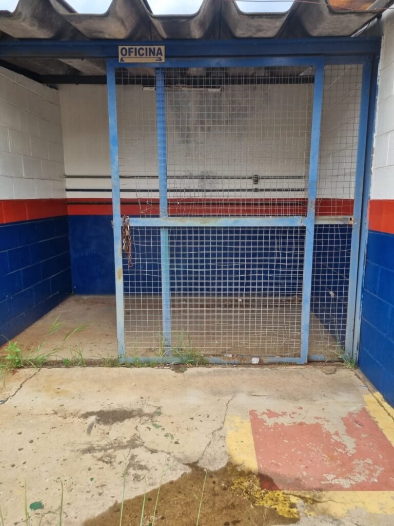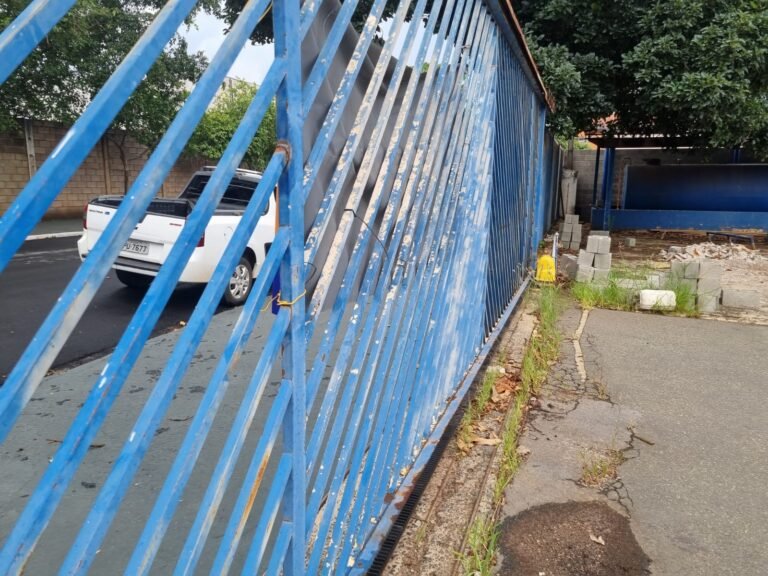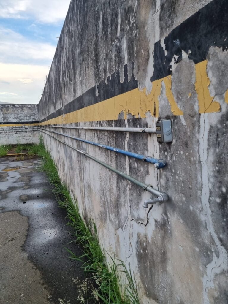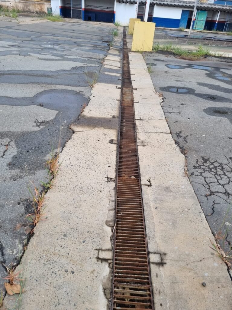 PÁTIO:- Piso parte massa asfáltica e parte em concerto com rachaduras, blocos de concreto estrutural, 01 tanque de combustível 15m3, sendo q a bomba esta desligada, mangueira com bico, 06 refletores sendo que 03 estão com lâmpadas queimadas, 01 rampa lavador, cobertura com telhado estrutura metálica e telhas galvanizadas em ordem com 02 valetas de manutenção, encanamento ar comprimido, 02 extintores pó químico 04 kg 20-B:C, 01 tanque de cimento com torneira em ordem, 01 torneiras de jardim, muros com reboco e pintura descascando, instalação fiação por eletrotubos com 02 tomadas e espelho de luz, ralo com grelha enferrujada, cobertura com telhas galvanizadas e com “placas” escrito : oficina, compressor, borracharia, lavador de peças, deposito; sendo que algumas estão quebradas, paredes com pintura barrado na cor azul, faixa na cor vermelha e restante na cor branca, 03 portões de correr com pintura na cor azul sendo que alguns estão quebrados e com pintura descascando, 01 portão de abrir com pintura na cor azul descascando, 01 tanque de blocos com torneira de jardim, 05 luminárias tubulares, 01 lâmpada bulbo Led, 01 ralo com grelha quebrada, 01 portão com pintura na cor branco com trinco, 02 cubas cerâmica preta, 02 sifões sanfonado, 03 torneiras de jardim, instalação elétrica por eletrotubos , 02 estante, 01 tambor 200lt, 01 rampa com valeta para manutenção, 01 escova para lavar baú com motor WEG em ordem.