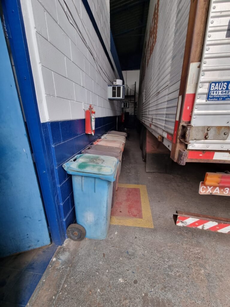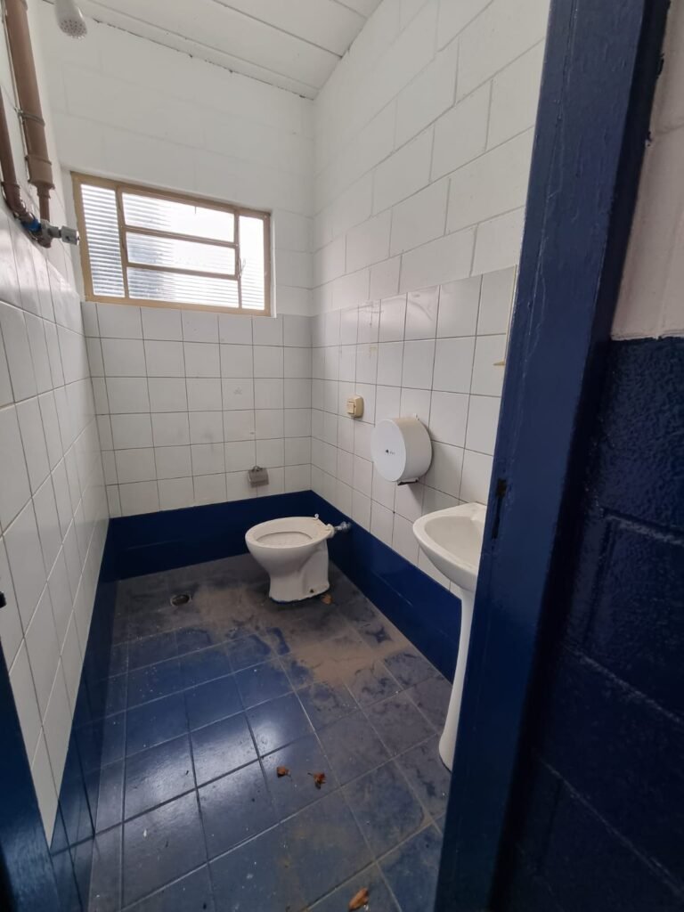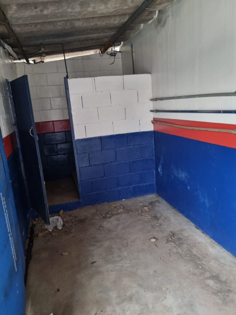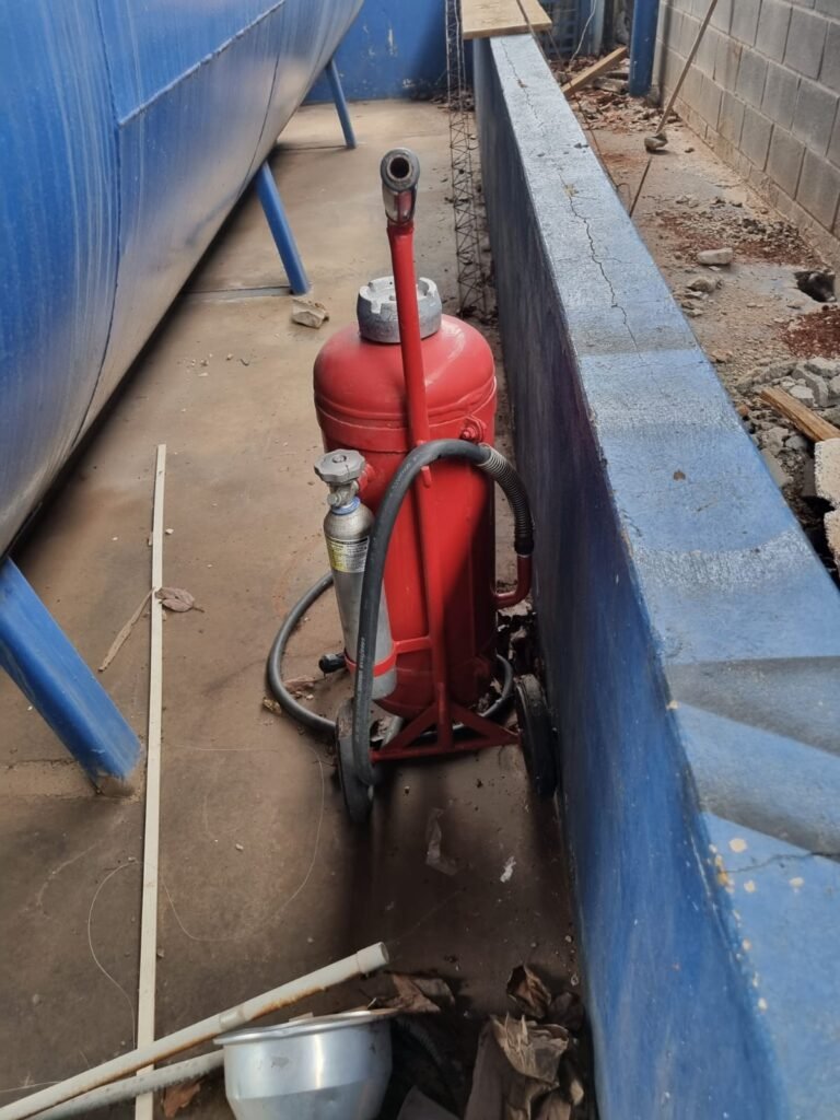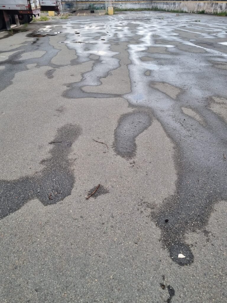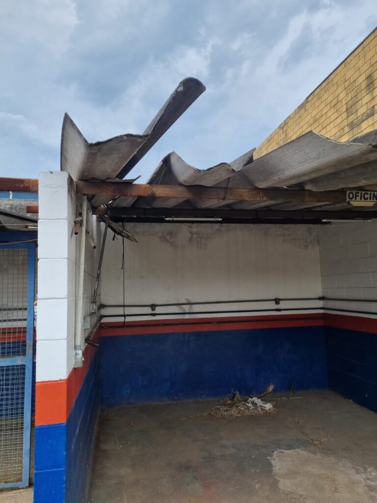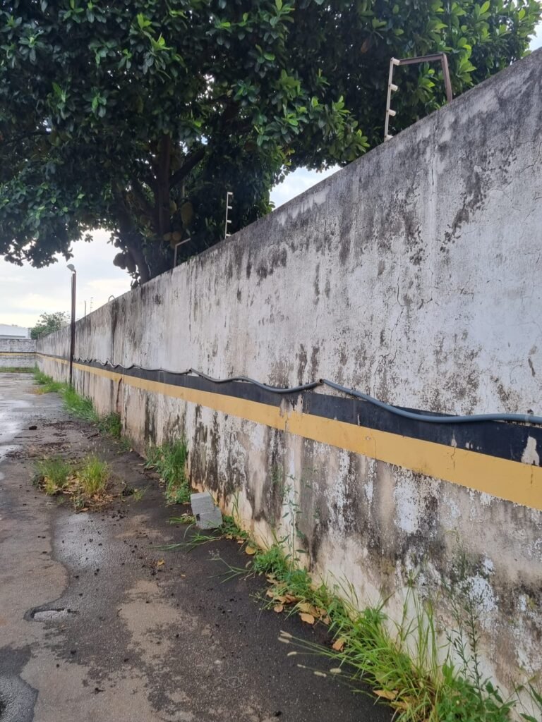 PÁTIO:- Piso parte massa asfáltica e parte em concerto com rachaduras, blocos de concreto estrutural, 01 tanque de combustível 15m3, sendo q a bomba esta desligada, mangueira com bico, 06 refletores sendo que 03 estão com lâmpadas queimadas, 01 rampa lavador, cobertura com telhado estrutura metálica e telhas galvanizadas em ordem com 02 valetas de manutenção, encanamento ar comprimido, 02 extintores pó químico 04 kg 20-B:C, 01 tanque de cimento com torneira em ordem, 01 torneiras de jardim, muros com reboco e pintura descascando, instalação fiação por eletrotubos com 02 tomadas e espelho de luz, ralo com grelha enferrujada, cobertura com telhas galvanizadas e com “placas” escrito : oficina, compressor, borracharia, lavador de peças, deposito; sendo que algumas estão quebradas, paredes com pintura barrado na cor azul, faixa na cor vermelha e restante na cor branca, 03 portões de correr com pintura na cor azul sendo que alguns estão quebrados e com pintura descascando, 01 portão de abrir com pintura na cor azul descascando, 01 tanque de blocos com torneira de jardim, 05 luminárias tubulares, 01 lâmpada bulbo Led, 01 ralo com grelha quebrada, 01 portão com pintura na cor branco com trinco, 02 cubas cerâmica preta, 02 sifões sanfonado, 03 torneiras de jardim, instalação elétrica por eletrotubos , 02 estante, 01 tambor 200lt, 01 rampa com valeta para manutenção, 01 escova para lavar baú com motor WEG em ordem.