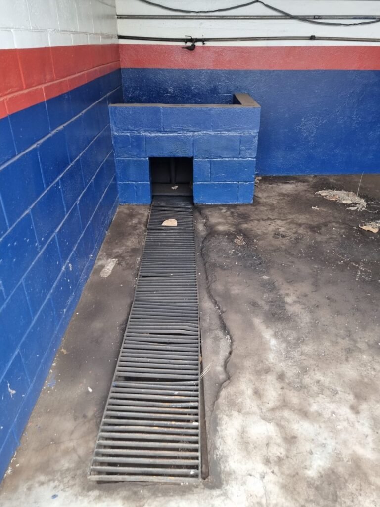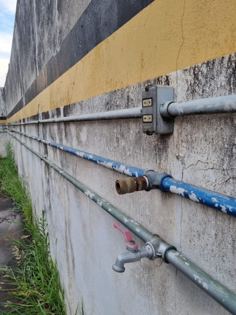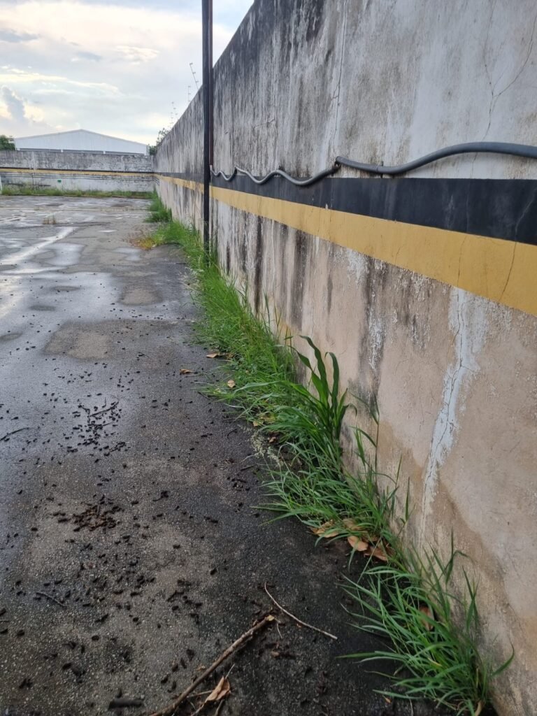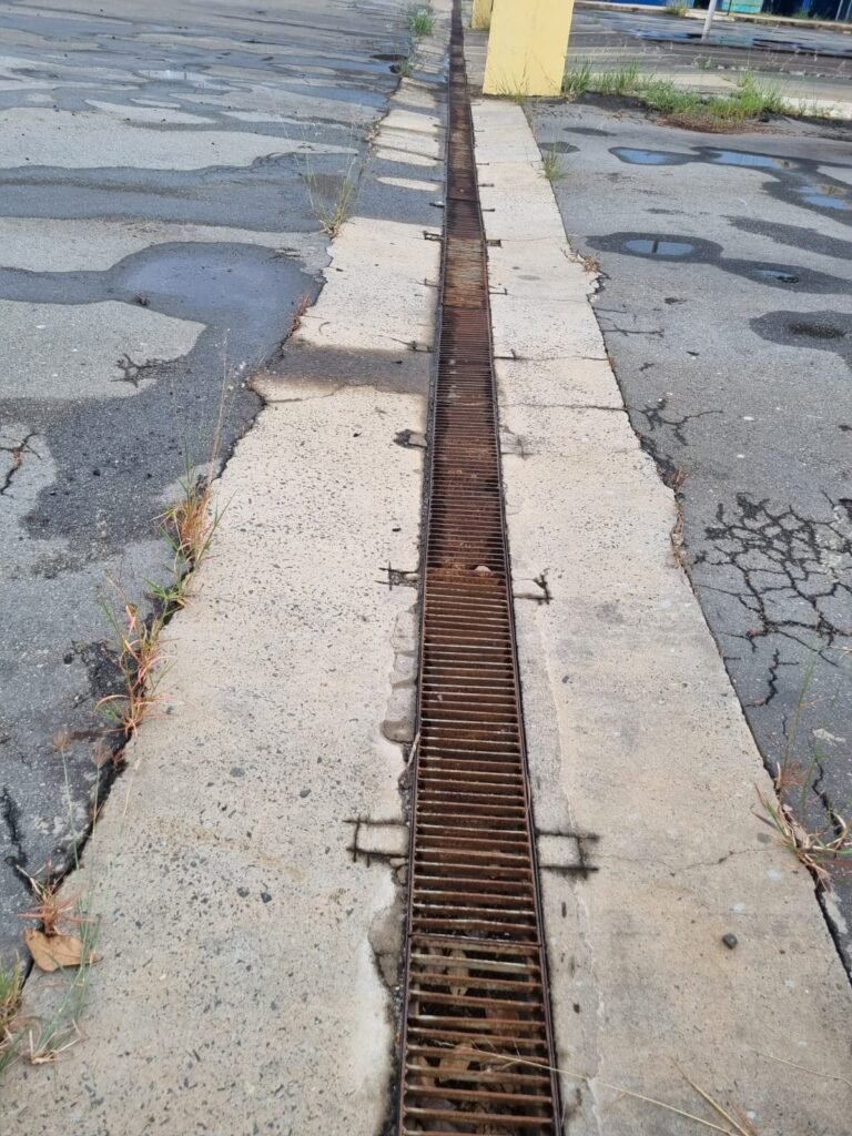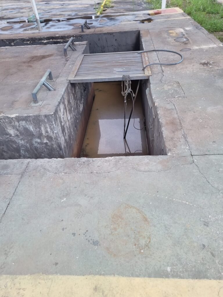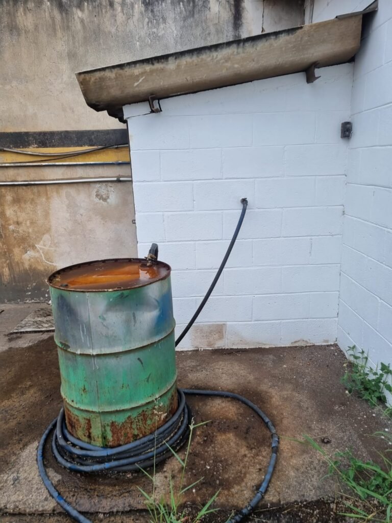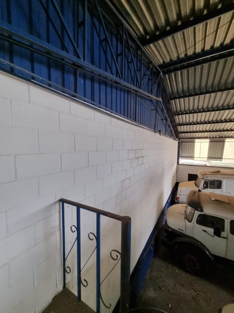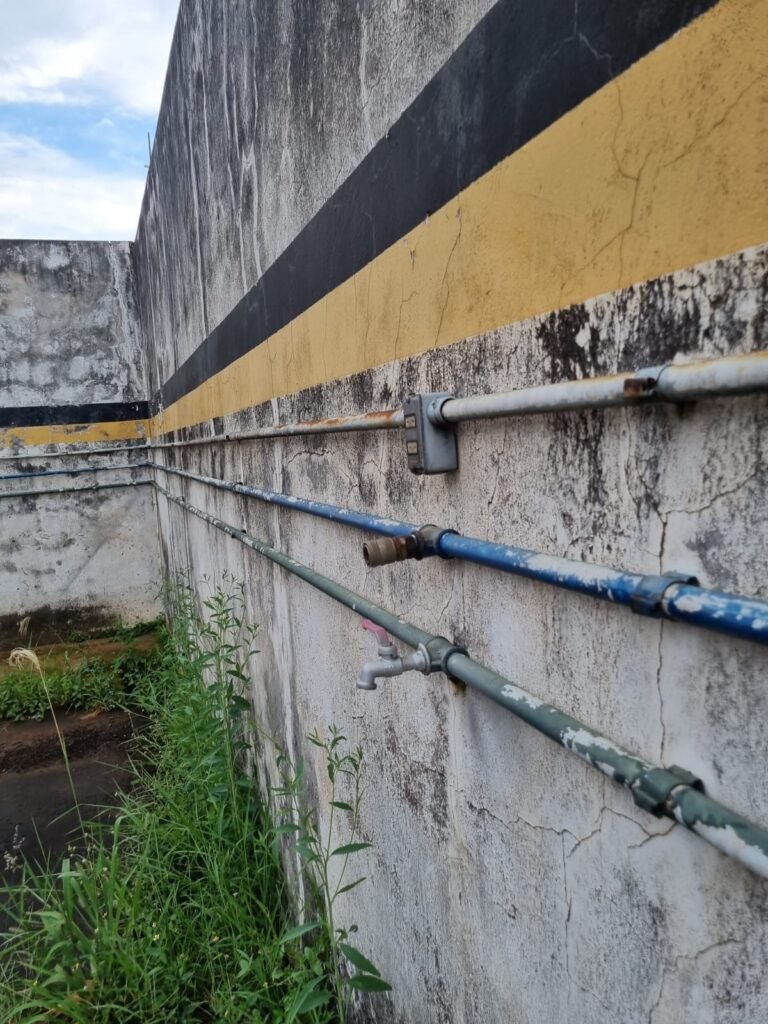 PÁTIO:- Piso parte massa asfáltica e parte em concerto com rachaduras, blocos de concreto estrutural, 01 tanque de combustível 15m3, sendo q a bomba esta desligada, mangueira com bico, 06 refletores sendo que 03 estão com lâmpadas queimadas, 01 rampa lavador, cobertura com telhado estrutura metálica e telhas galvanizadas em ordem com 02 valetas de manutenção, encanamento ar comprimido, 02 extintores pó químico 04 kg 20-B:C, 01 tanque de cimento com torneira em ordem, 01 torneiras de jardim, muros com reboco e pintura descascando, instalação fiação por eletrotubos com 02 tomadas e espelho de luz, ralo com grelha enferrujada, cobertura com telhas galvanizadas e com “placas” escrito : oficina, compressor, borracharia, lavador de peças, deposito; sendo que algumas estão quebradas, paredes com pintura barrado na cor azul, faixa na cor vermelha e restante na cor branca, 03 portões de correr com pintura na cor azul sendo que alguns estão quebrados e com pintura descascando, 01 portão de abrir com pintura na cor azul descascando, 01 tanque de blocos com torneira de jardim, 05 luminárias tubulares, 01 lâmpada bulbo Led, 01 ralo com grelha quebrada, 01 portão com pintura na cor branco com trinco, 02 cubas cerâmica preta, 02 sifões sanfonado, 03 torneiras de jardim, instalação elétrica por eletrotubos , 02 estante, 01 tambor 200lt, 01 rampa com valeta para manutenção, 01 escova para lavar baú com motor WEG em ordem.