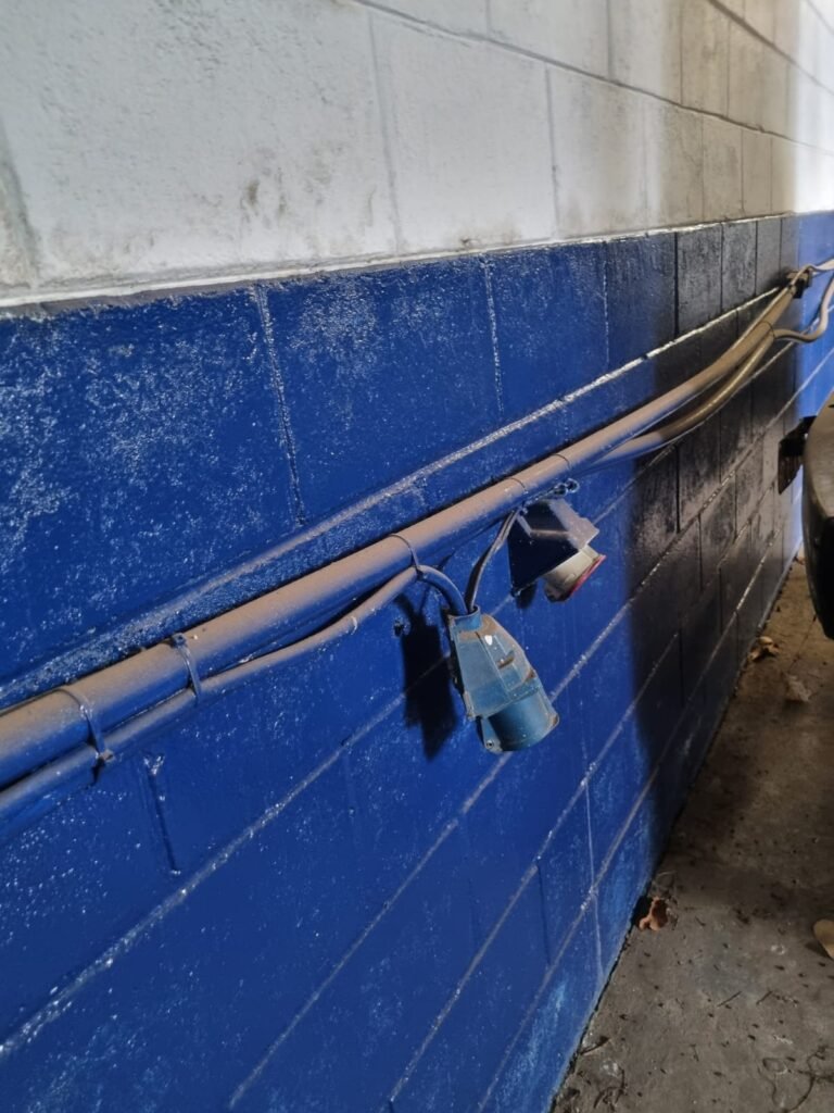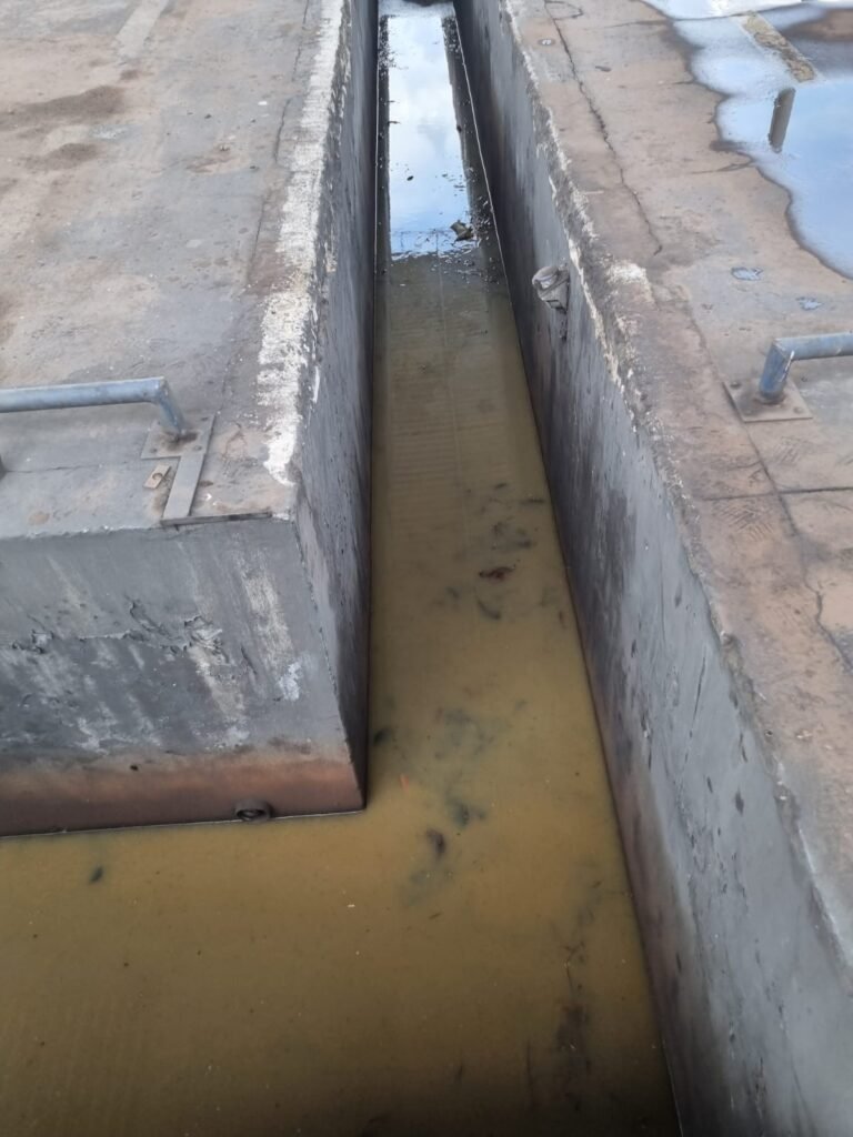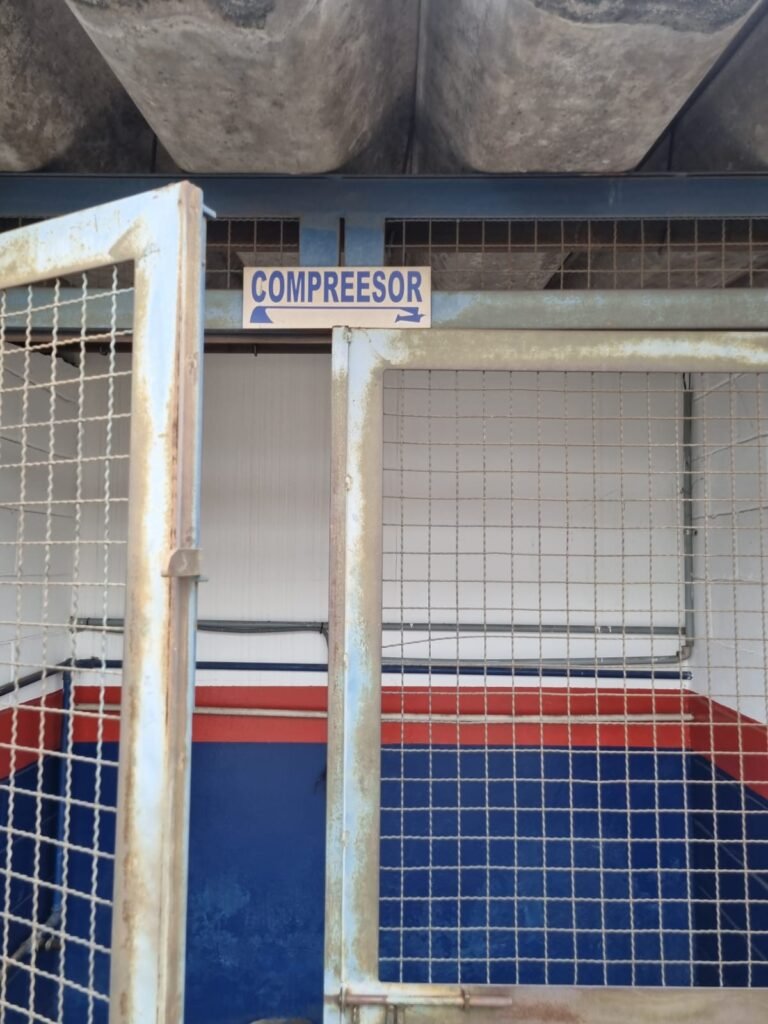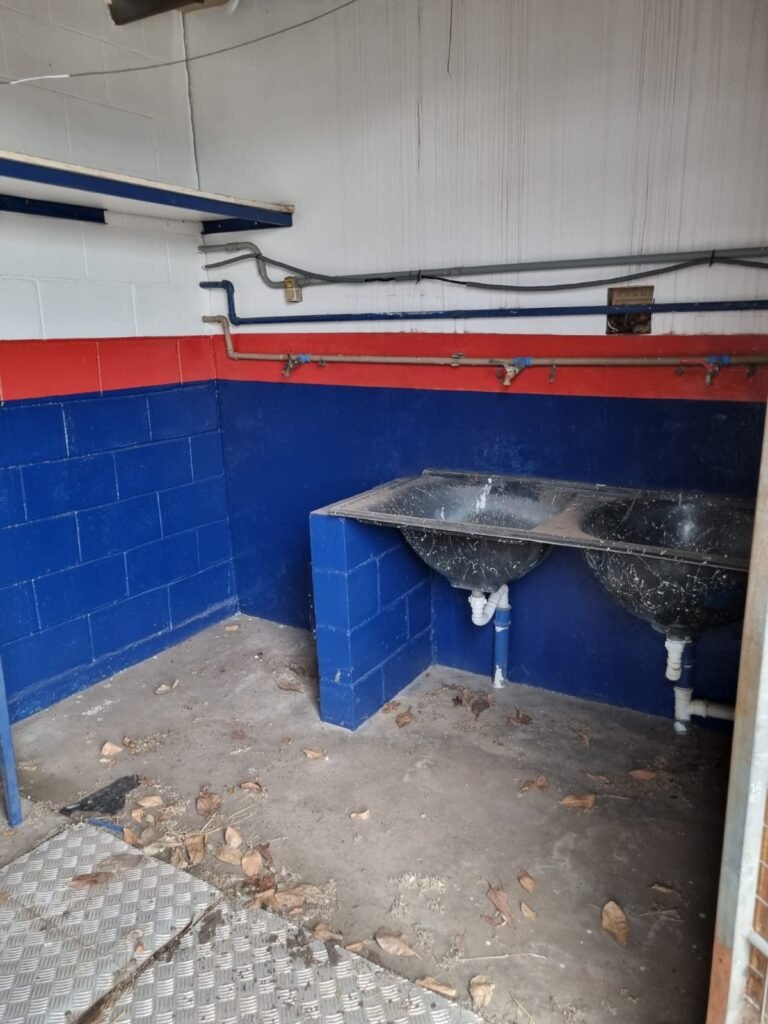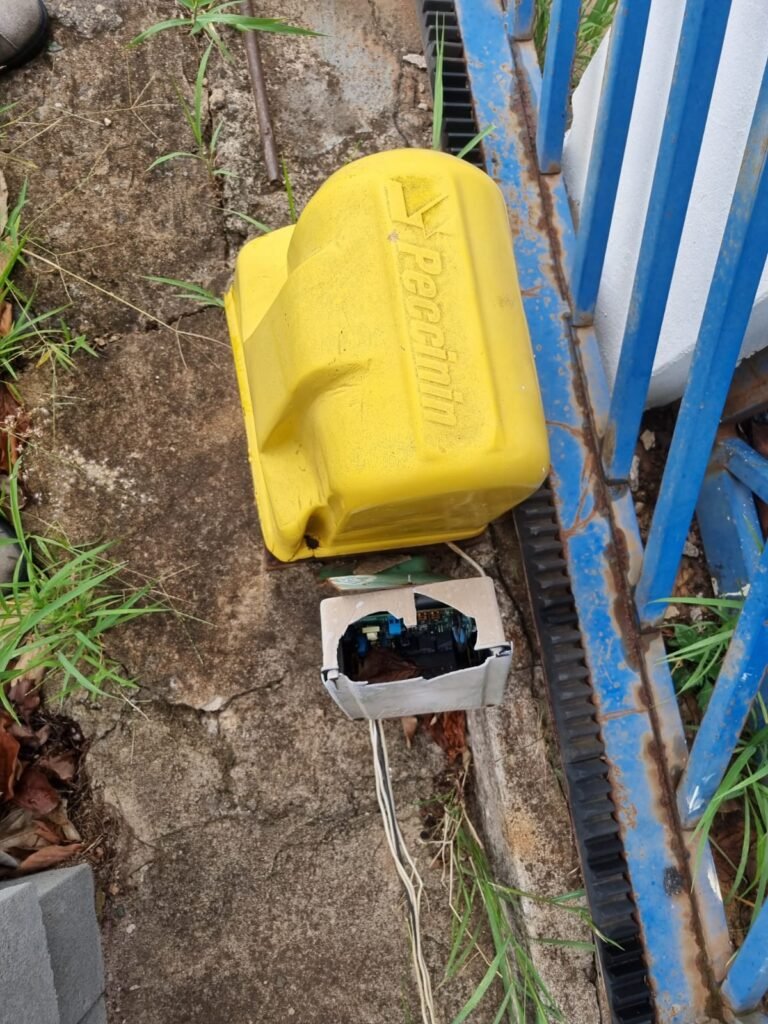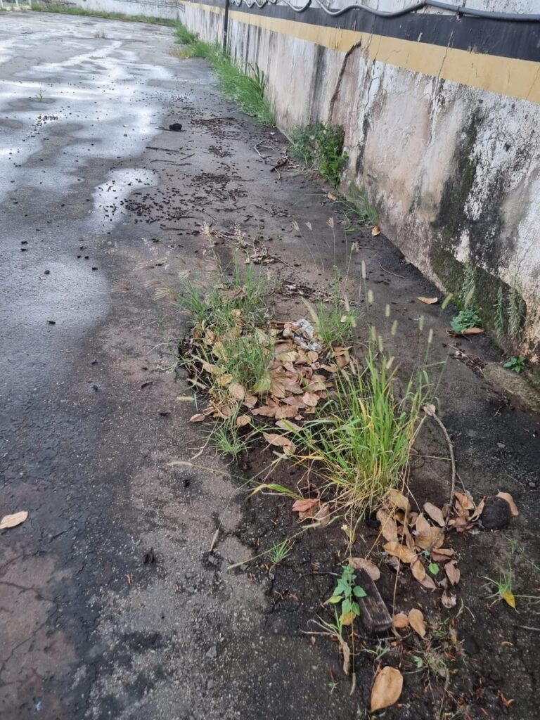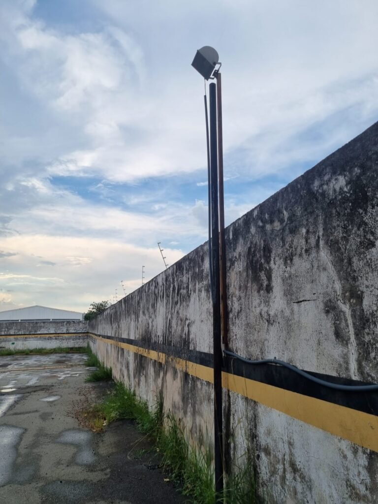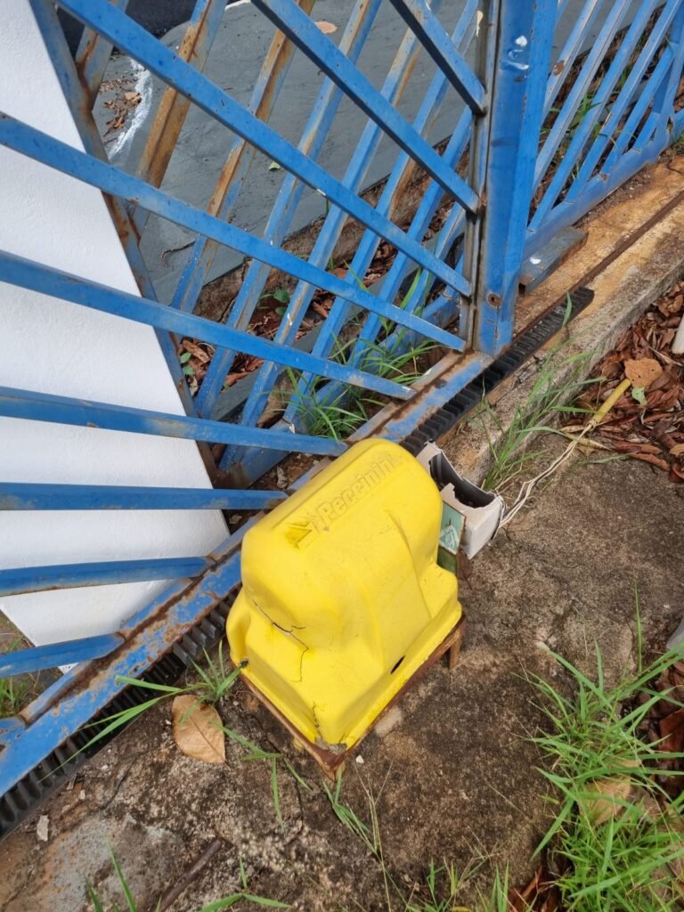 PÁTIO:- Piso parte massa asfáltica e parte em concerto com rachaduras, blocos de concreto estrutural, 01 tanque de combustível 15m3, sendo q a bomba esta desligada, mangueira com bico, 06 refletores sendo que 03 estão com lâmpadas queimadas, 01 rampa lavador, cobertura com telhado estrutura metálica e telhas galvanizadas em ordem com 02 valetas de manutenção, encanamento ar comprimido, 02 extintores pó químico 04 kg 20-B:C, 01 tanque de cimento com torneira em ordem, 01 torneiras de jardim, muros com reboco e pintura descascando, instalação fiação por eletrotubos com 02 tomadas e espelho de luz, ralo com grelha enferrujada, cobertura com telhas galvanizadas e com “placas” escrito : oficina, compressor, borracharia, lavador de peças, deposito; sendo que algumas estão quebradas, paredes com pintura barrado na cor azul, faixa na cor vermelha e restante na cor branca, 03 portões de correr com pintura na cor azul sendo que alguns estão quebrados e com pintura descascando, 01 portão de abrir com pintura na cor azul descascando, 01 tanque de blocos com torneira de jardim, 05 luminárias tubulares, 01 lâmpada bulbo Led, 01 ralo com grelha quebrada, 01 portão com pintura na cor branco com trinco, 02 cubas cerâmica preta, 02 sifões sanfonado, 03 torneiras de jardim, instalação elétrica por eletrotubos , 02 estante, 01 tambor 200lt, 01 rampa com valeta para manutenção, 01 escova para lavar baú com motor WEG em ordem.