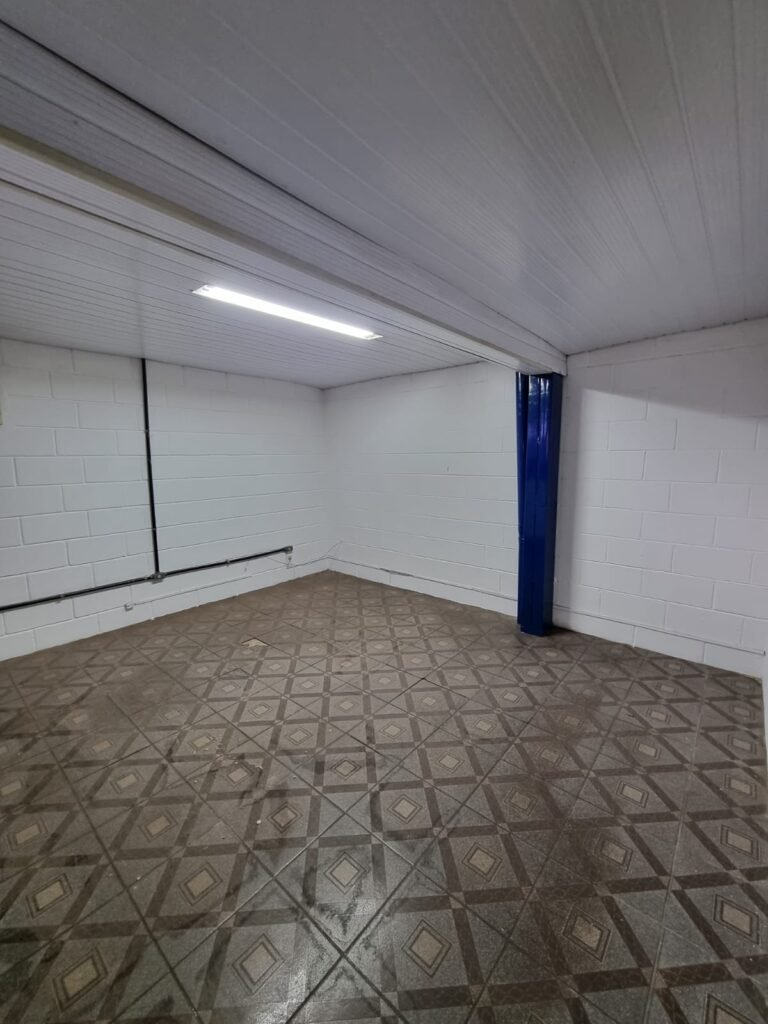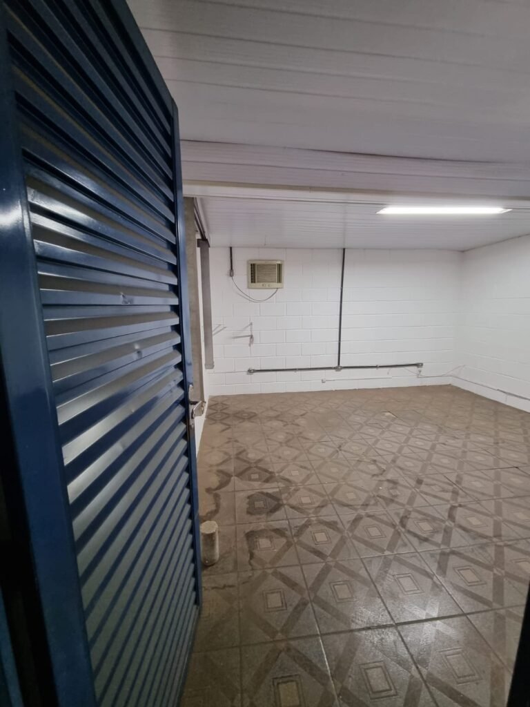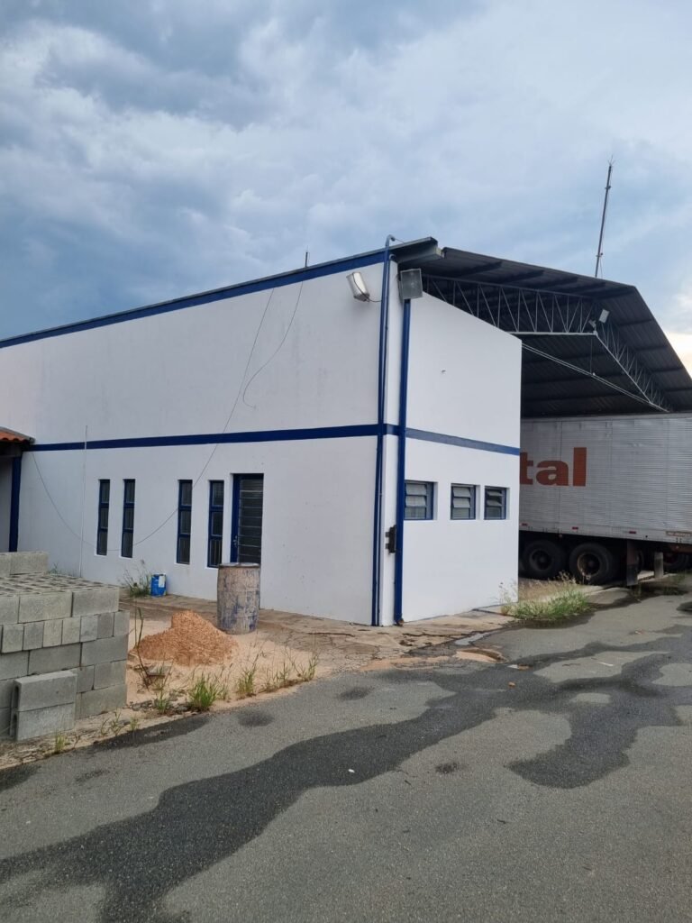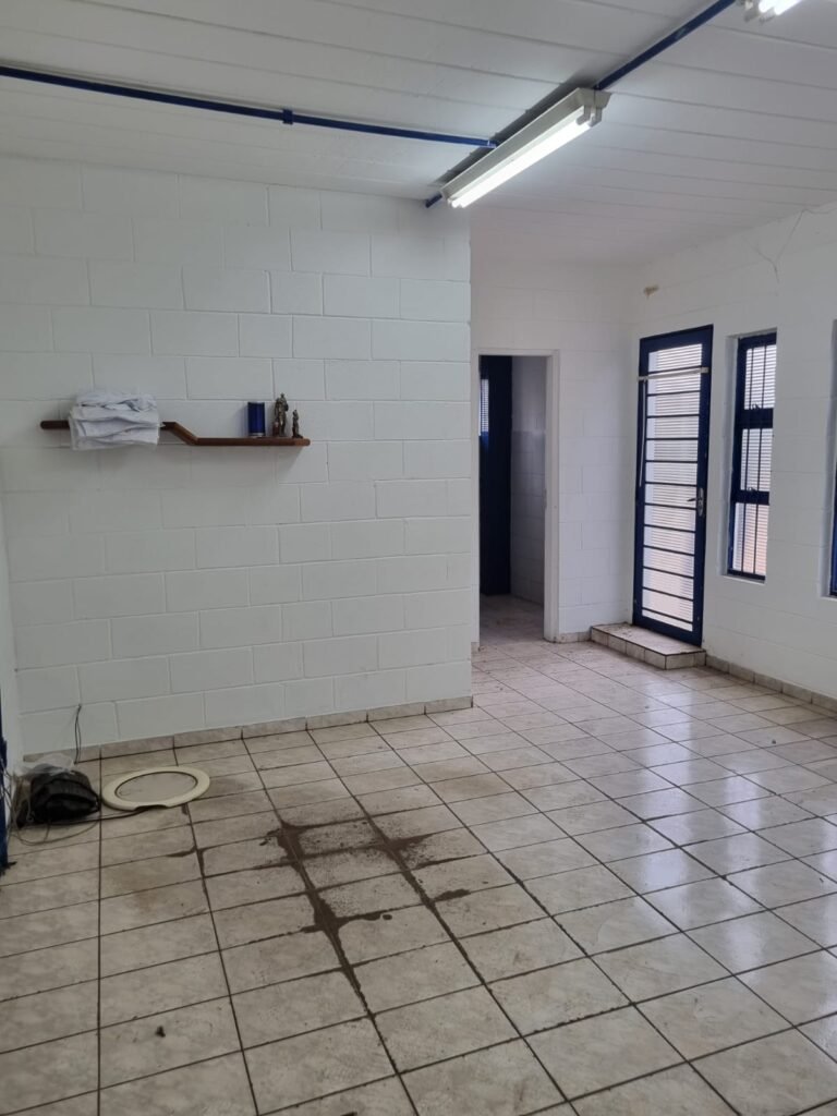 GALPÃO:- Piso concreto, 06 lustres com 05 lâmpadas em ordem, 05 lixeiras de plástico, 01 banco de jardim, 01 extintor água 2-A 10lt, instalação elétrica por eletrotubos com 02 tomadas steck, caixa de disjuntor com 12 disjuntores Lorenzetti, caixa de disjuntor com 05 disjuntores Mueller, 03 aparelhos de ar condicionado Eletrolux, paredes com pintura barrado e faixa na cor azul restante na cor branco em ordem.