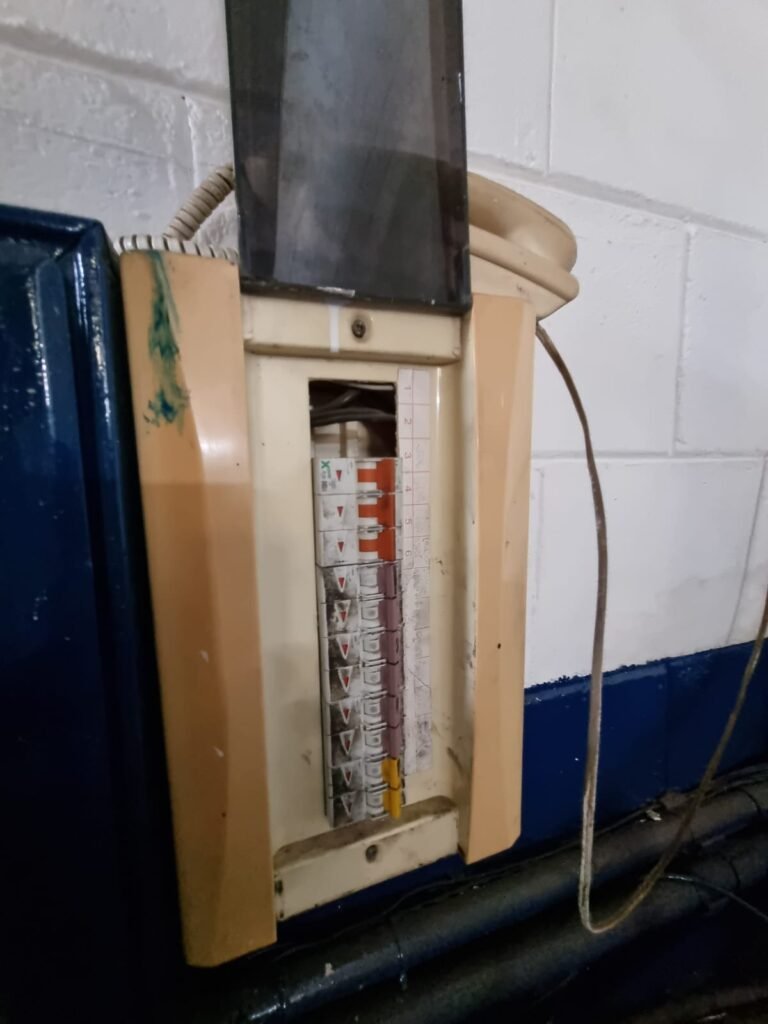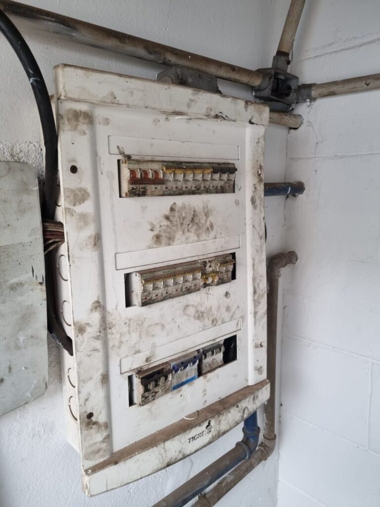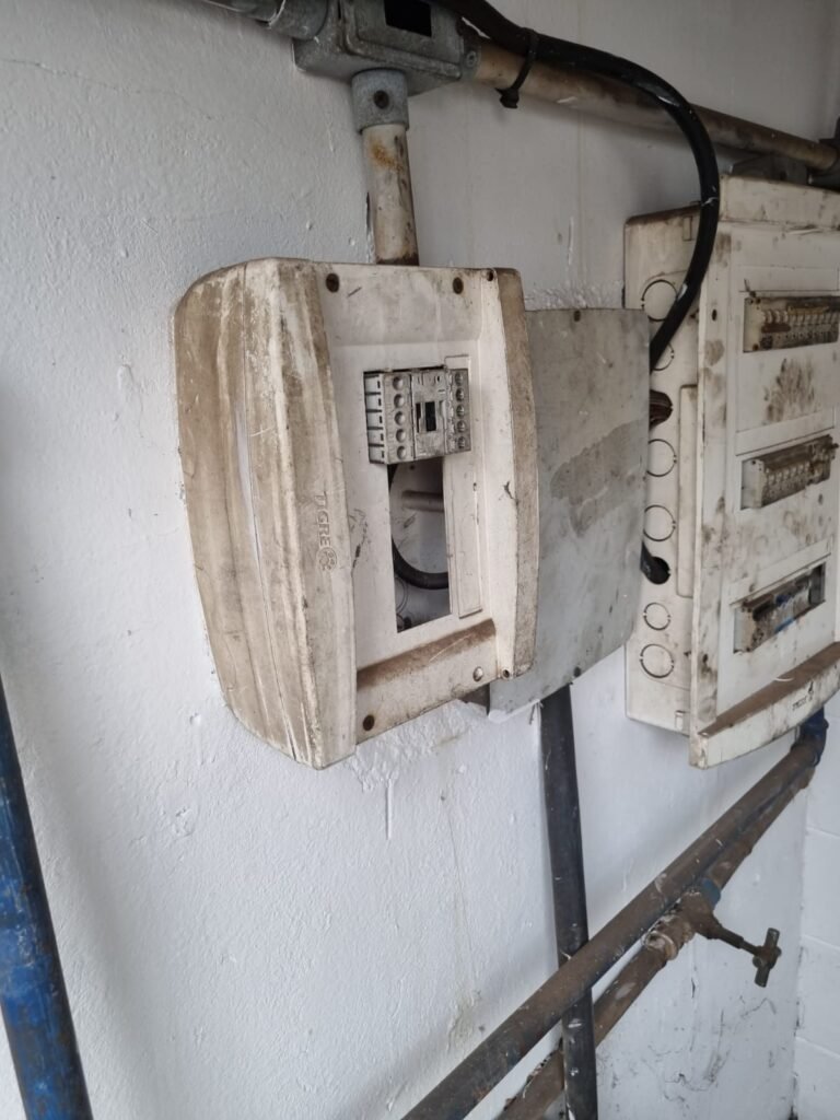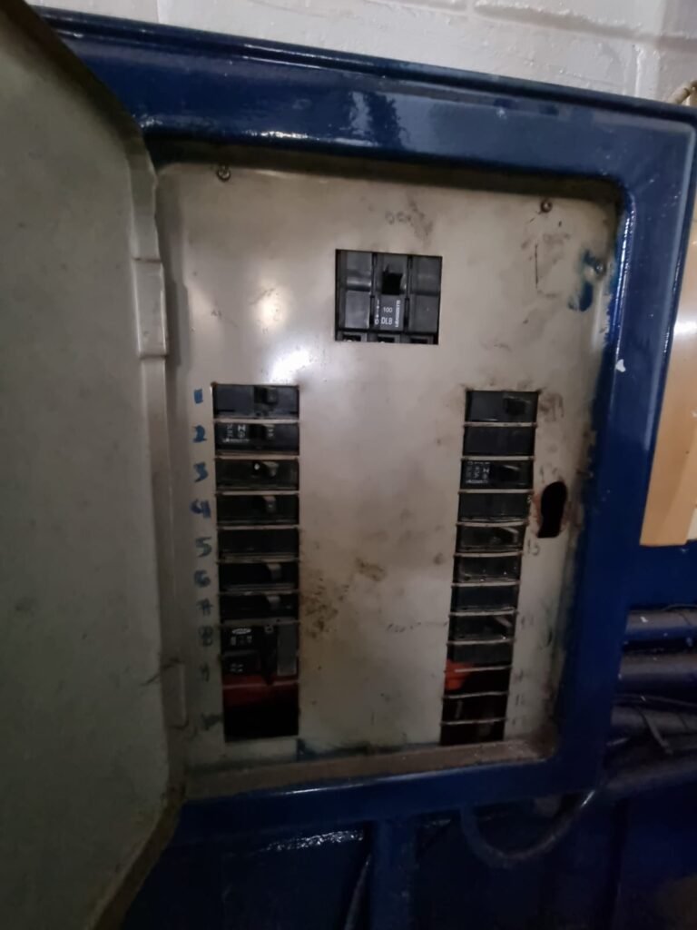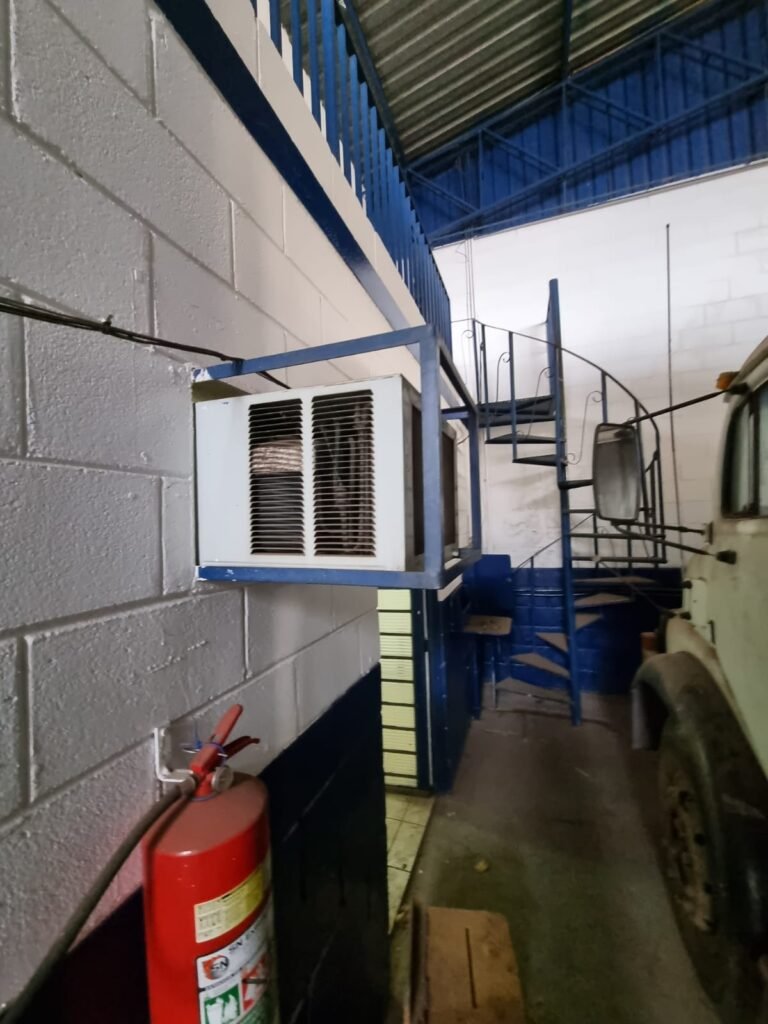 GALPÃO:- Piso concreto, 06 lustres com 05 lâmpadas em ordem, 05 lixeiras de plástico, 01 banco de jardim, 01 extintor água 2-A 10lt, instalação elétrica por eletrotubos com 02 tomadas steck, caixa de disjuntor com 12 disjuntores Lorenzetti, caixa de disjuntor com 05 disjuntores Mueller, 03 aparelhos de ar condicionado Eletrolux, paredes com pintura barrado e faixa na cor azul restante na cor branco em ordem.