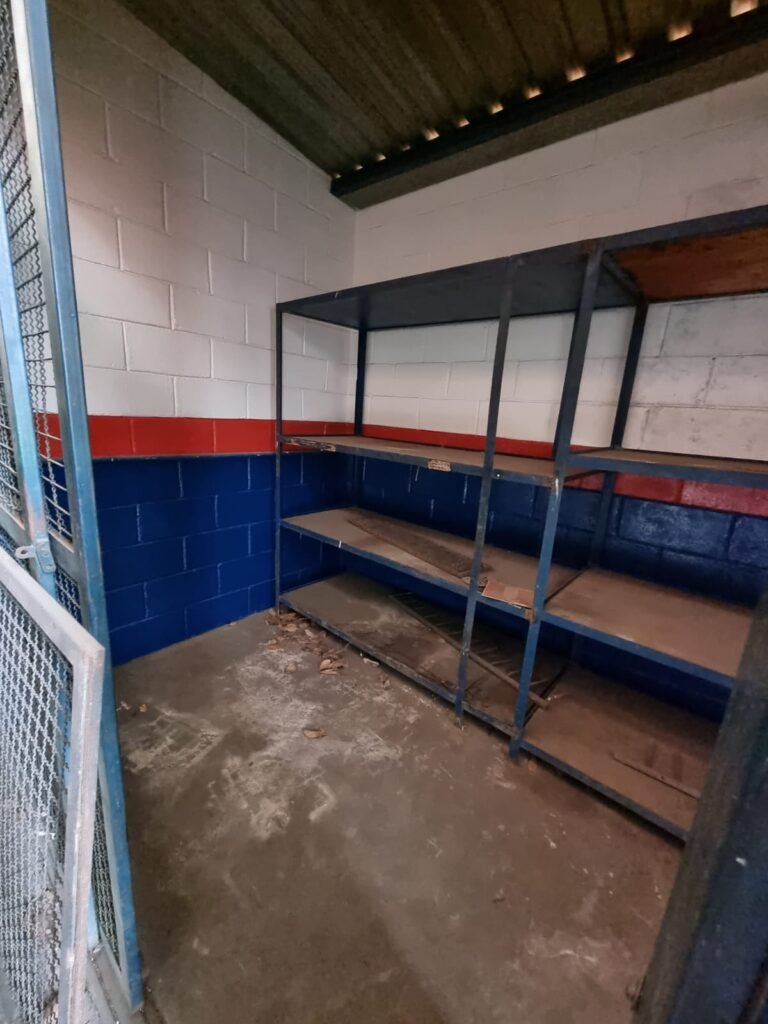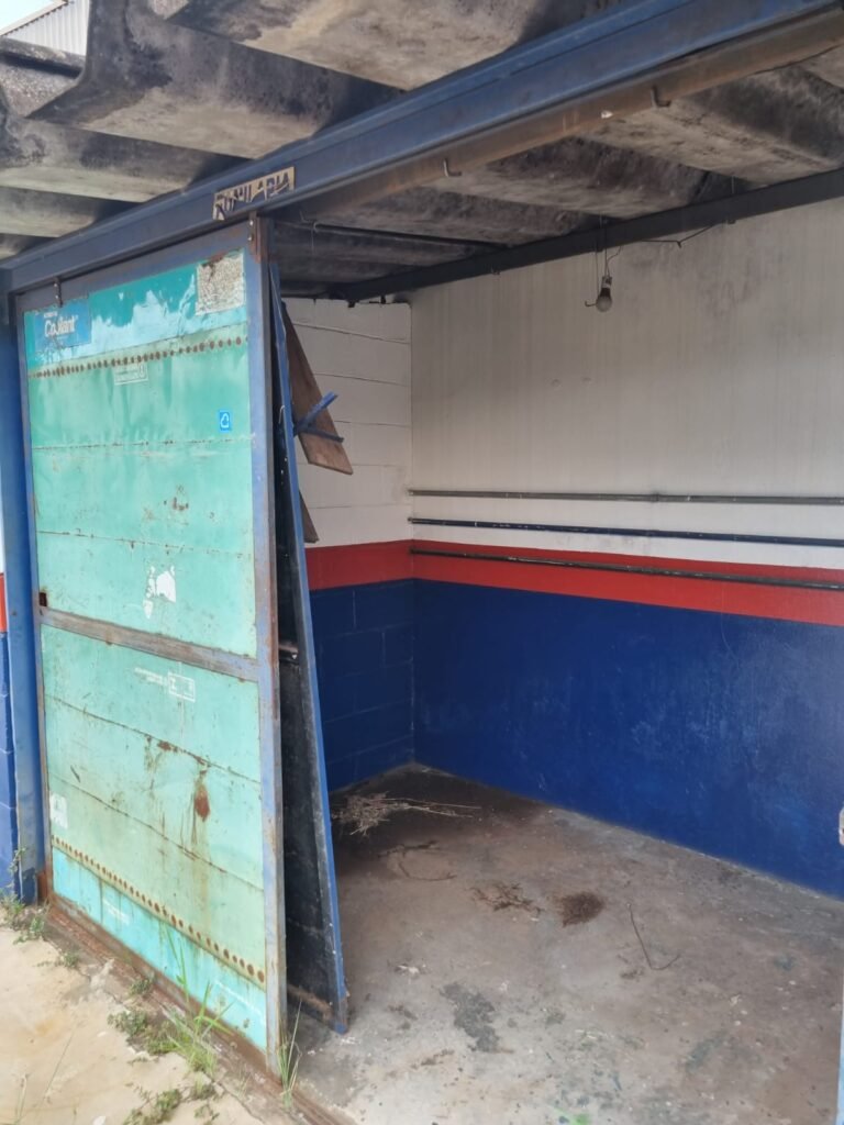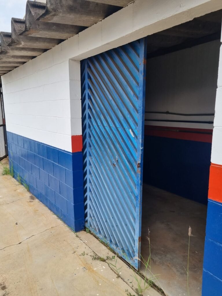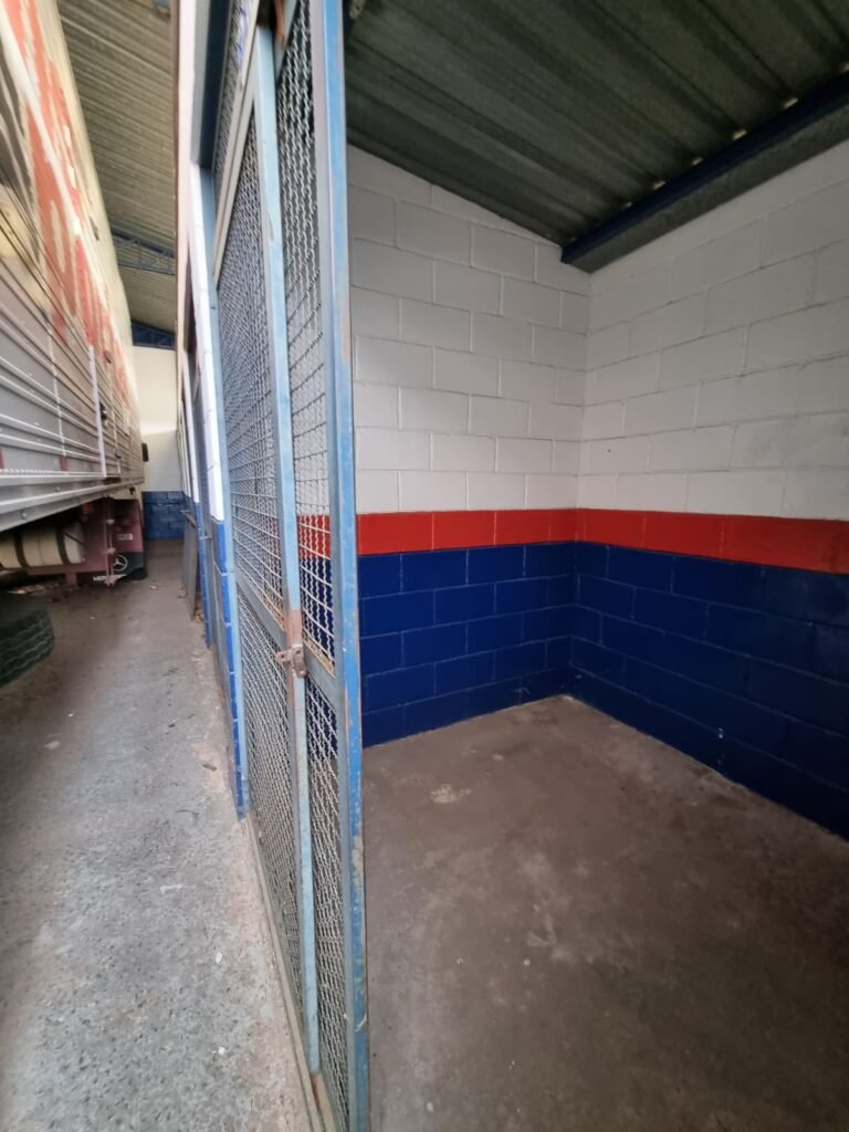 Boxes: 04 Boxes com portão de correr com pintura na cor azul, paredes dos boxes com pintura barrado na cor azul, faixa na cor vermelha e restante na cor branca, 02 estantes/armários, piso concreto, lâmpadas em ordem.