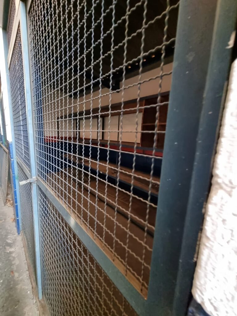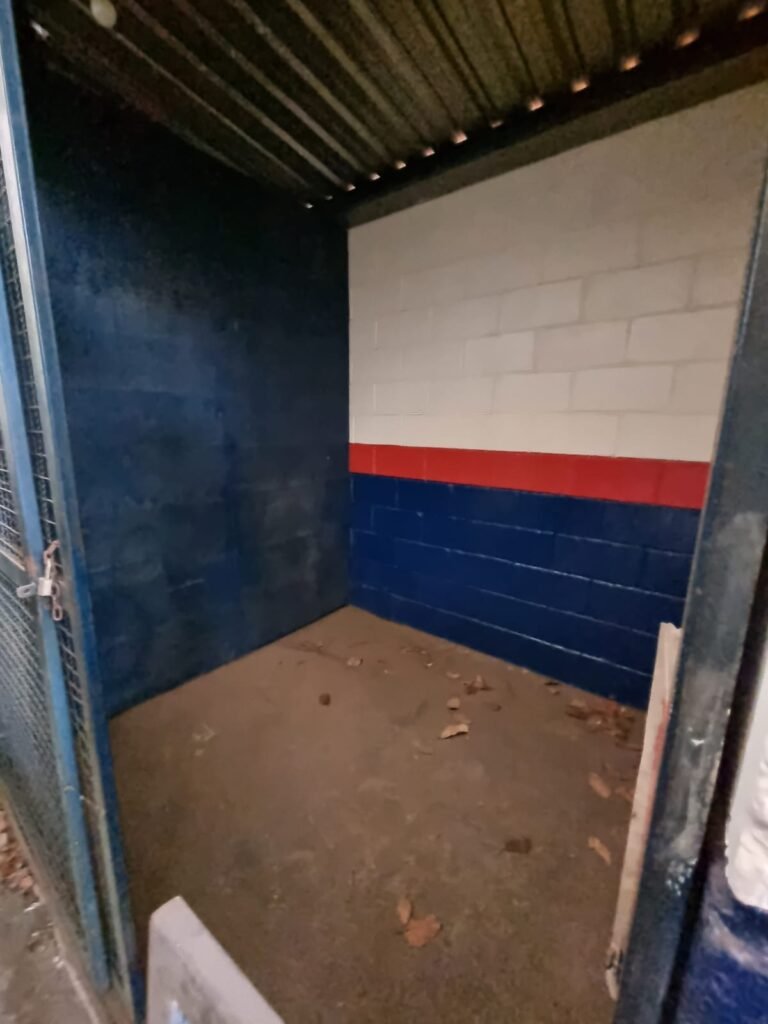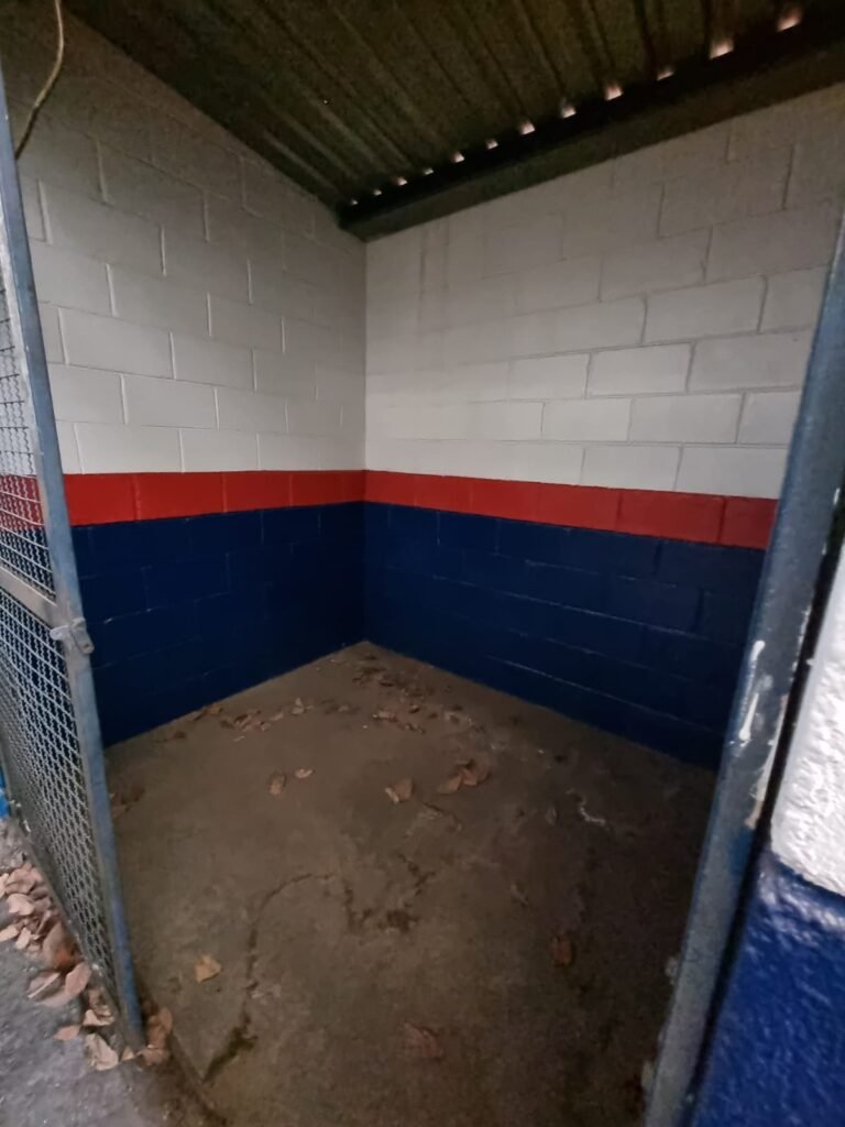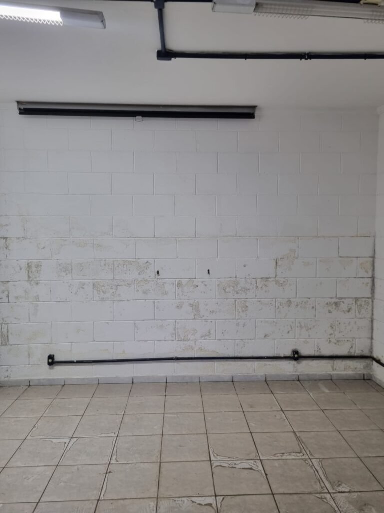 Boxes: 04 Boxes com portão de correr com pintura na cor azul, paredes dos boxes com pintura barrado na cor azul, faixa na cor vermelha e restante na cor branca, 02 estantes/armários, piso concreto, lâmpadas em ordem.