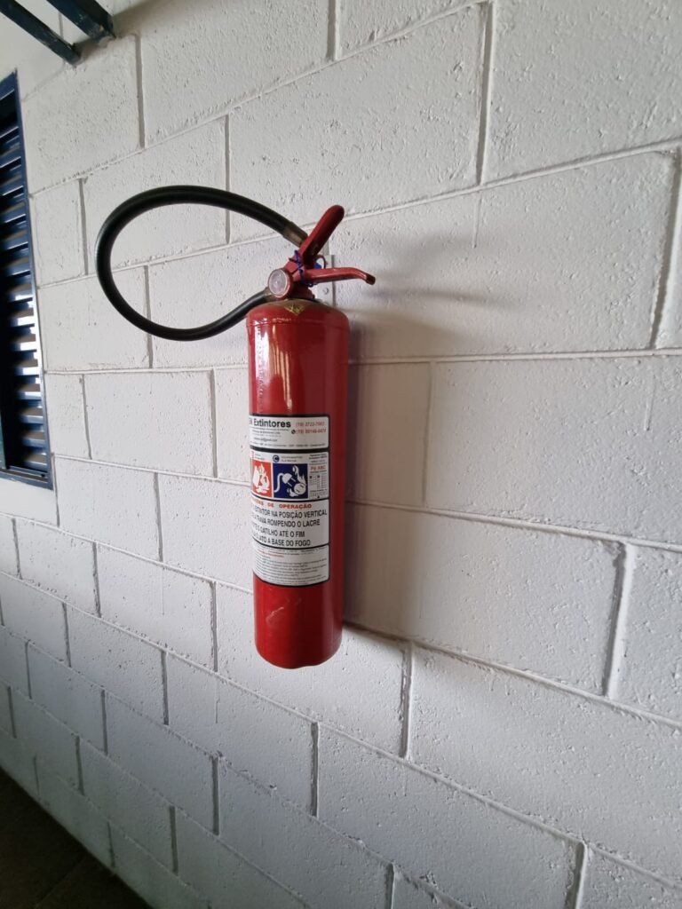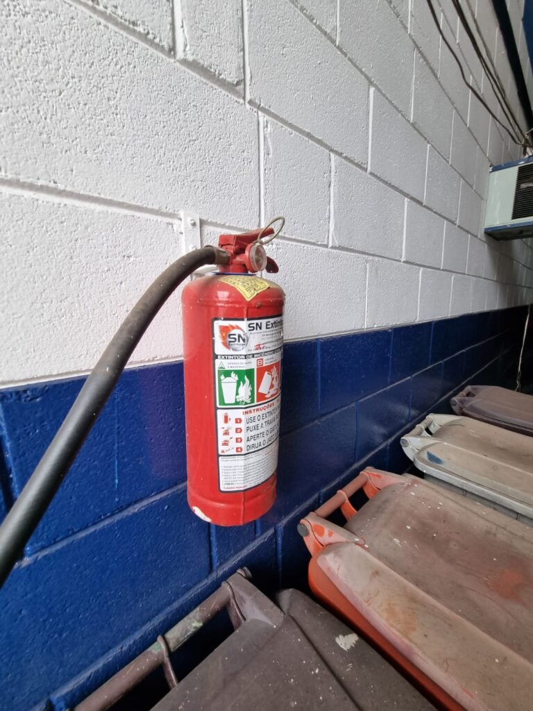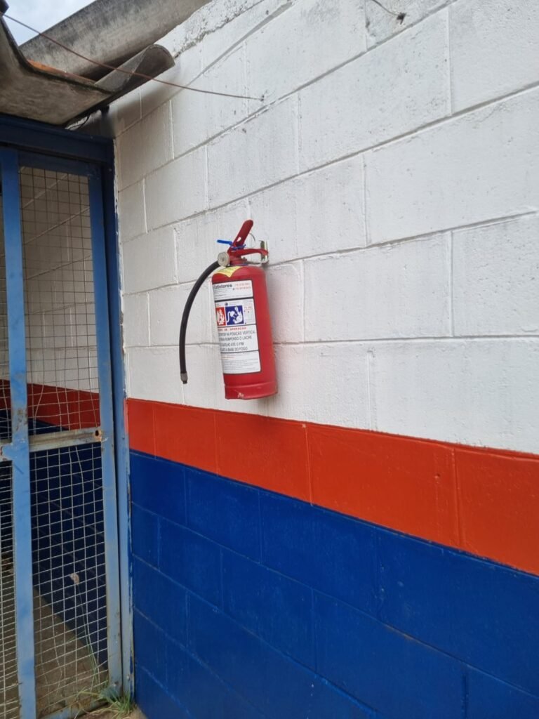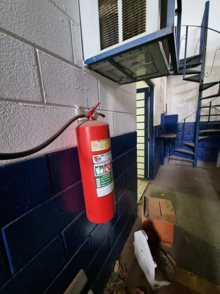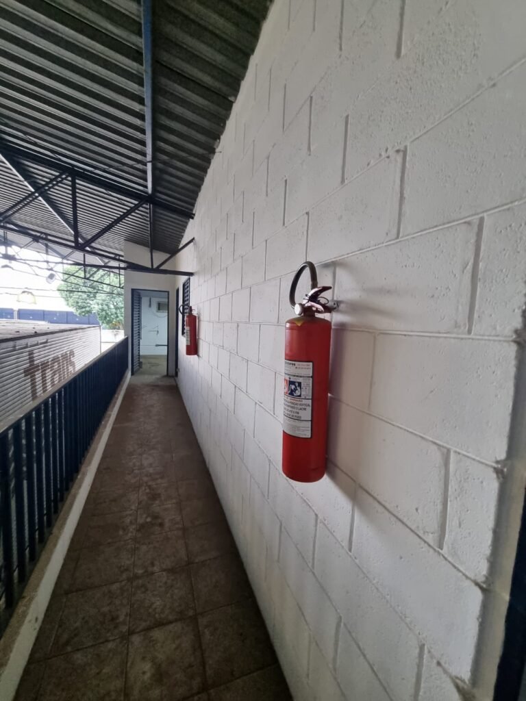 CORREDOR com piso cerâmico branco mesclado, guarda corpo de ferro com pintura na cor azul, 02 extintores carga pó químico,paredes com pintura na cor branco neve.