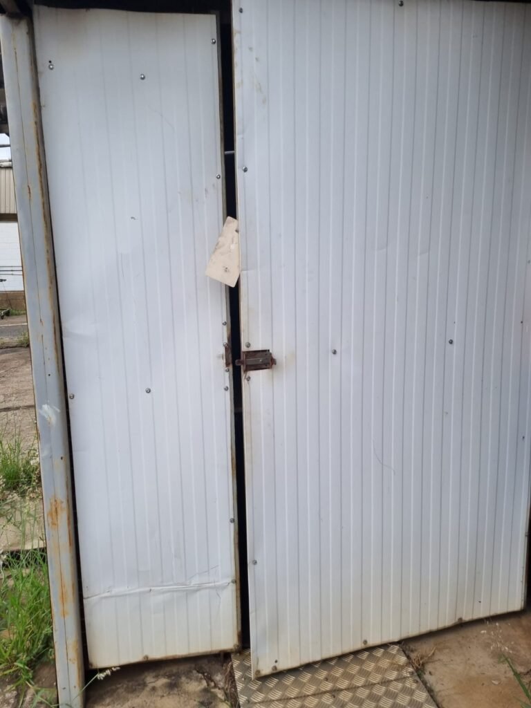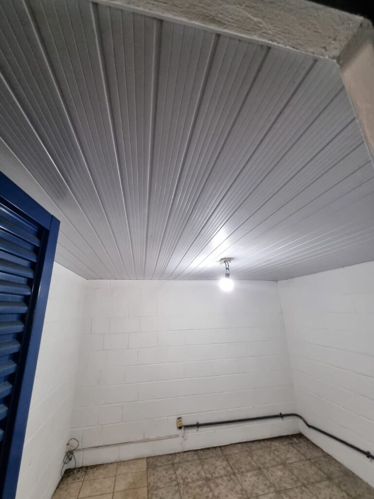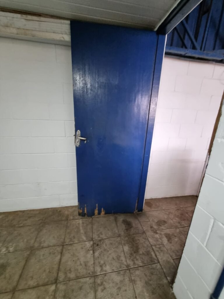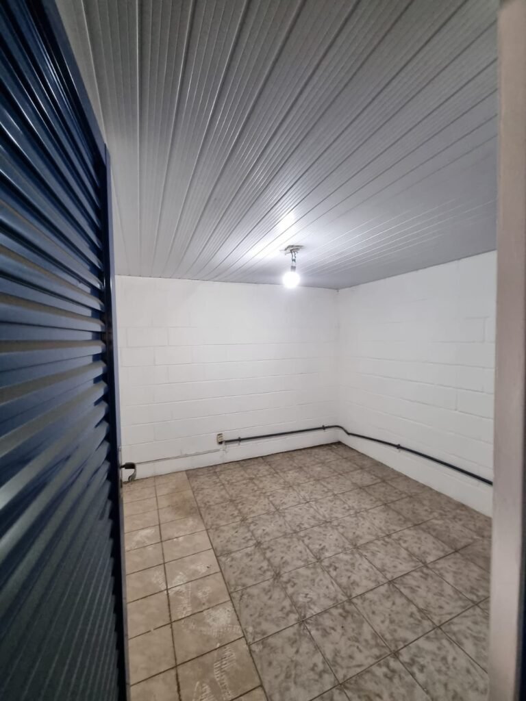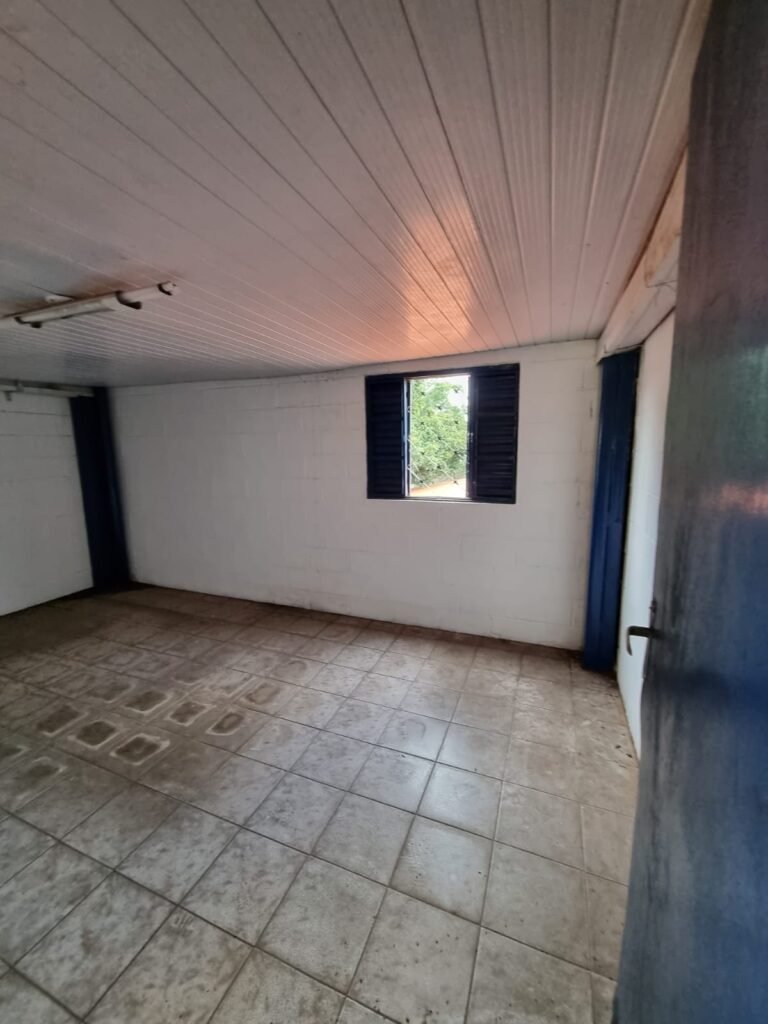 SALA 2:- Piso cerâmico mesclado, paredes e teto com pintura na cor branco neve, instalação elétrica por eletrotubos com tomadas, 01 lâmpada bulbo led em ordem, porta de alumínio com pintura na cor azul.