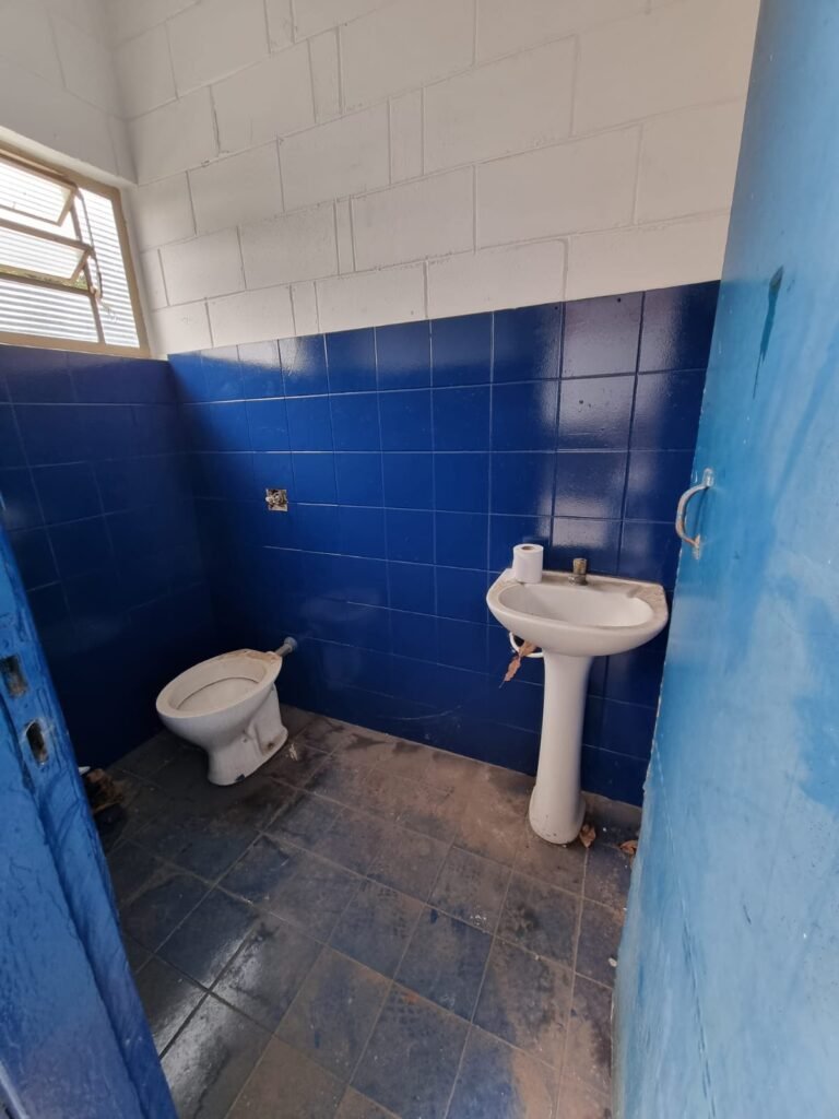 WC 1:- Piso cerâmico na cor azul, paredes ½ com azulejo cerâmico azul e restante com pintura na cor branco, 01 vitro basculante com 05 vidros canelados, vaso sanitário cerâmica branca, valvulares de descarga, conjunto lavatório com coluna cerâmica branca, 01 torneira, porta de madeira com pintura na cor azul, 01 lâmpada em ordem.