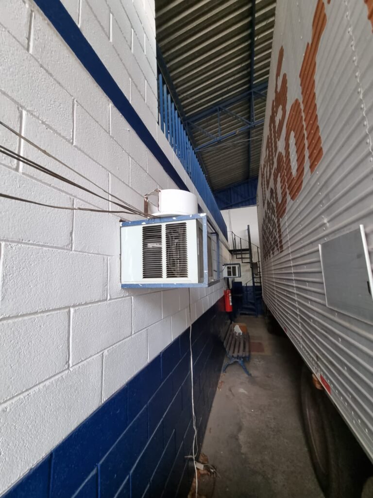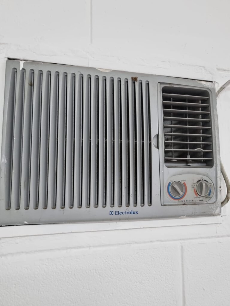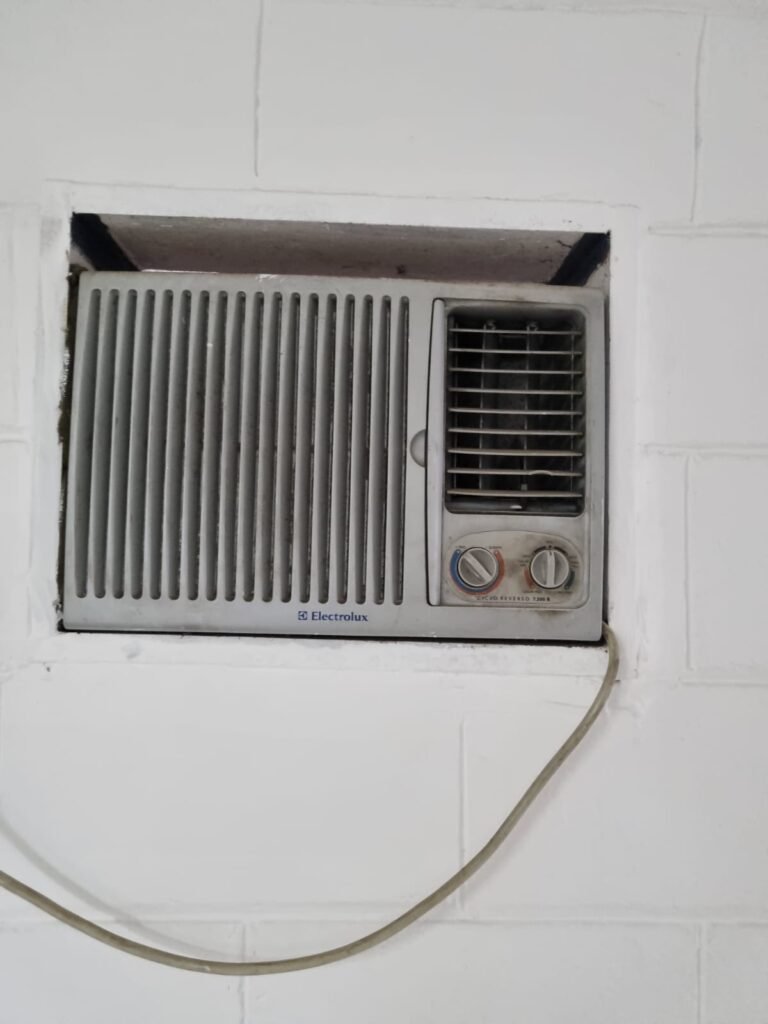 SALA 3:- Piso cerâmico bege/marrom, paredes e teto com pintura na cor branco neve, 01 coluna com pintura na cor azul, 01 luminárias tubular com 02 lâmpadas led tubulares em ordem, instalação elétrica por eletrotubos com tomadas, 01 aparelho de ar condicionado Eletrolux, 01 janela de aço com 08 vidros e insulfilme roxo, 01 persiana vertical, 03 mãos francesas em ordem