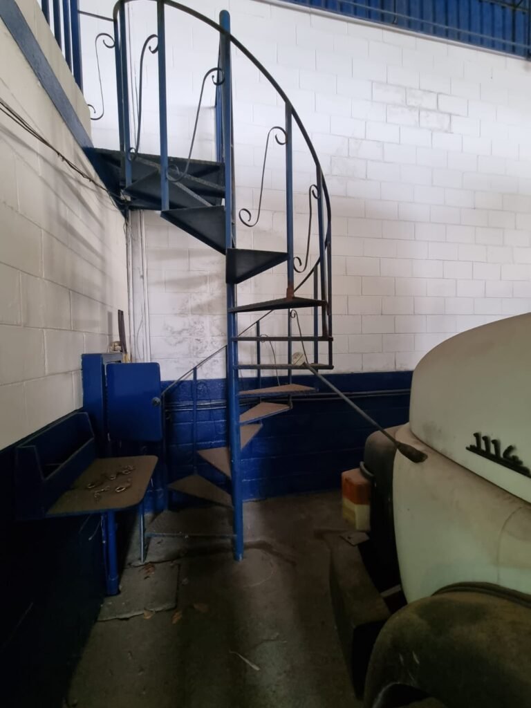ESCADA caracol com corrimão e guarda corpo de ferro com pintura na cor azul.