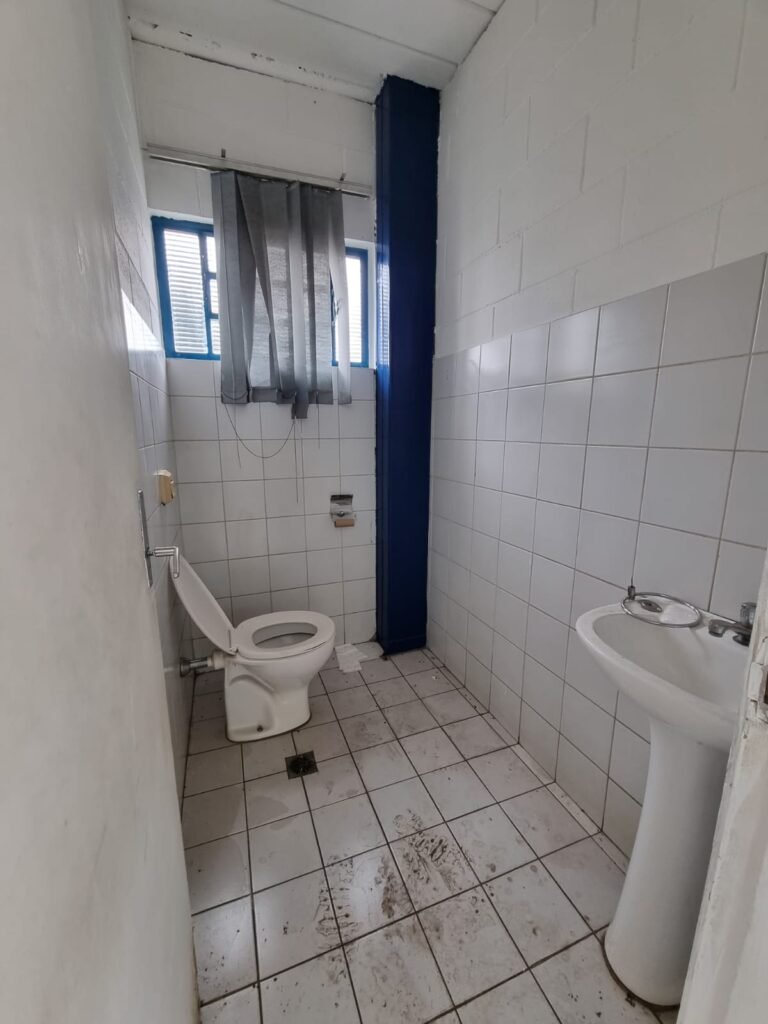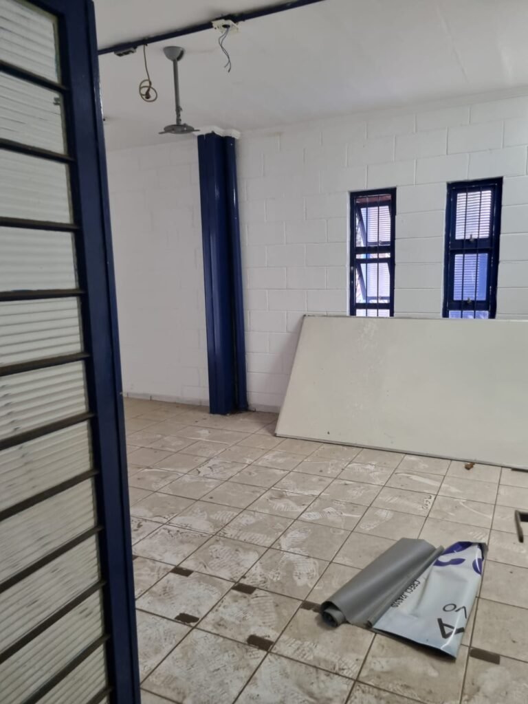 ESCRITÓRIO 1:- Piso cerâmico mesclado, paredes e teto com pintura na cor branco neve m ordem, 01 aparelho ar condicionado Eletrolux, instalação elétrica por eletrotubos com tomadas, 02 luminárias tubulares com 02 lâmpadas Led tubulares em cada, 01 porta de ferro com 12 vidros canelados, 04 vitrôs basculantes com 09 vidros canelados cada em ordem, 01 prateleira marrom, 01 porta de madeira com pintura na cor branca