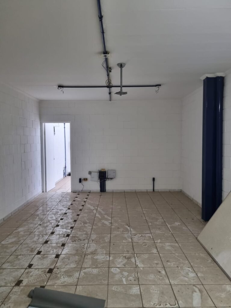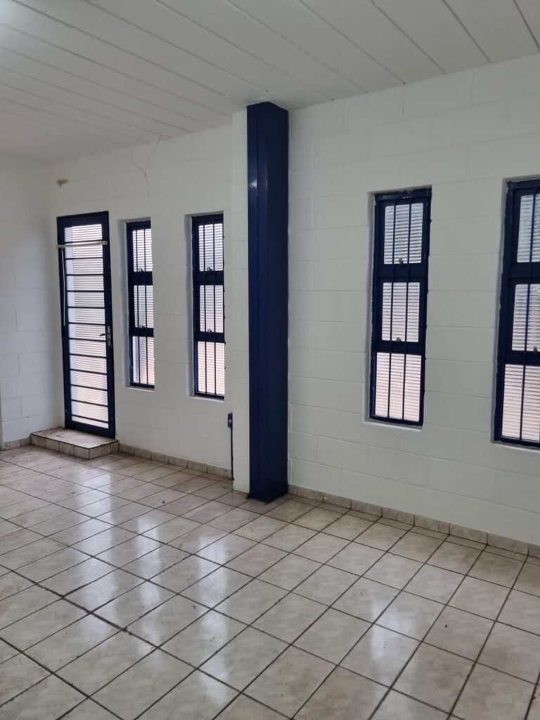 SALA 1:- Piso cerâmico branco mesclado, paredes e teto com pintura na cor branco neve, “colunas/quinas” com pintura na cor azul, janela de alumínio com grade e pintura na cor azul, porta de madeira com pintura na cor azul sendo que a parte de baixo esta descascando, 01 luminárias tubular com 02 lâmpadas led tubulares, instalação elétrica por eletrotubos com tomadas.