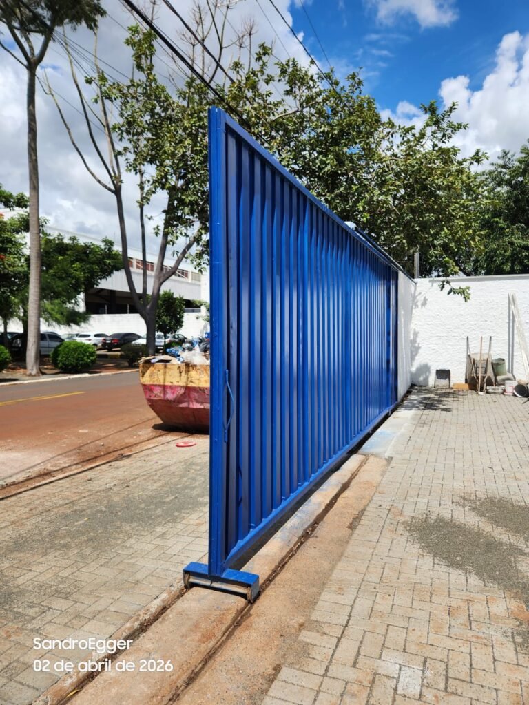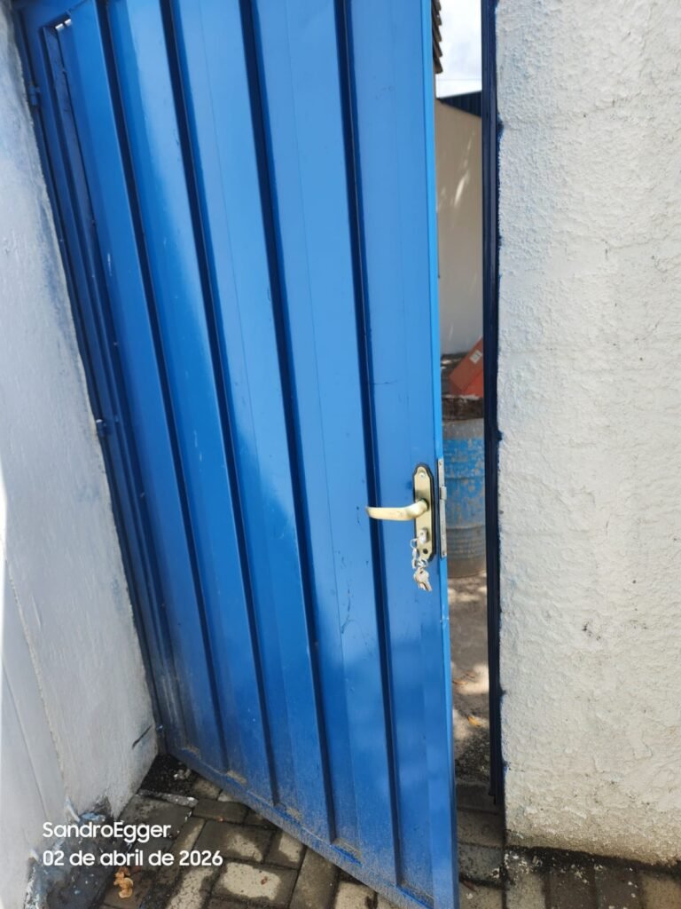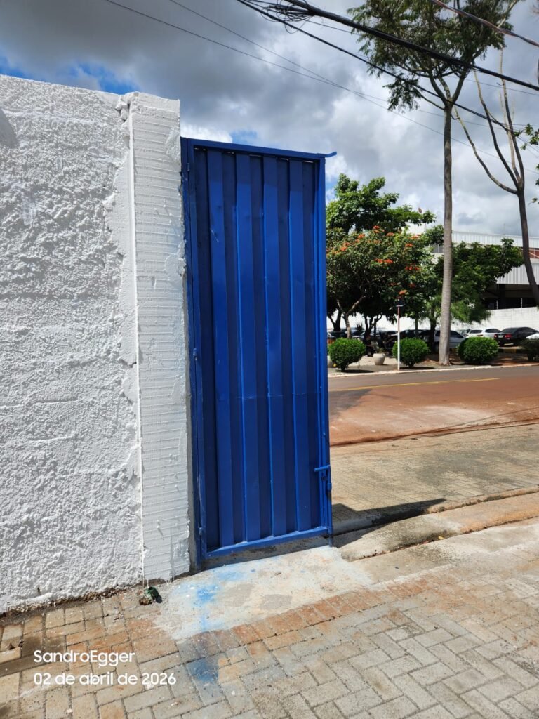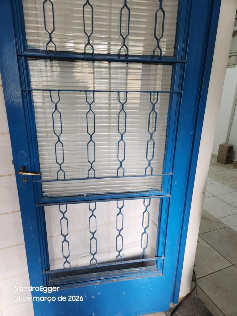 PÁTIO:- piso revestido de bloquetes de concreto intertravados, escada de alvenaria com pintura nova na cor cinza e branco em ordem, corrimão novo e em ordem, batentes de doca novos e em ordem, cobertura de telhas galvanizadas contendo 03 lâmpadas de led em ordem, 01 refletor de LED em ordem, 01 porta social de ferro com pintura nova na cor azul com maçanetas e fechadura em ordem e com chave, muros laterais com pintura nova na cor branco neve em ordem, 01 portão deslizante em chapas de metalon com pintura nova na cor azul em ordem, com puxadores em ordem e 01 trinco para cadeado e 01 fechadura ferrolho em ordem.