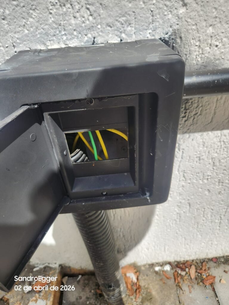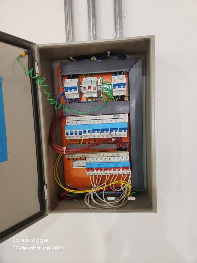 RECEPÇÃO:- Piso frio cerâmico, paredes com pintura na cor branco neve nova e em ordem, teto com pintura na cor branco neve em ordem, 01 ponto de luz com spot e lâmpada em ordem, porta de correr com pintura nova na cor azul em ordem, maçanetas em ordem, fechadura e chave em ordem, vidros transparentes lisos em ordem, motor eletrônico Peccinin desligado, 01 interruptor em ordem, 04 tomadas em ordem, 07 espelhos de luz em ordem, caixa de disjuntores em ordem, 06 disjuntores Pial Legrand UNIC sendo dois: C25 A e quatro: C30 A.