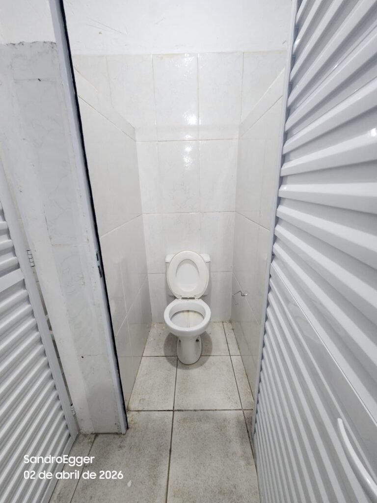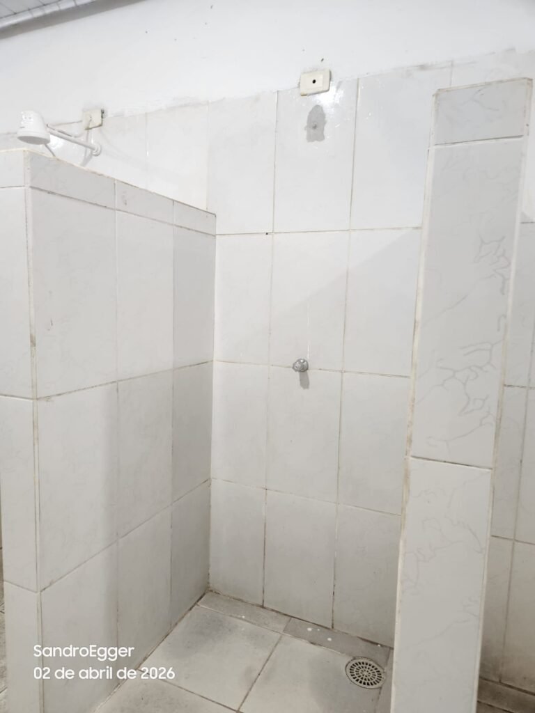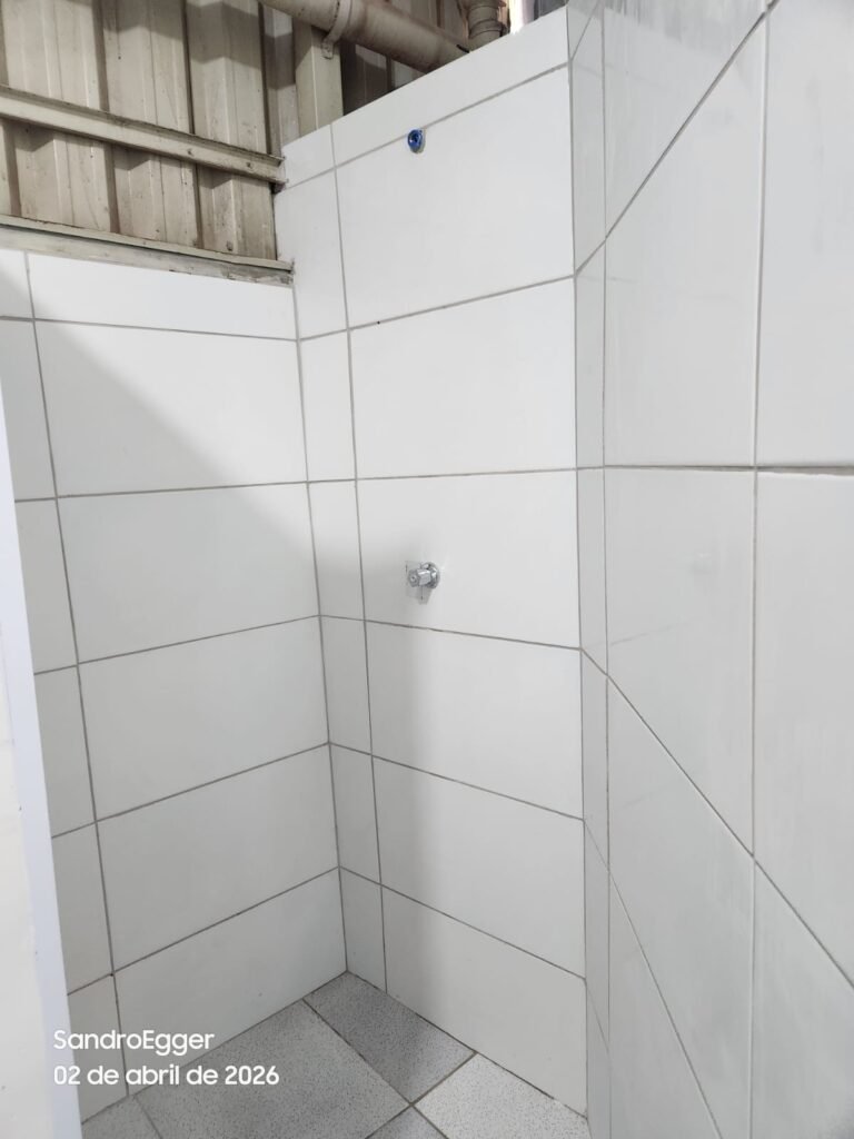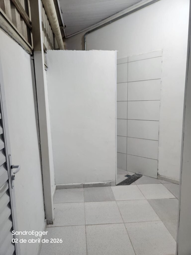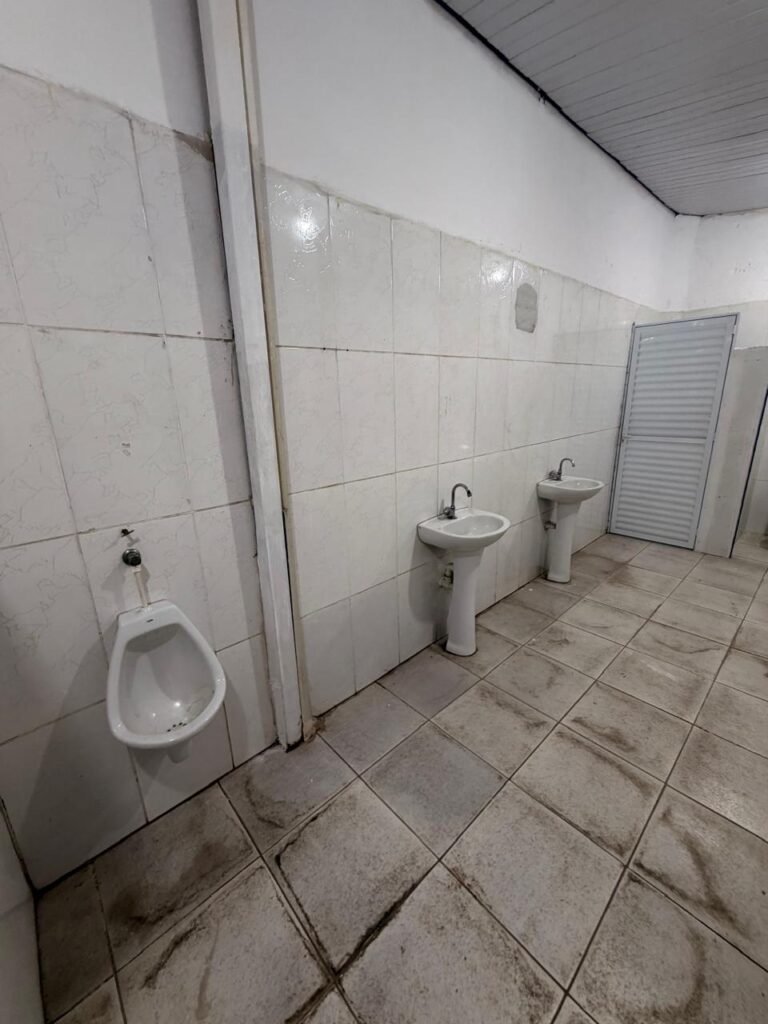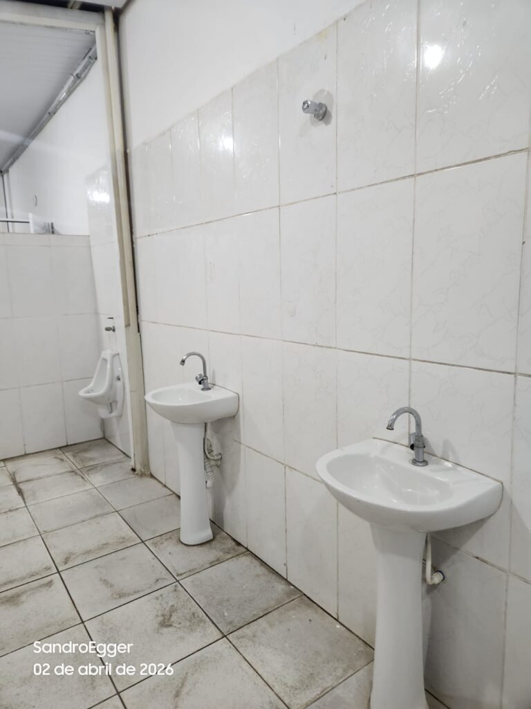 VESTIÁRIO:- Piso frio cerâmico em ordem, 04 ralos com tampa e desentupidos em ordem, paredes com azulejo 1/3 da parede em ordem, teto forro de PVC na cor branco em ordem, 04 box para chuveiro, 04 pontos para chuveiro, 02 conjunto lavatórios e colunas cerâmicas brancas em ordem, 02 torneiras bica móvel em ordem, 01 mictório cerâmica branca em ordem, 03 pontos de luz com spot e lâmpadas em ordem, 03 box com conjunto vaso sanitário e caixa de descarga acoplada em ordem, 03 portas de madeira envernizadas em ordem.