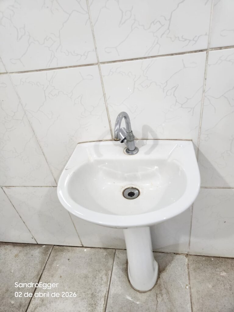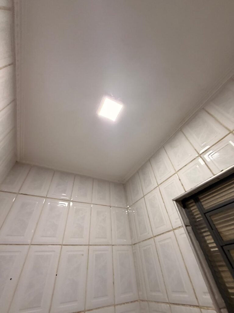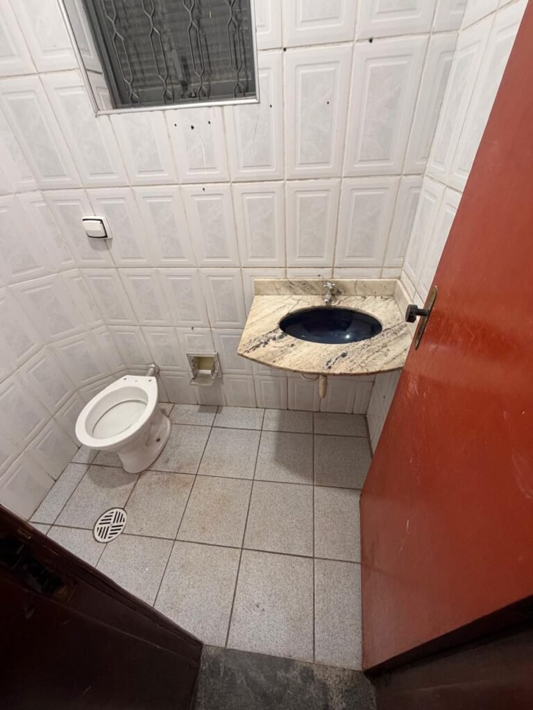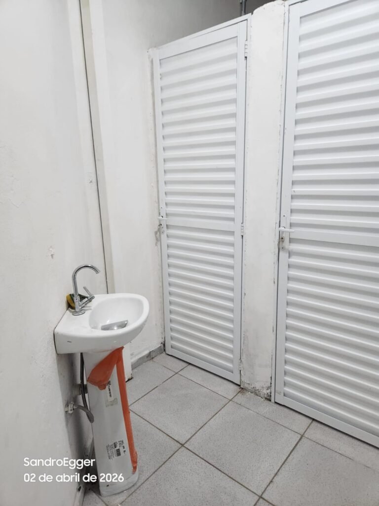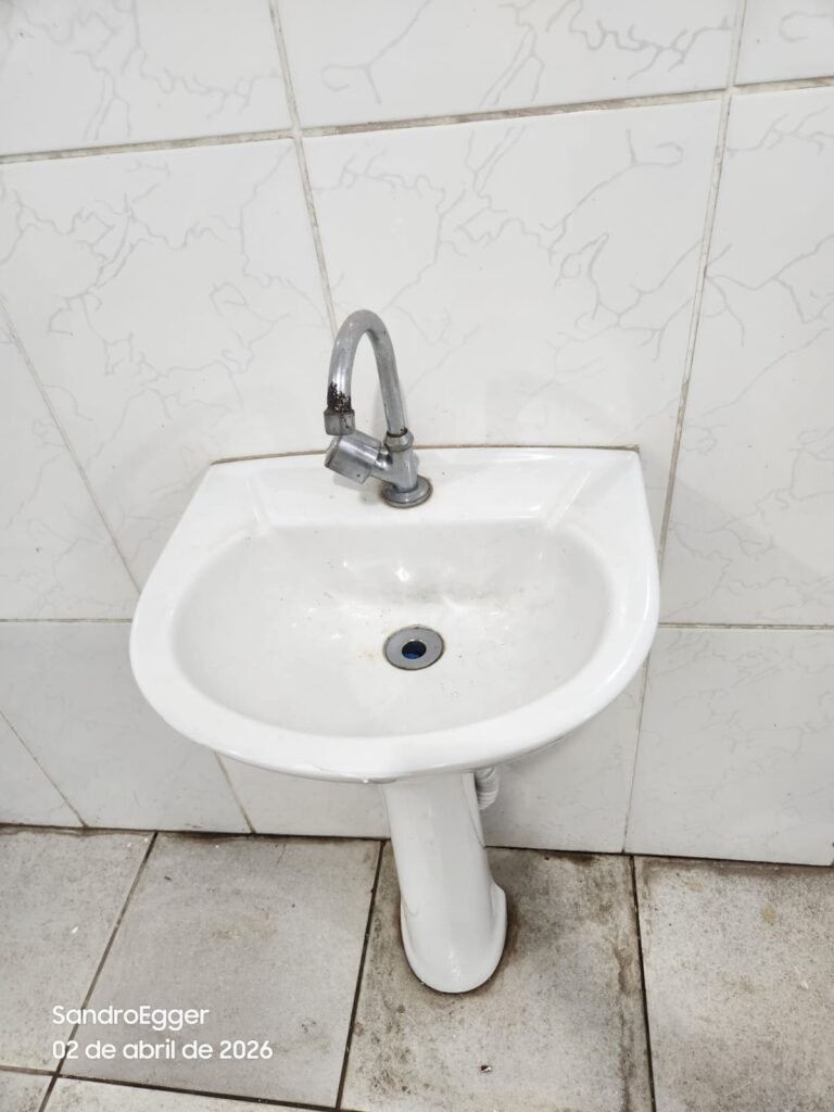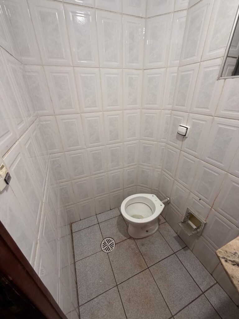 BANHEIRO:- Piso frio cerâmico em ordem, azulejo ate o teto com buracos com bucha restante em ordem, teto e gola de gesso com pintura na cor branco neve em ordem, 01 ponto de luz com spot com spot e lâmpada plafon de sobrepor LED em ordem, porta de madeira envernizada em ordem, maçanetas em ordem, fechadura e chave fixa em ordem, vitrô basculante em ordem, 06 vidros em ordem, válvula de descarga hydra em ordem, vaso sanitário cerâmica branca topázio em ordem, conjunto de lavatório e coluna cerâmica branca em ordem, torneira em ordem, 01 interruptor em ordem, 01 tomada em ordem, sem chuveiro.