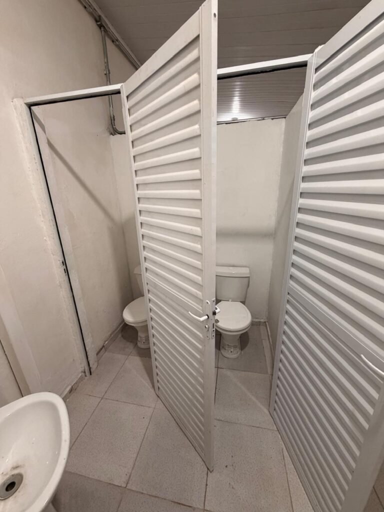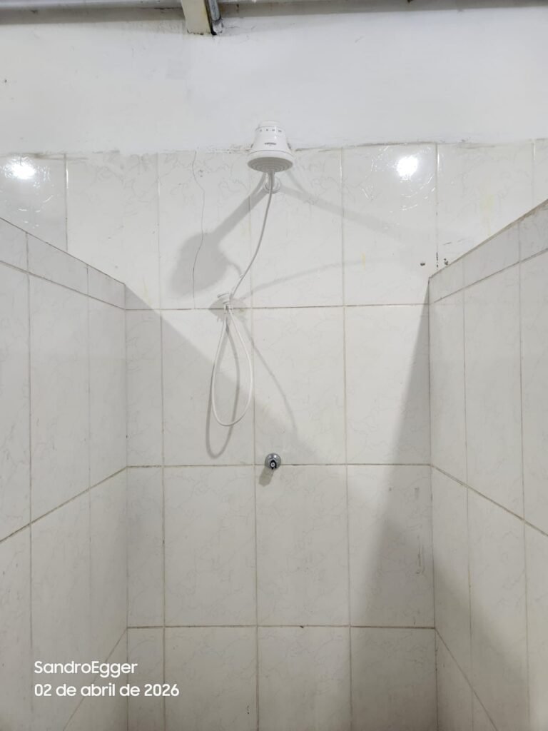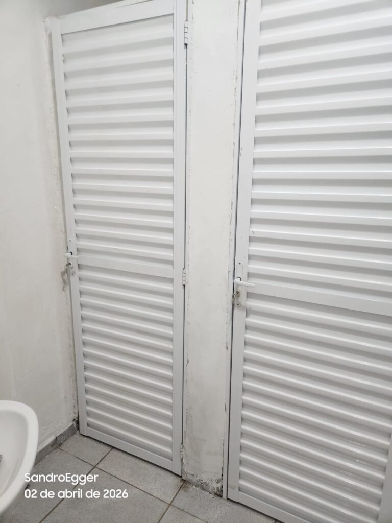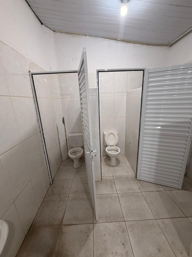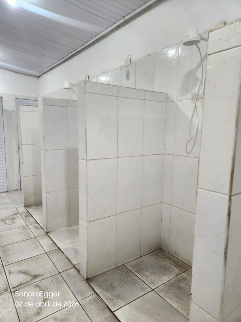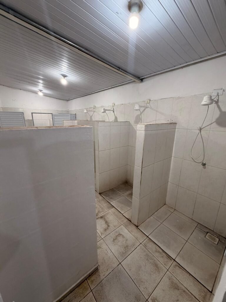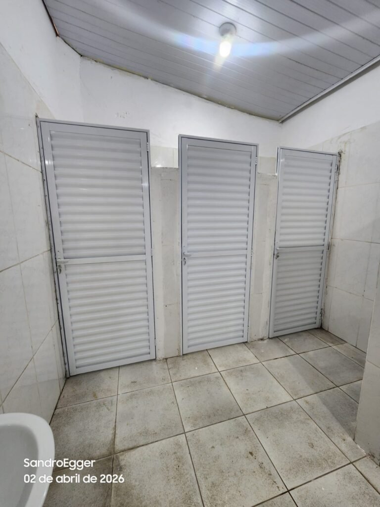 PARTE MASCULINA: contendo 01 mictório de cerâmica na cor branco em ordem, 04 chuveiros novos marca faminho em ordem, 03 conjuntos de vaso sanitários sendo que apenas 01 deles possuem tampa e assento, 02 vias com colunas de cerâmica com desgastes naturais e restante em ordem, 07 portas venezianas de alumínio novas em ordem, 07 lâmpadas LED em ordem, 04 espelhos de luz contendo 03 interruptores e 01 tomada.