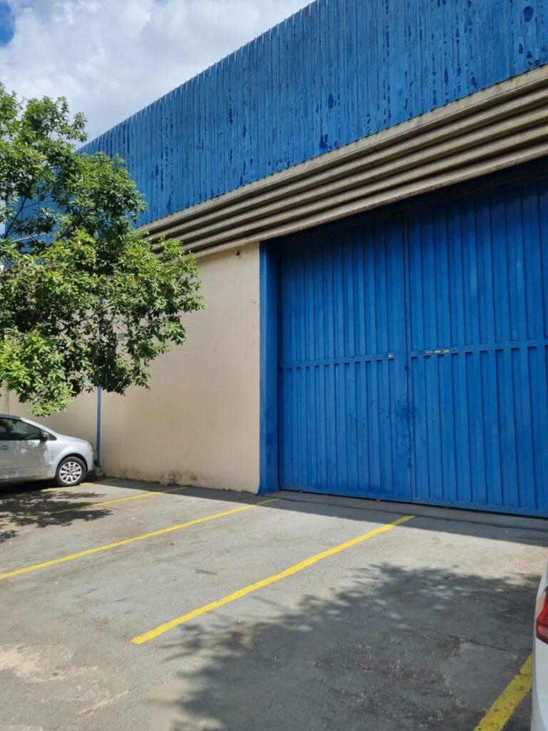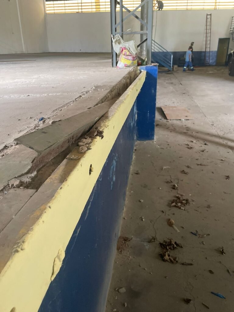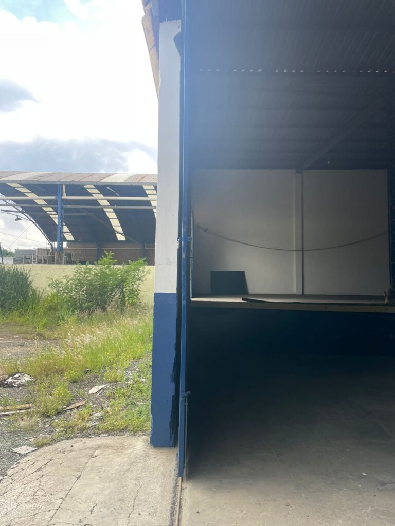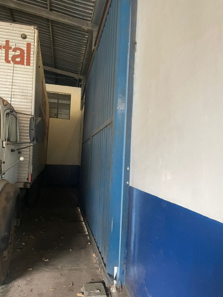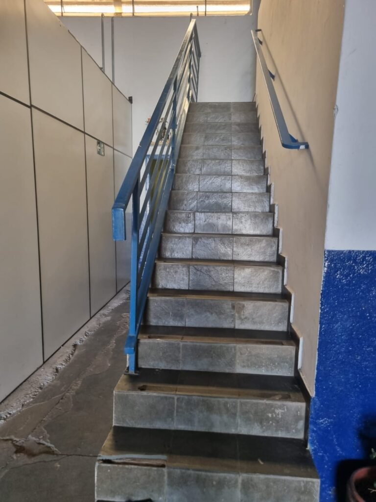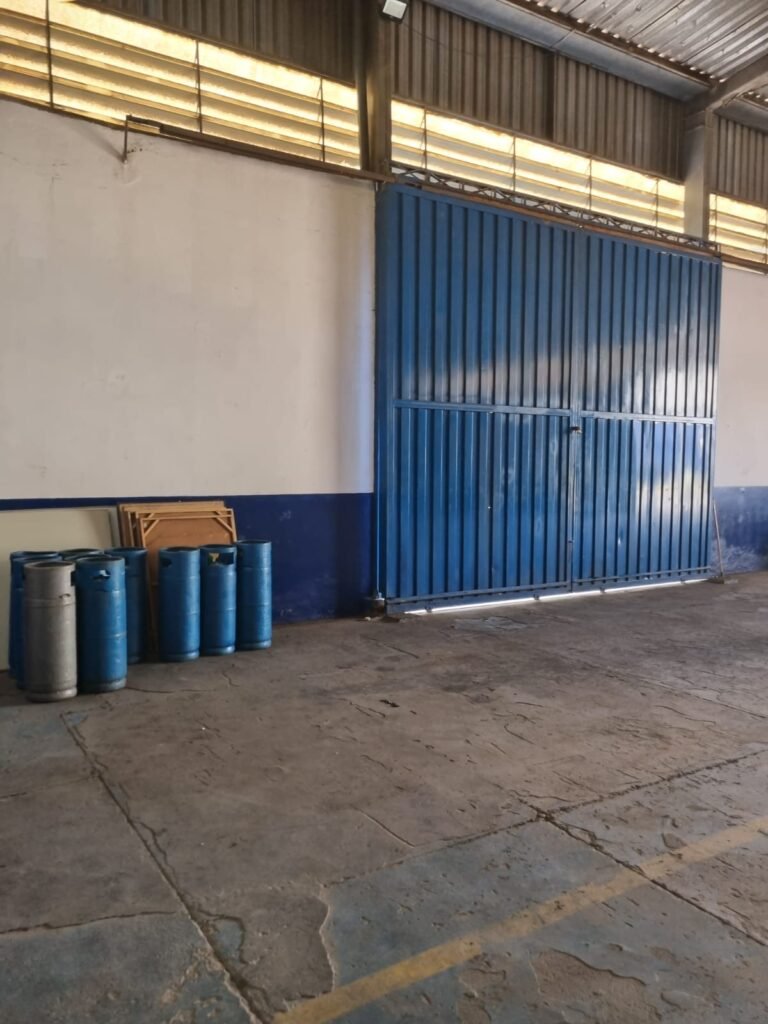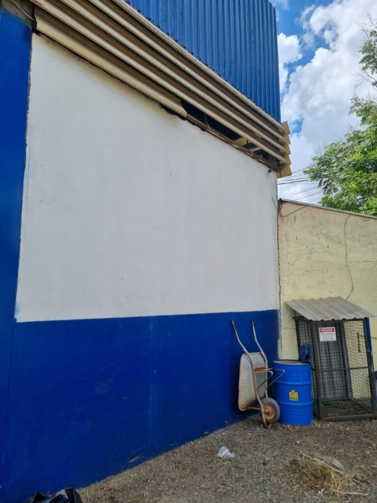 GALPÃO:- Piso concreto desempenado com pintura com tinta piso na cor grafite descascando, paredes e muros externos com pintura barrado na cor azul e restante da parede na cor branco neve em ordem, fechamento com venezianas industrial de policarbonato em ordem, telhado estrutura de ferro e telhas de zinco em ordem, 03 portões deslizantes com chapas trilhos e roldanas em ordem, 03 lustres em ordem, 02 escadas sendo 01 de alvenaria com degraus revestidos de pedra ardósia trincada em alguns degraus com corrimão e guarda corpo pintura na cor azul e 01 de chapa xadrez com corrimão e guarda corpo na cor azul, caixa de disjuntores em ordem, 01 ralo com tampa quebrada.