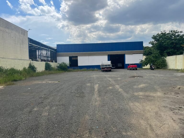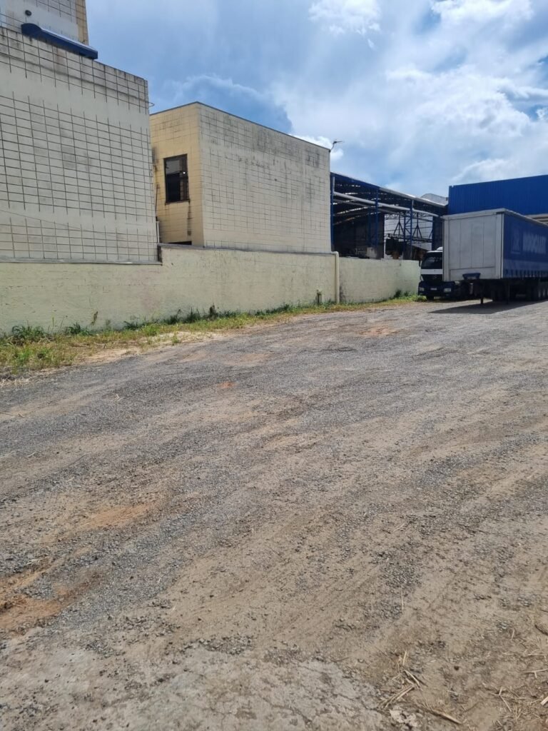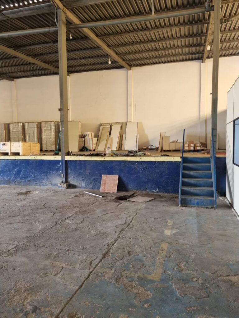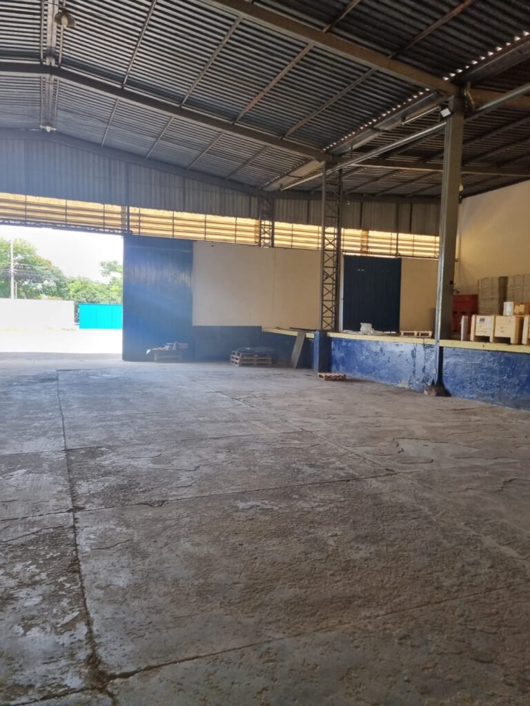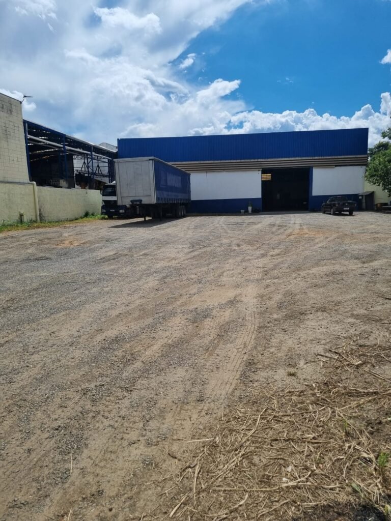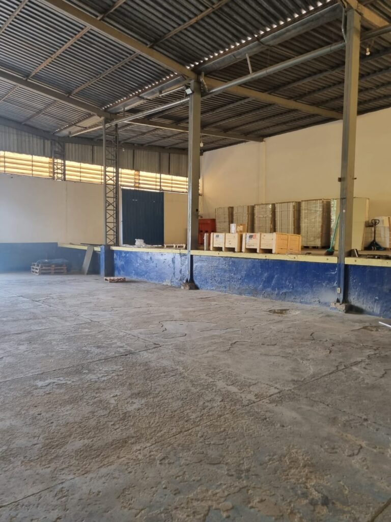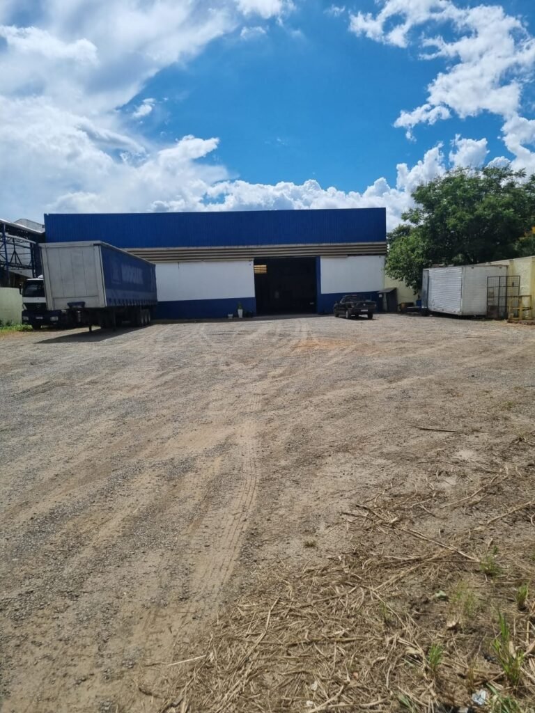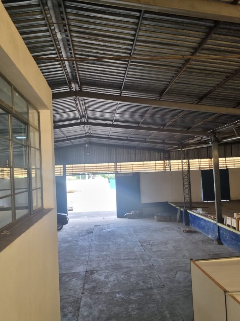 GALPÃO:- Piso concreto desempenado com pintura com tinta piso na cor grafite descascando, paredes e muros externos com pintura barrado na cor azul e restante da parede na cor branco neve em ordem, fechamento com venezianas industrial de policarbonato em ordem, telhado estrutura de ferro e telhas de zinco em ordem, 03 portões deslizantes com chapas trilhos e roldanas em ordem, 03 lustres em ordem, 02 escadas sendo 01 de alvenaria com degraus revestidos de pedra ardósia trincada em alguns degraus com corrimão e guarda corpo pintura na cor azul e 01 de chapa xadrez com corrimão e guarda corpo na cor azul, caixa de disjuntores em ordem, 01 ralo com tampa quebrada.