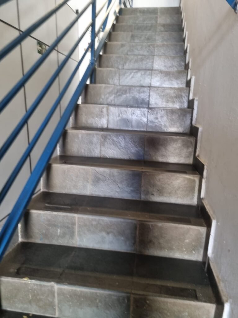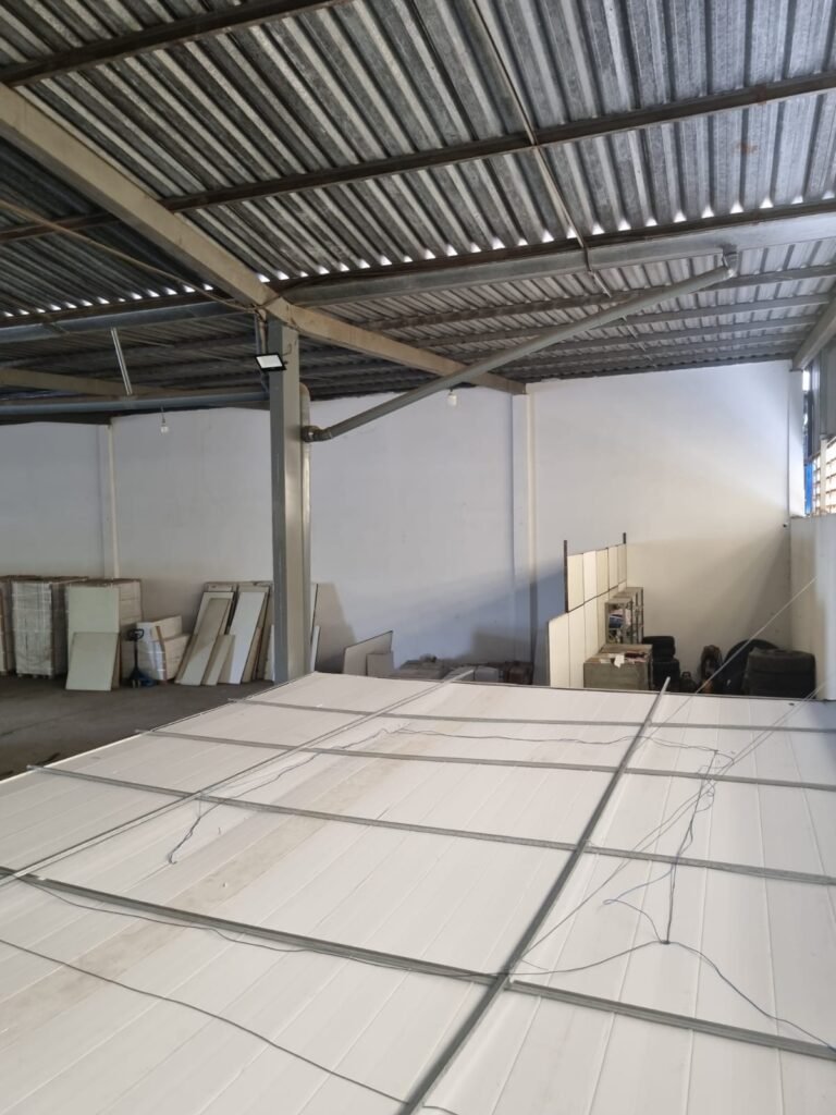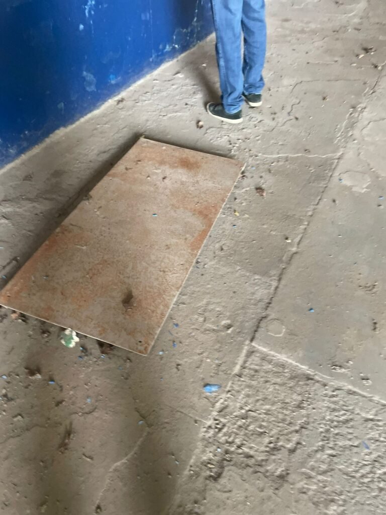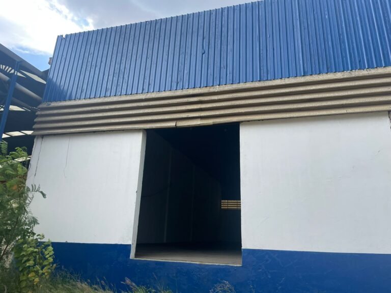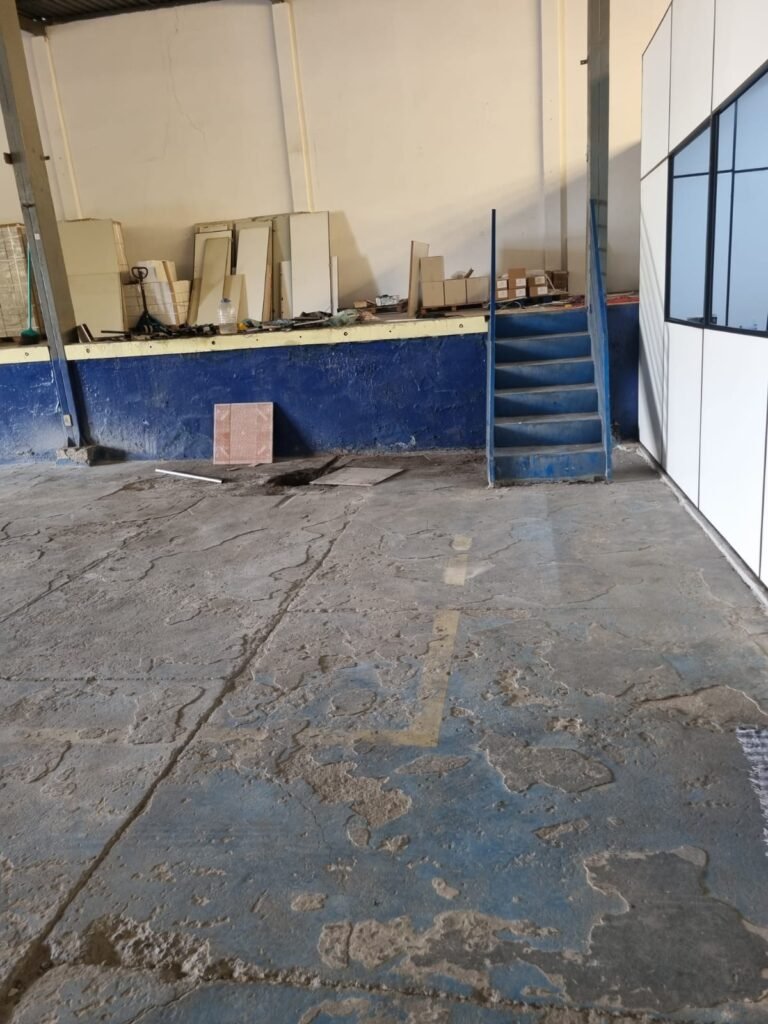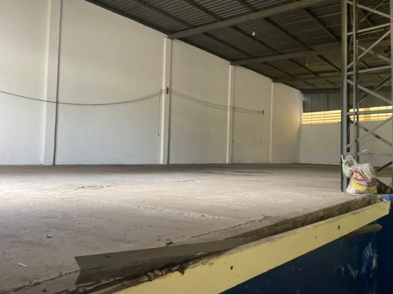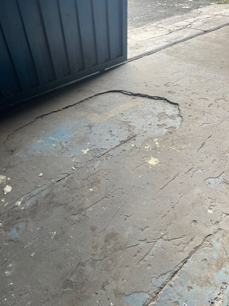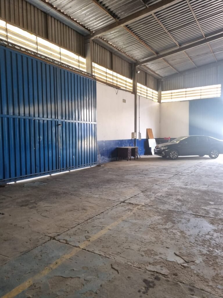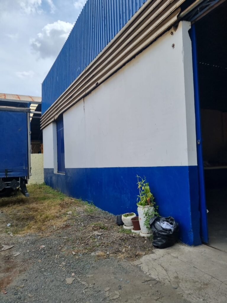 GALPÃO:- Piso concreto desempenado com pintura com tinta piso na cor grafite descascando, paredes e muros externos com pintura barrado na cor azul e restante da parede na cor branco neve em ordem, fechamento com venezianas industrial de policarbonato em ordem, telhado estrutura de ferro e telhas de zinco em ordem, 03 portões deslizantes com chapas trilhos e roldanas em ordem, 03 lustres em ordem, 02 escadas sendo 01 de alvenaria com degraus revestidos de pedra ardósia trincada em alguns degraus com corrimão e guarda corpo pintura na cor azul e 01 de chapa xadrez com corrimão e guarda corpo na cor azul, caixa de disjuntores em ordem, 01 ralo com tampa quebrada.