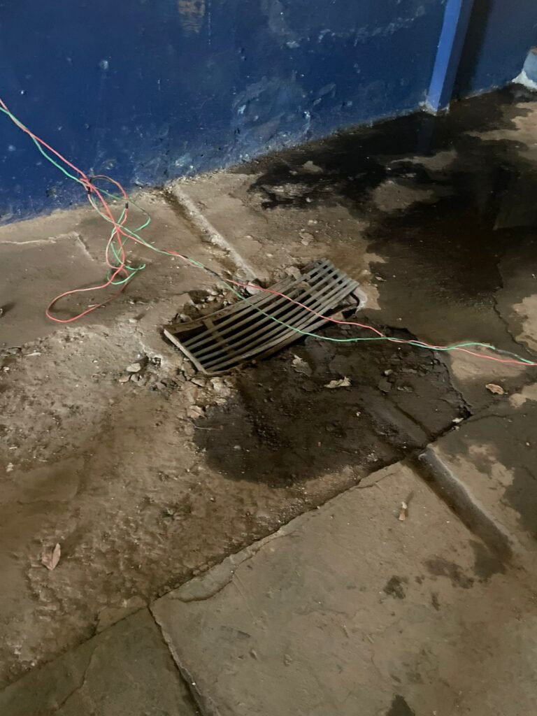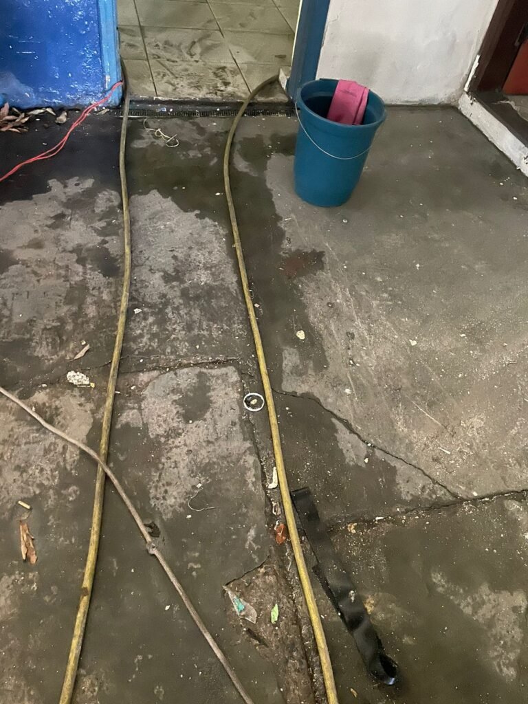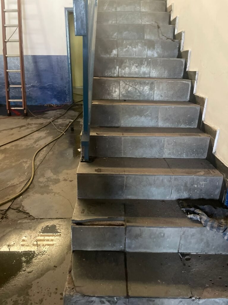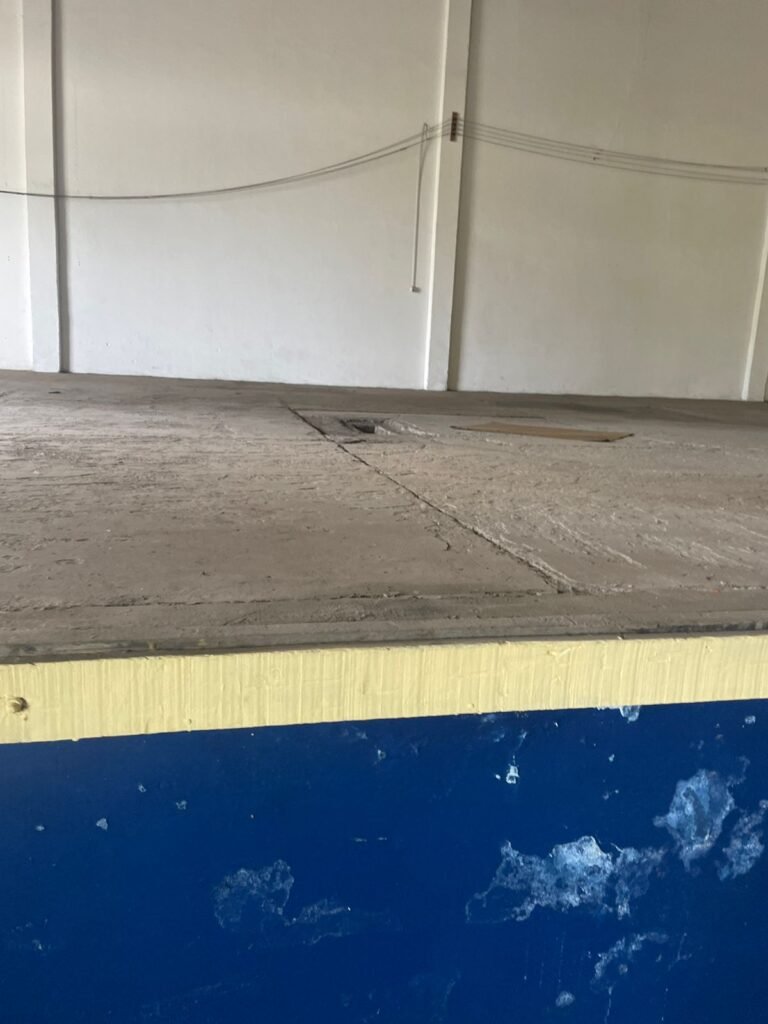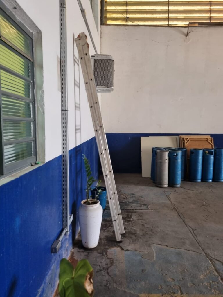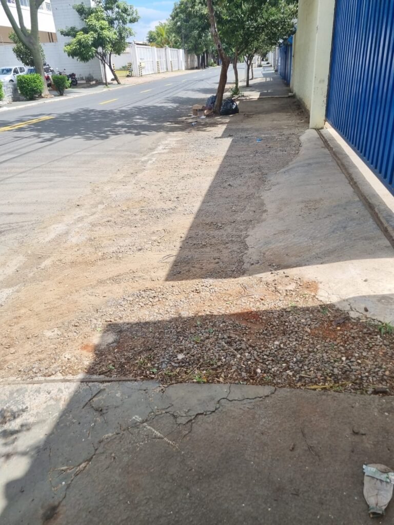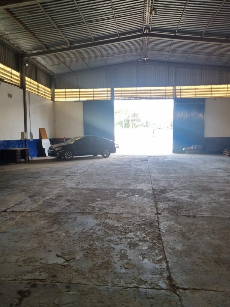 GALPÃO:- Piso concreto desempenado com pintura com tinta piso na cor grafite descascando, paredes e muros externos com pintura barrado na cor azul e restante da parede na cor branco neve em ordem, fechamento com venezianas industrial de policarbonato em ordem, telhado estrutura de ferro e telhas de zinco em ordem, 03 portões deslizantes com chapas trilhos e roldanas em ordem, 03 lustres em ordem, 02 escadas sendo 01 de alvenaria com degraus revestidos de pedra ardósia trincada em alguns degraus com corrimão e guarda corpo pintura na cor azul e 01 de chapa xadrez com corrimão e guarda corpo na cor azul, caixa de disjuntores em ordem, 01 ralo com tampa quebrada.