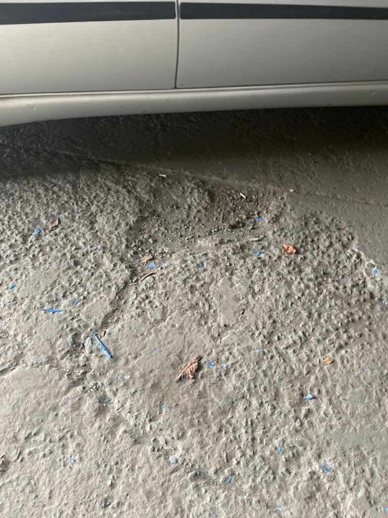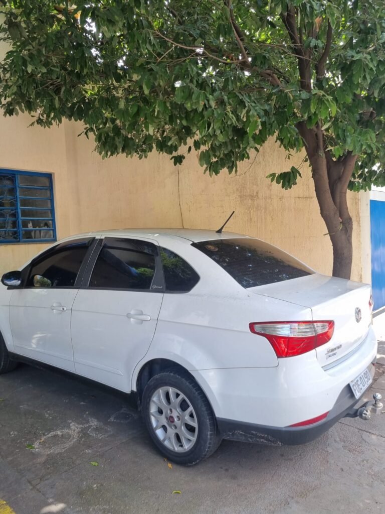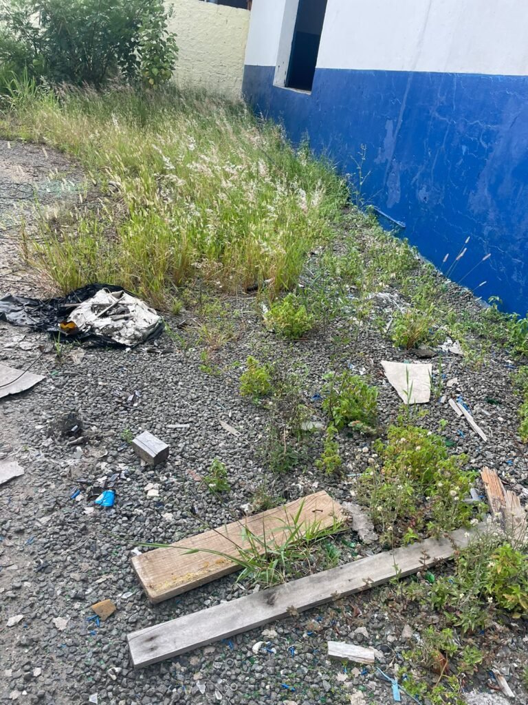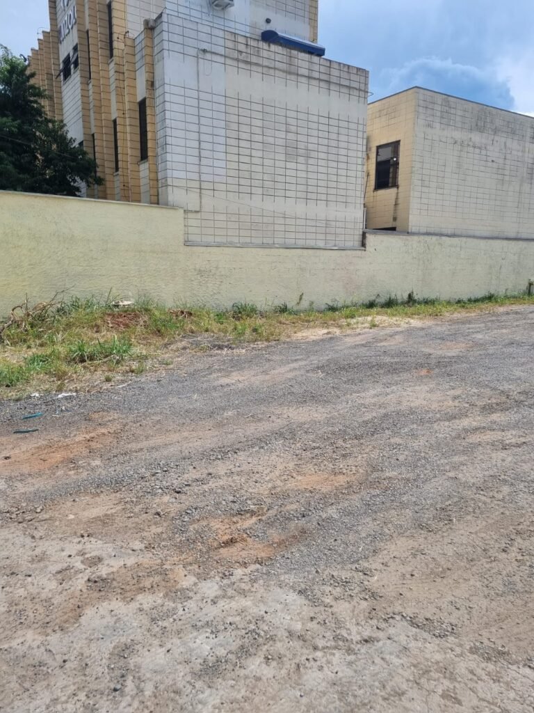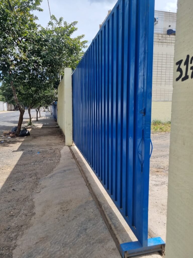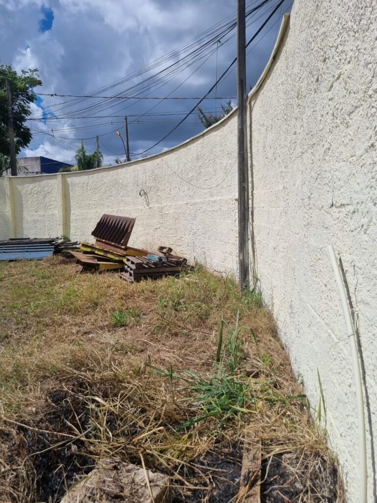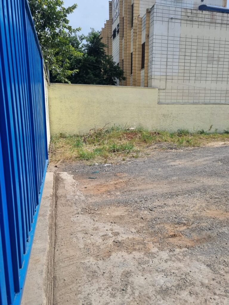 PATIO:- Piso com pedra de brita com grama não aparada em algumas partes restante em ordem, muros de blocos com chapisco com pintura nova em ordem, rufos em ordem, portão deslizante para entrada de caminhões com pintura nova na cor azul em ordem.