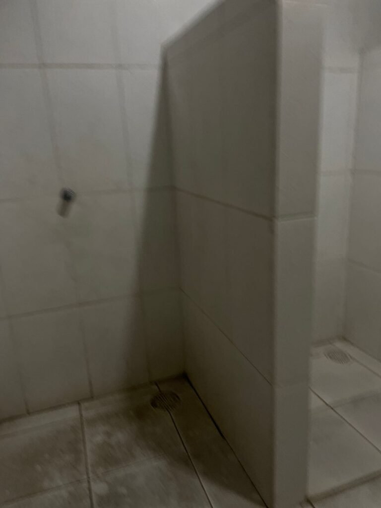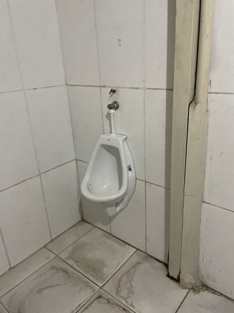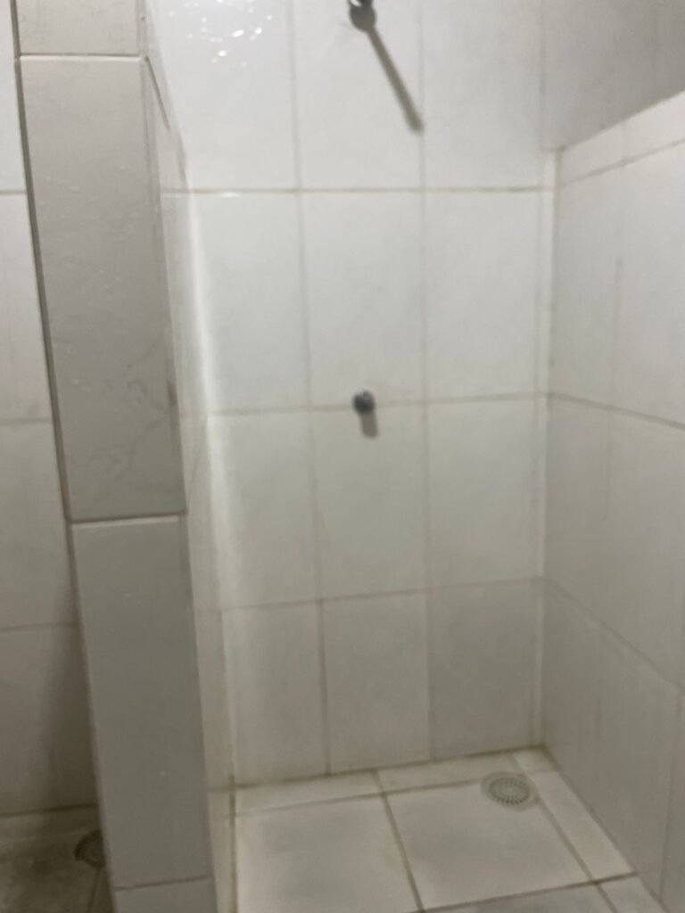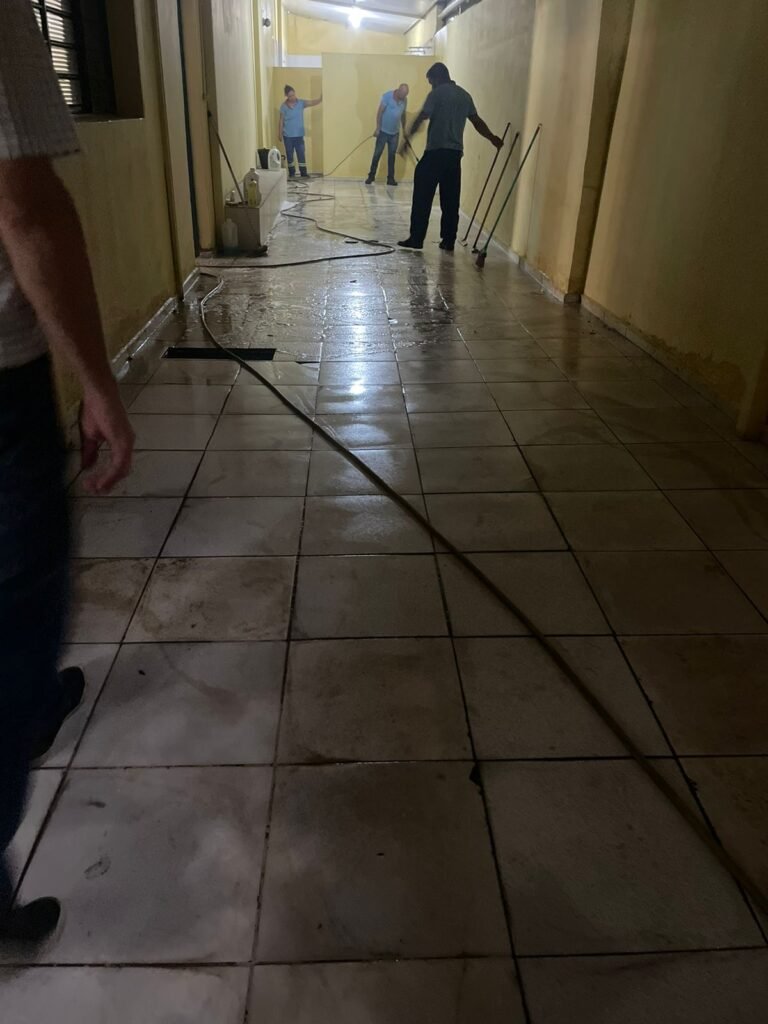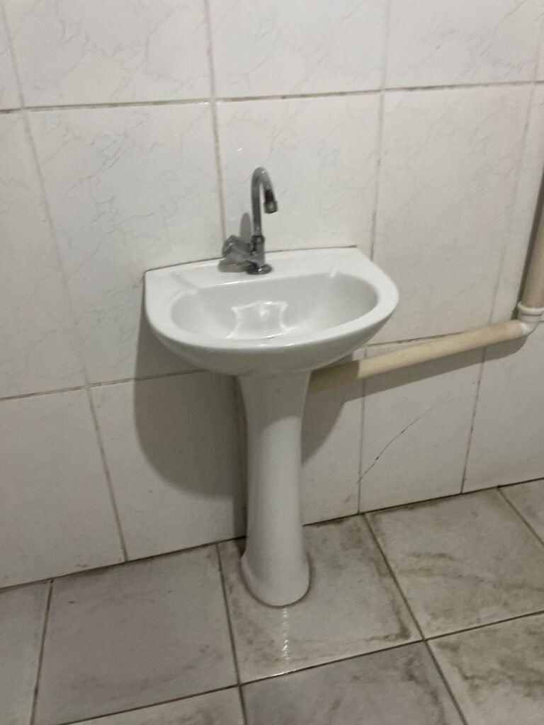 VESTIÁRIO:- Piso frio cerâmico em ordem, 04 ralos com tampa e desentupidos em ordem, paredes com azulejo 1/3 da parede em ordem, teto forro de PVC na cor branco em ordem, 04 boxe para chuveiro, 04 pontos para chuveiro, 02 conjunto lavatórios e colunas cerâmicas brancas em ordem, 02 torneiras bica móvel em ordem, 01 mictório cerâmica branca em ordem, 03 pontos de luz com spot e lâmpadas em ordem, 03 Box com conjunto vaso sanitário e caixa de descarga acoplada em ordem, 03 portas de madeira envernizadas em ordem.