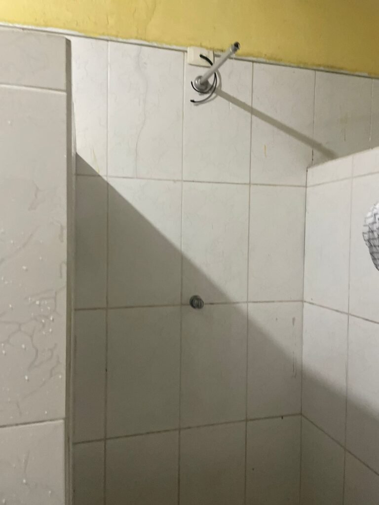 BANHEIRO:- Piso frio cerâmico em ordem, azulejo ate o teto com buracos com bucha restante em ordem, teto e gola de gesso com pintura na cor branco neve em ordem, 01 ponto de luz com spot com spot e lâmpada em ordem, porta de madeira envernizada em ordem, maçanetas em ordem, fechadura e chave fixa em ordem, vitrô basculante em ordem, 06 vidros em ordem, válvula de descarga hydra em ordem, vaso sanitário cerâmica branca topázio em ordem, conjunto de lavatório e coluna cerâmica branca em ordem, torneira em ordem, 01 interruptor em ordem, 01 tomada em ordem, sem chuveiro.