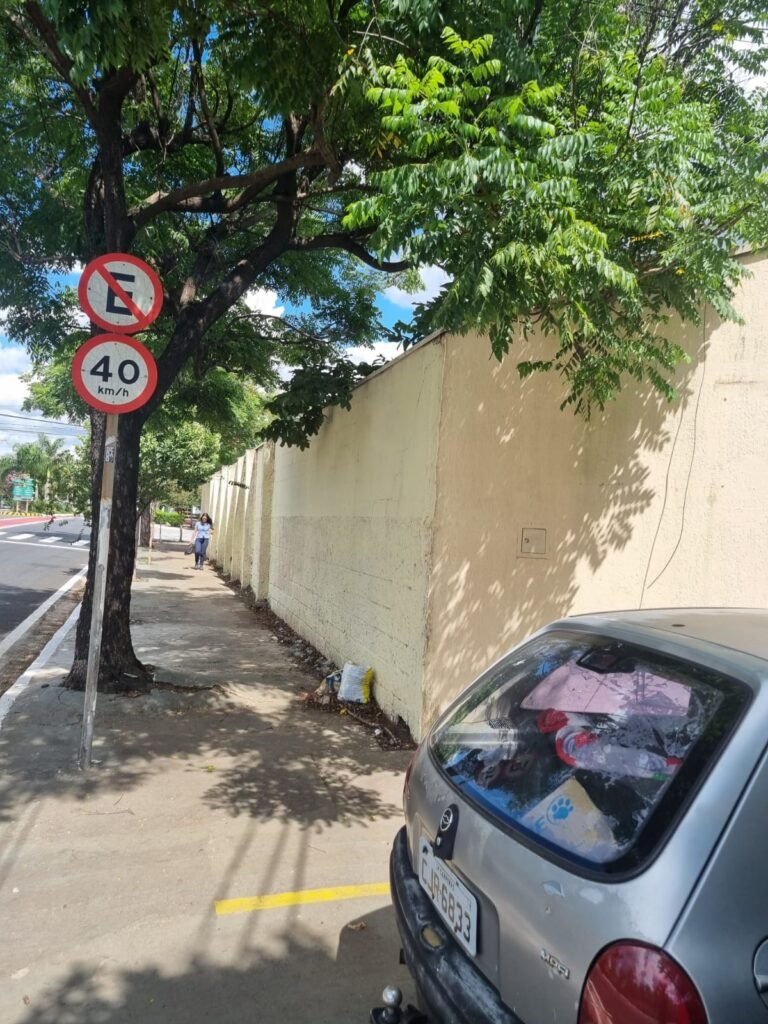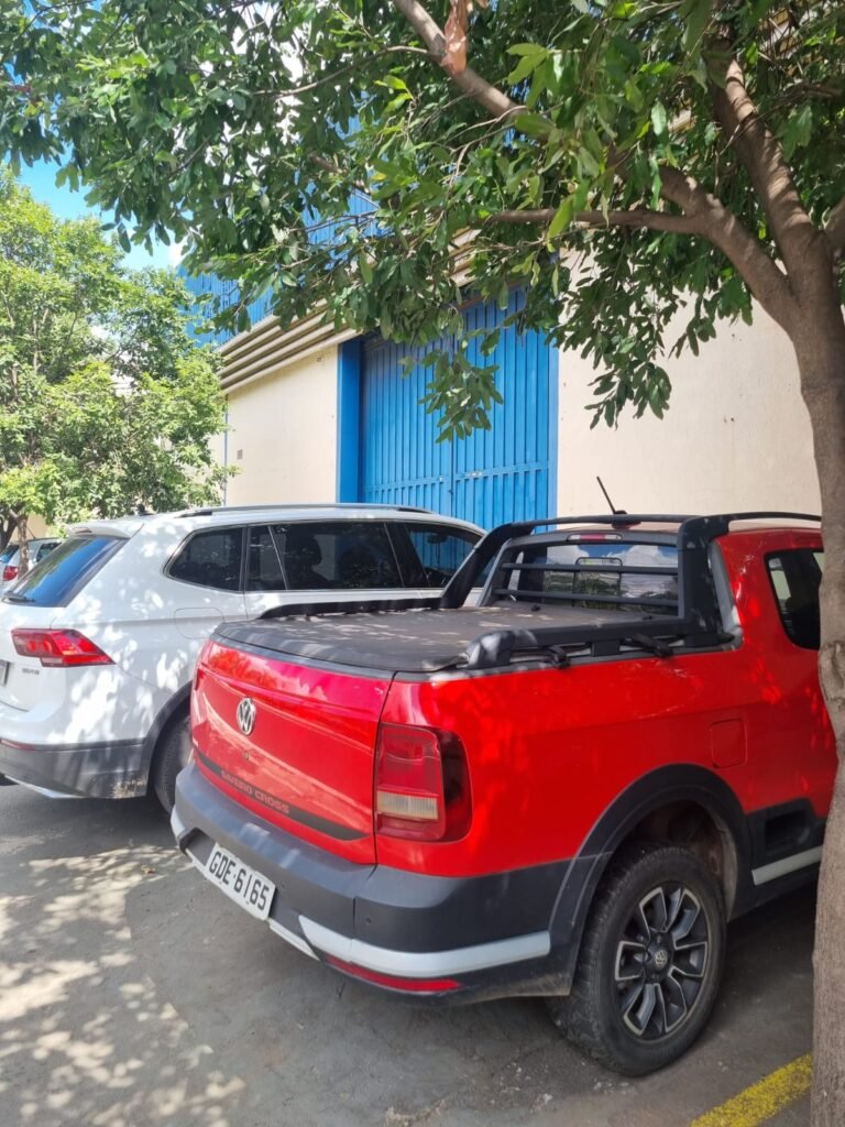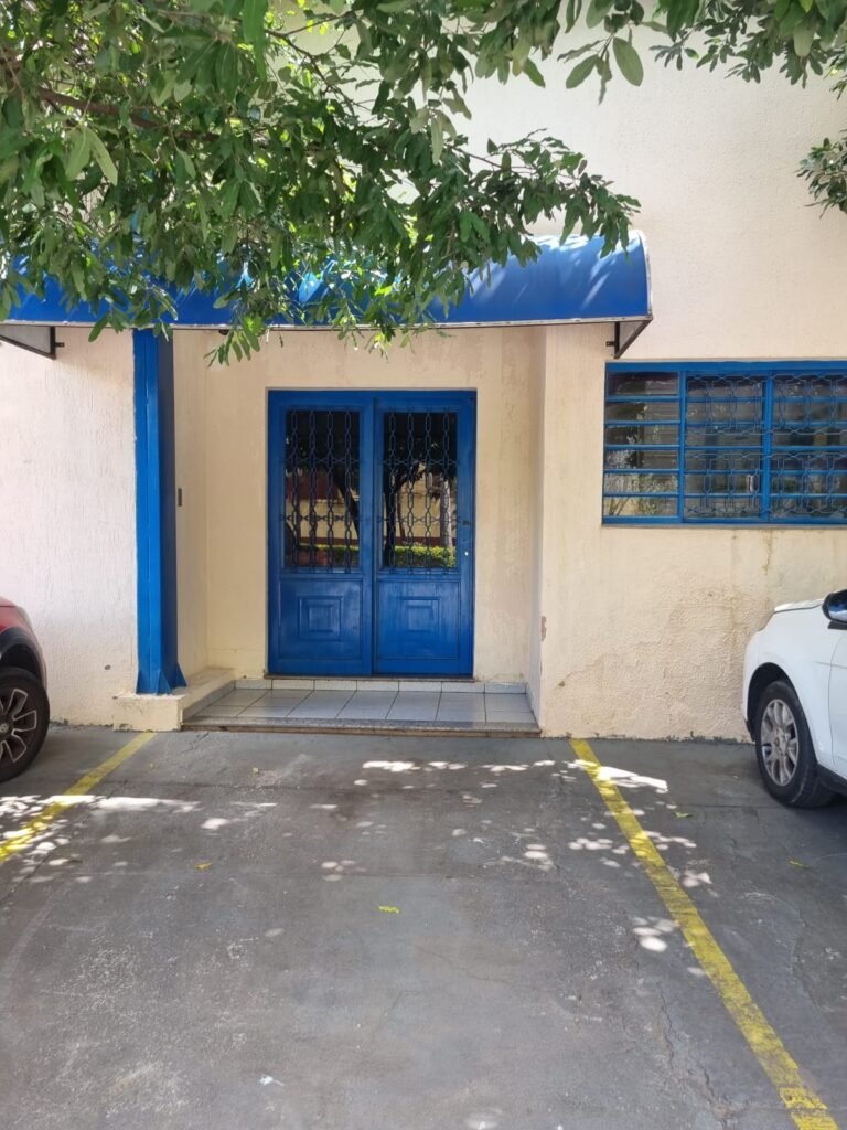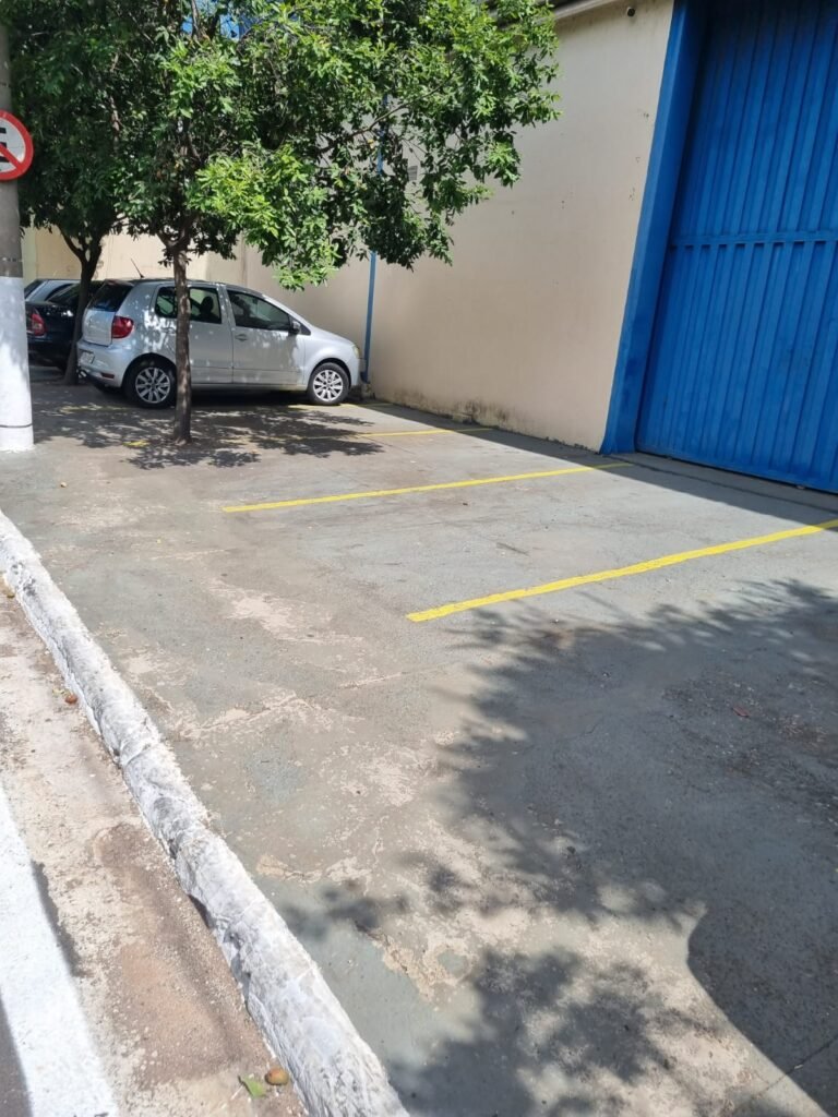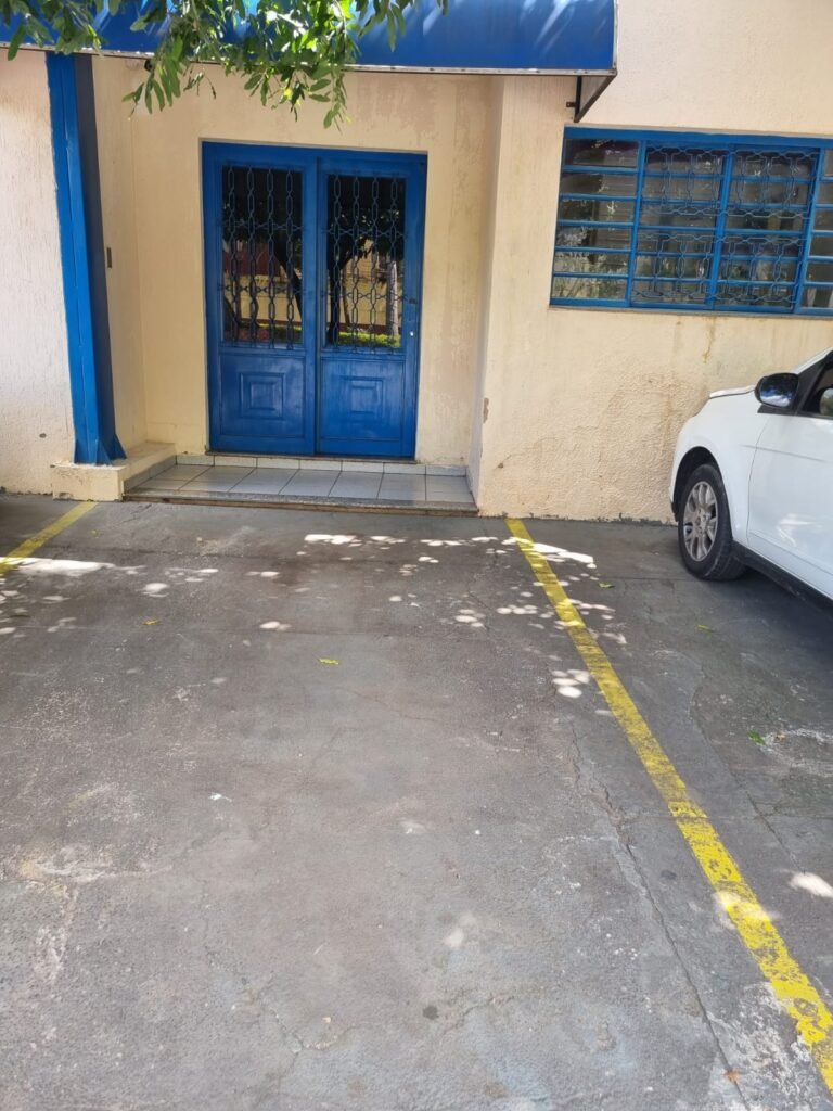 FACHADA:- Paredes e muros com pintura nova em ordem, fechamento tipo veneziana industrial limpos em ordem, telha com pintura nova na cor azul em ordem, toldo novo sobre a porta da recepção em rodem, calçada com vagas de veículos de passeio demarcadas, padrão de luz e água em ordem.