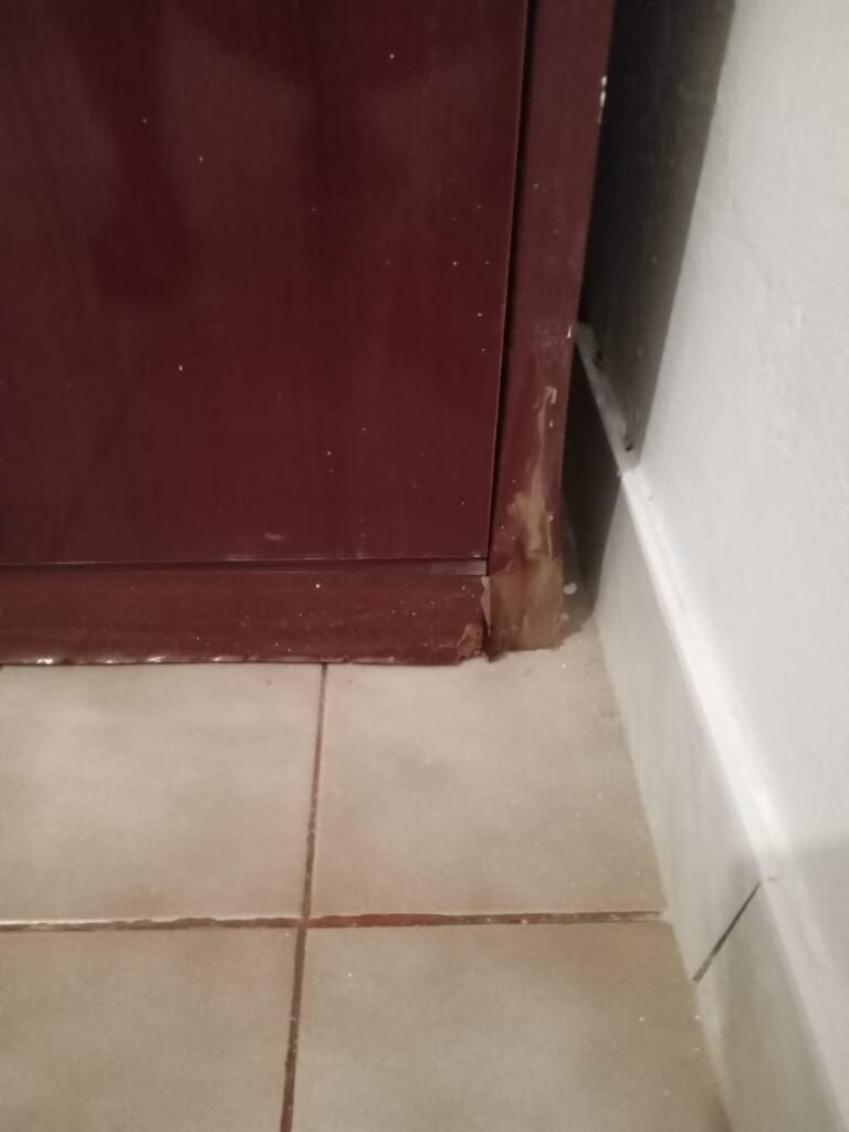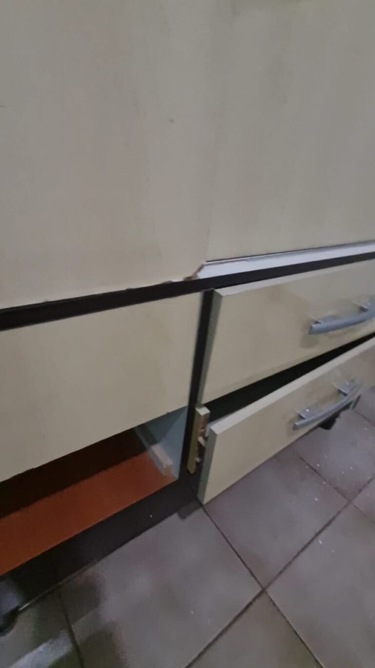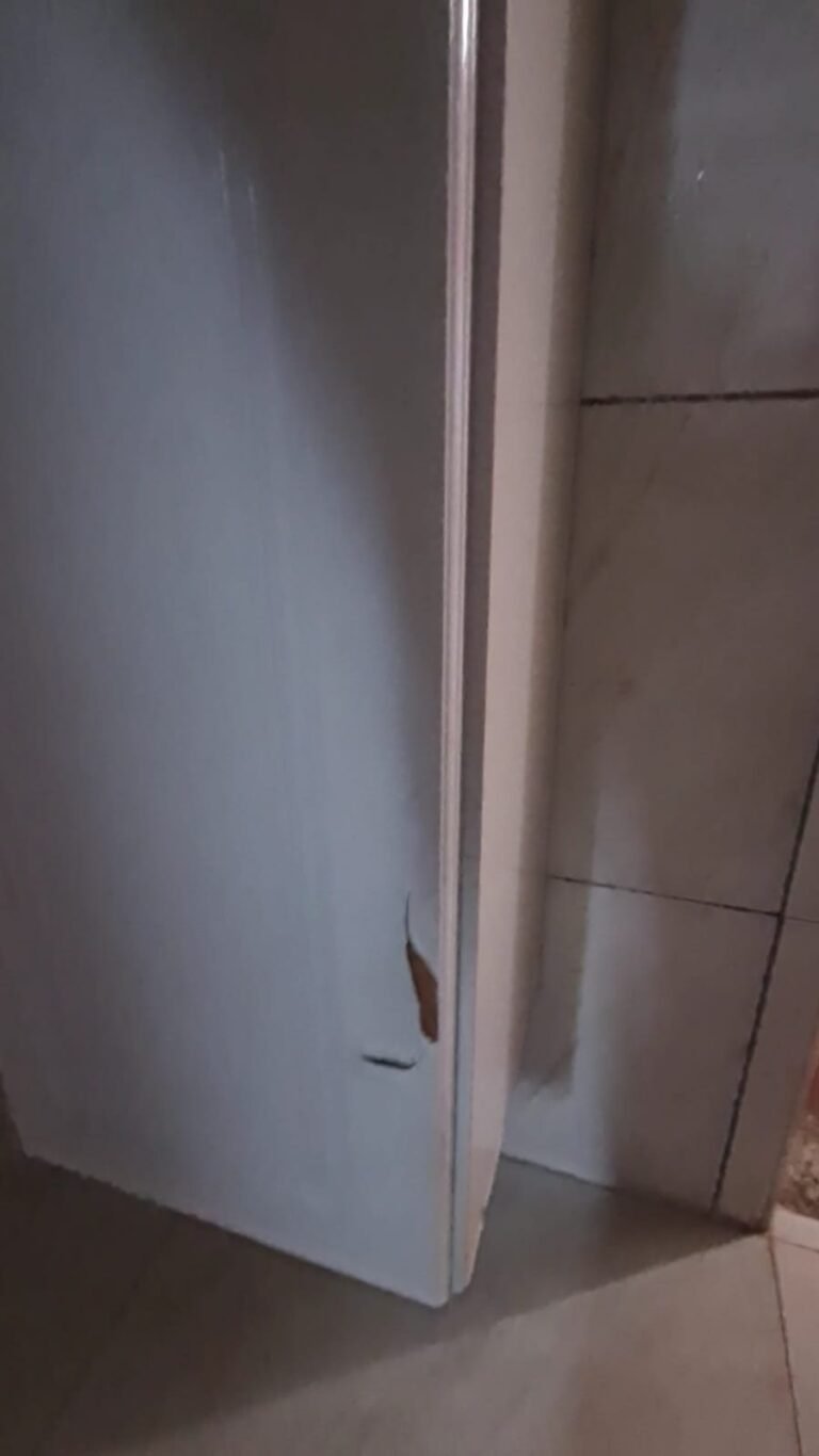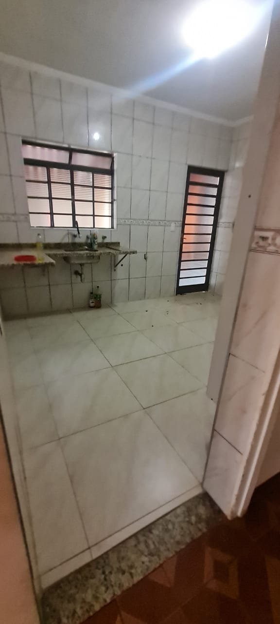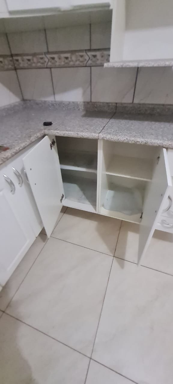 Cozinha:- Fechadura da porta quebrada sem miolo da parte de dentro, maçaneta solta, sem a chave da porta, teto sujo com manchas falta pintura, 02 porta do armário descascando, armário sujo, lâmpada da cozinha queimada.
