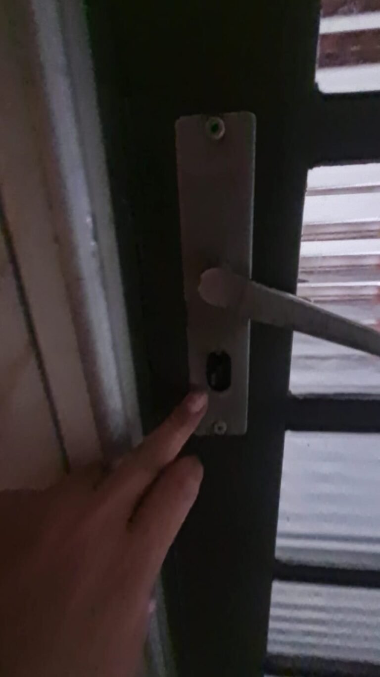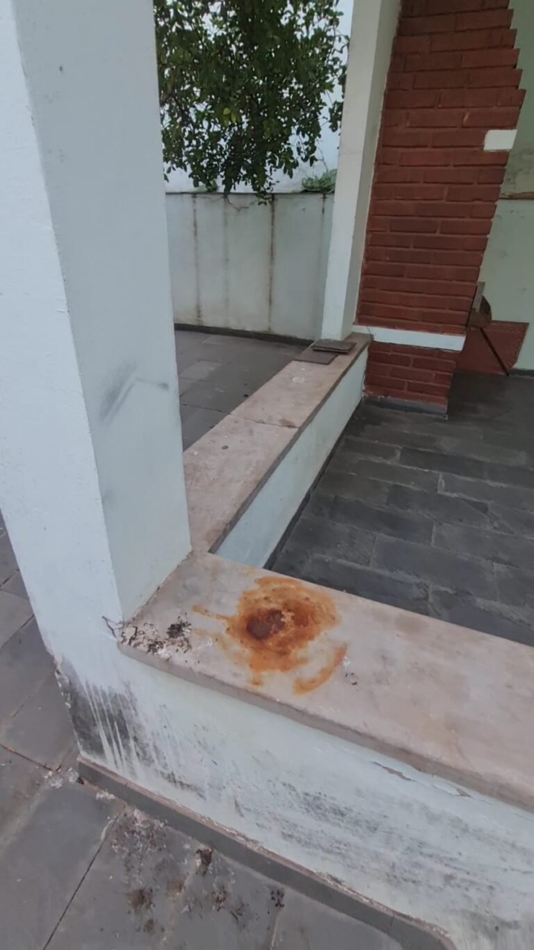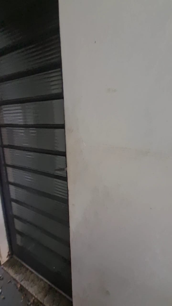 Fachada:- Cadeado do portão social sem a Chave, pedras Miracema com manchas.