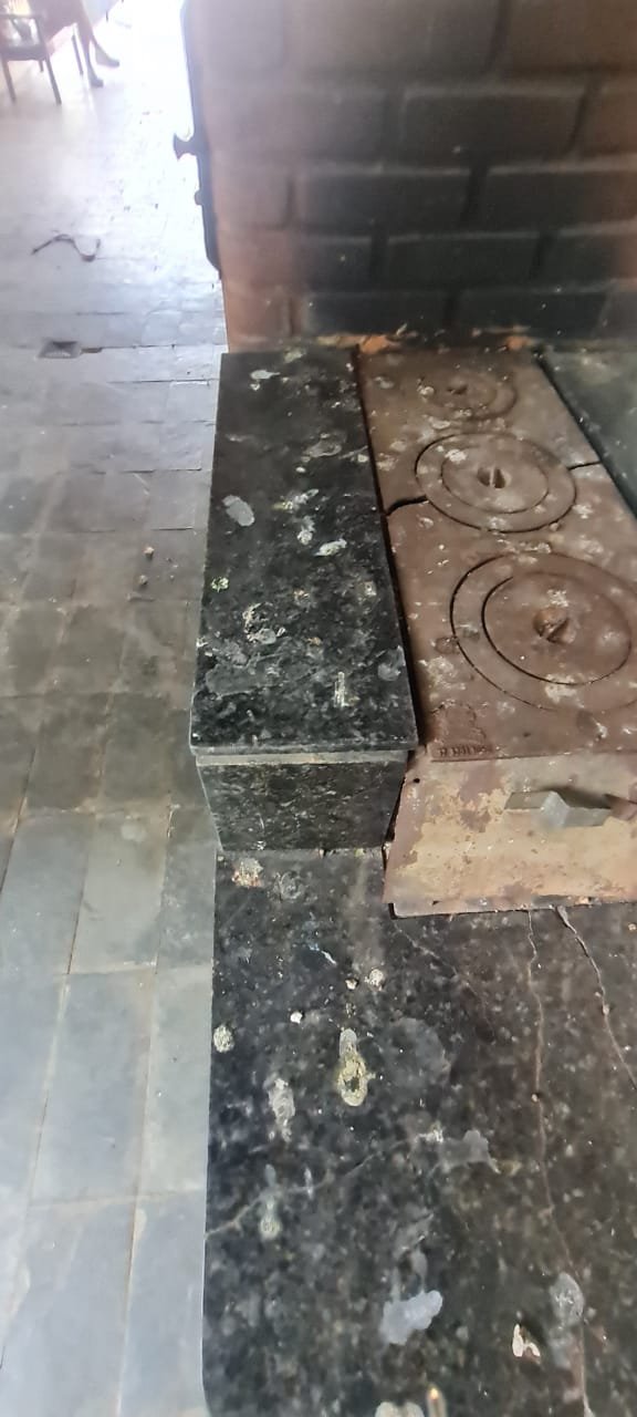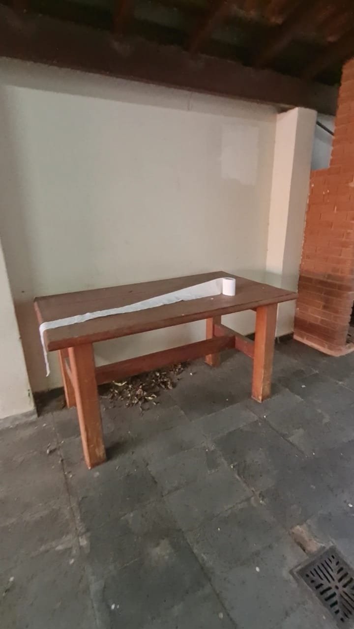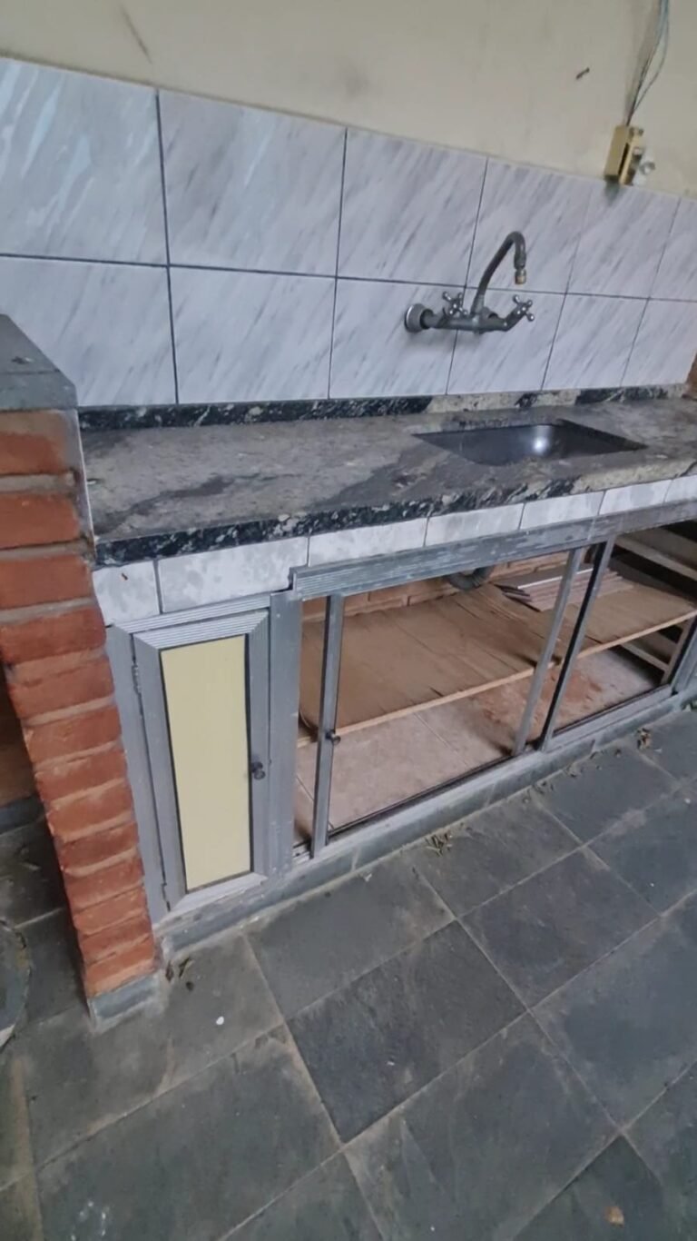Área de Lazer:- Paredes sujas faltando pintura, ambiente sujo, móvel branco para descarte quebrado, 02 suporte da lâmpada fluorescente sem a tampa, tanque cerâmico sujo e com uma trinca, gabinete da pia com as gavetas enroscando, 01 acabamento forno a lenha que n;ao fecha, uma pedra granito do fogão a lenha trincado, chapa quebrada, faltando vasos de planta.