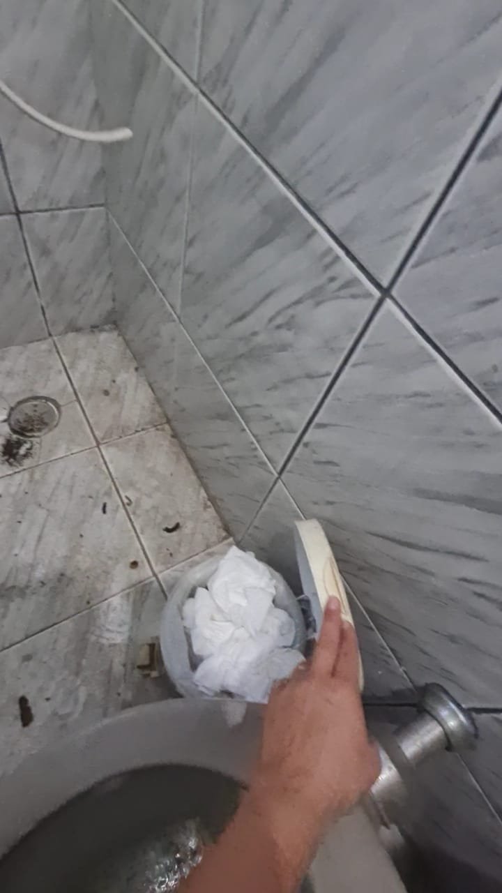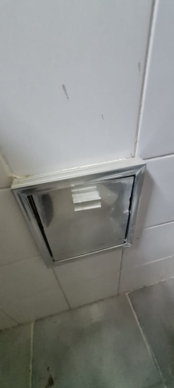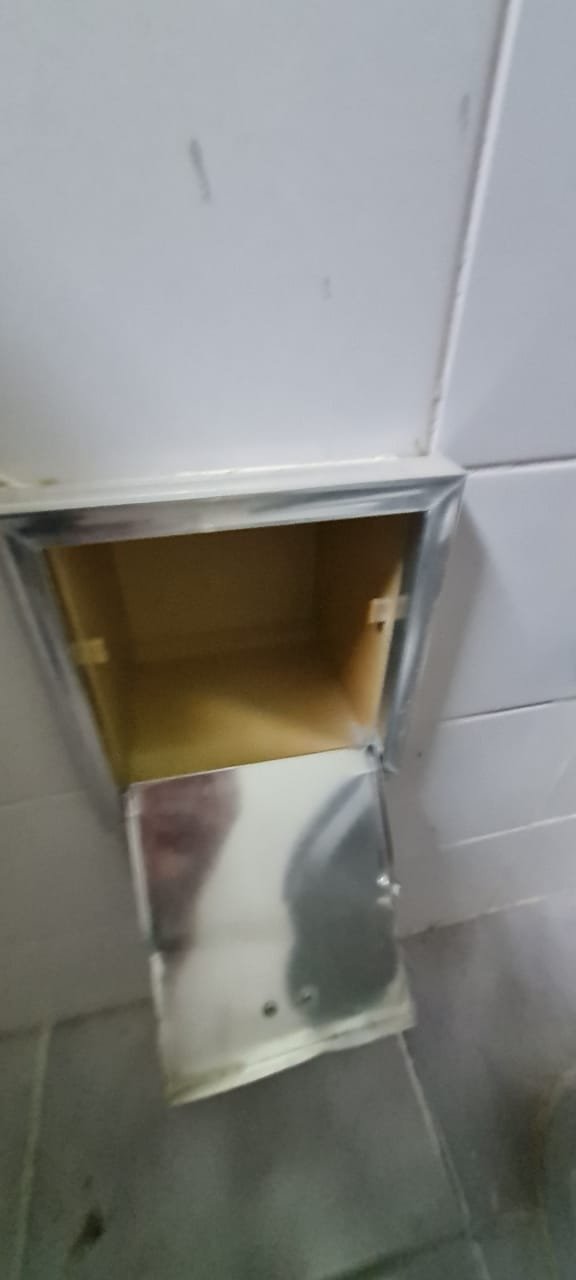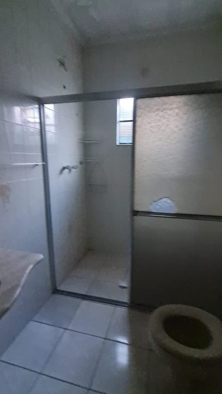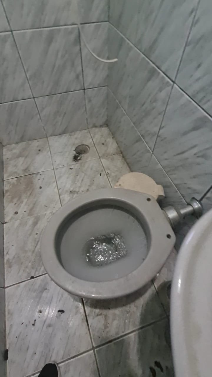 WC:- Teto sujo, armarinho do banheiro com uma porta quebrada, lâmpada queimada, Box de acrílico com uma folha quebrada, banheiro sujo com sabonete e cabelos no chão.